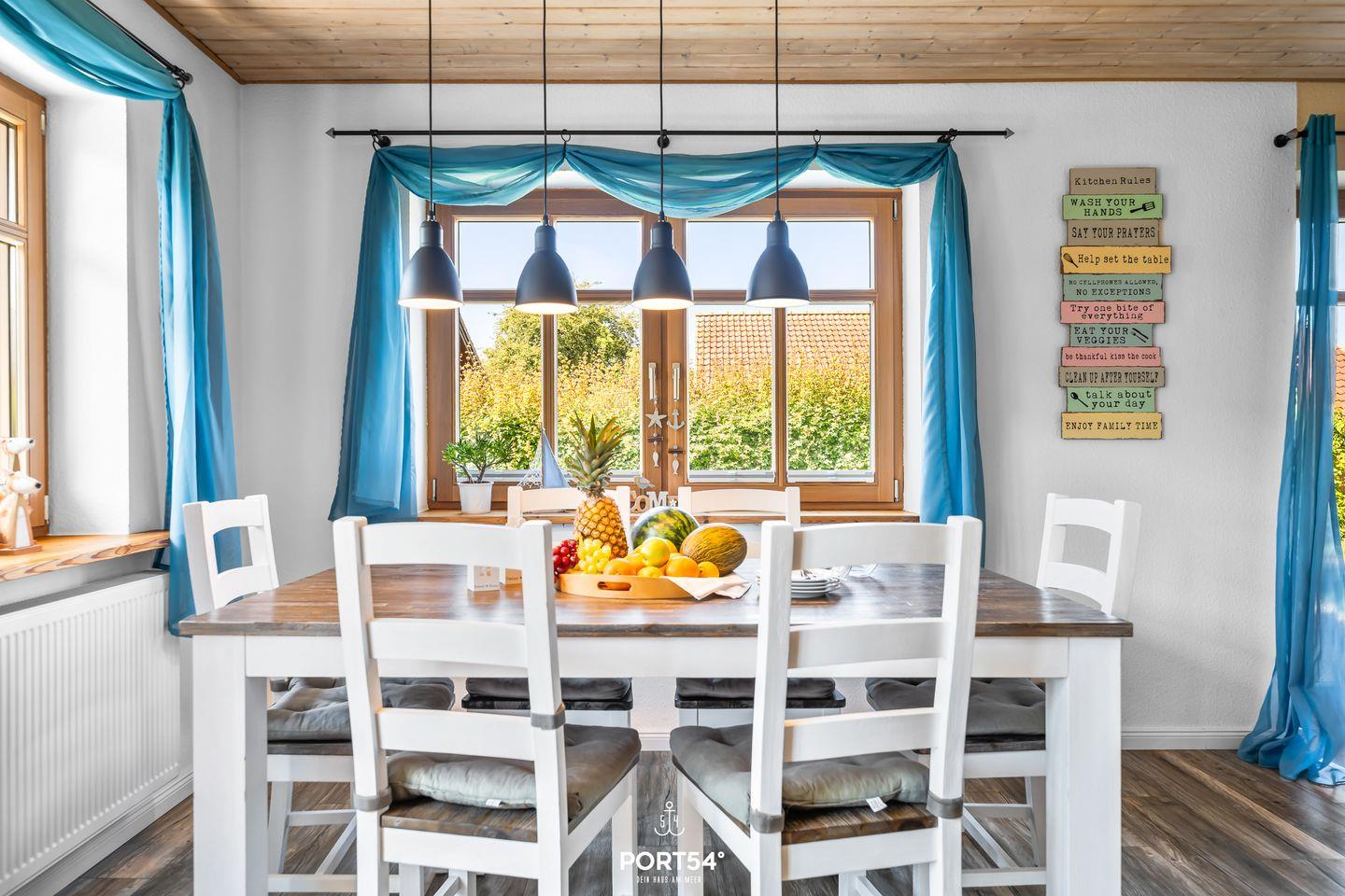 Angrenzend befindet sich die moderne Küche, die dank Espressomaschine und vielen weiteren Geräten hervorragend ausgestattet ist. Hier kannst Du nicht nur kulinarische Köstlichkeiten zaubern, sondern dabei auch den herrlichen Blick in den Garten genießen.