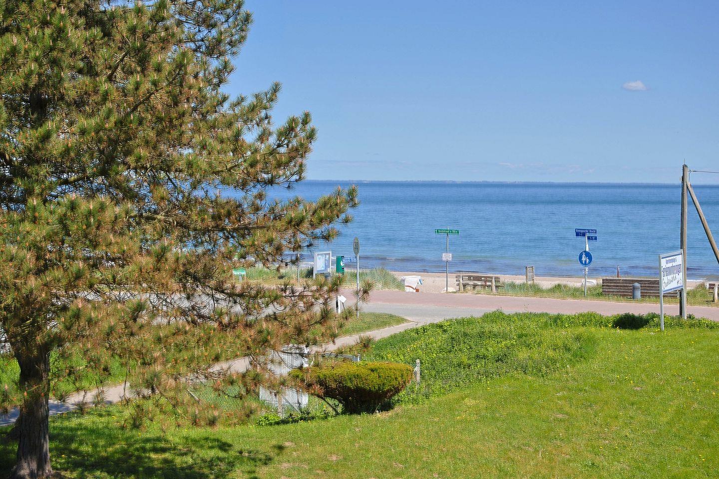 Zwischen dem Haus und dem feinsandigen Naturstrand liegt eine wenig befahrene Straße sowie der Ostseeküstenradweg von Lübeck nach Flensburg.