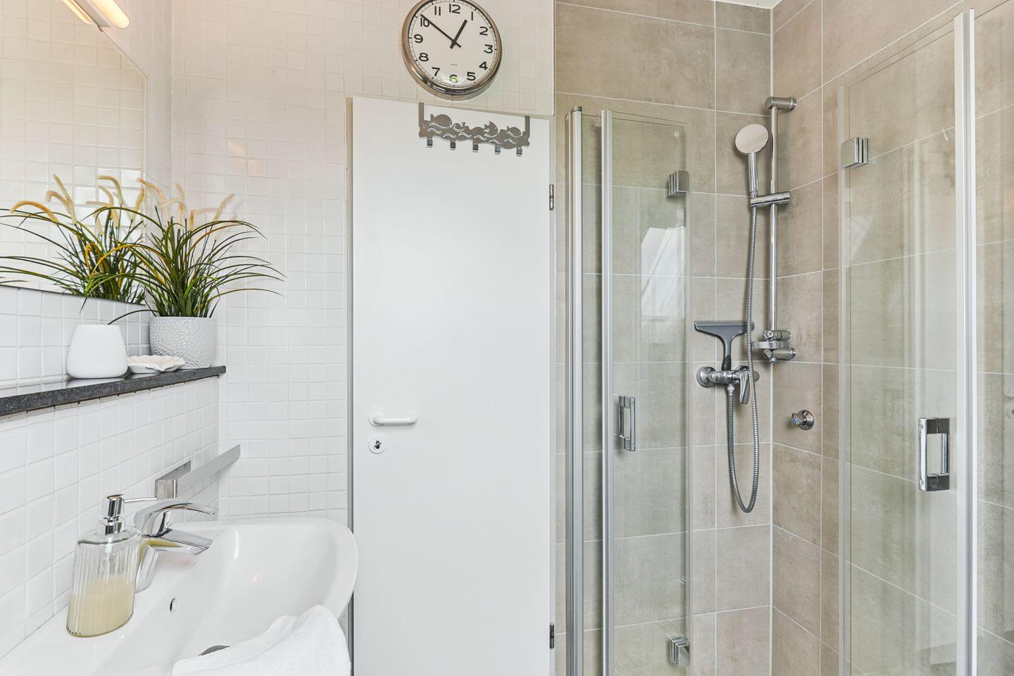 Das Badezimmer besticht durch eine bodengleiche Dusche, ein Waschbecken, einen Spiegel, einen Kosmetikspiegel, einen Haartrockner sowie ein Fenster für Tageslicht.