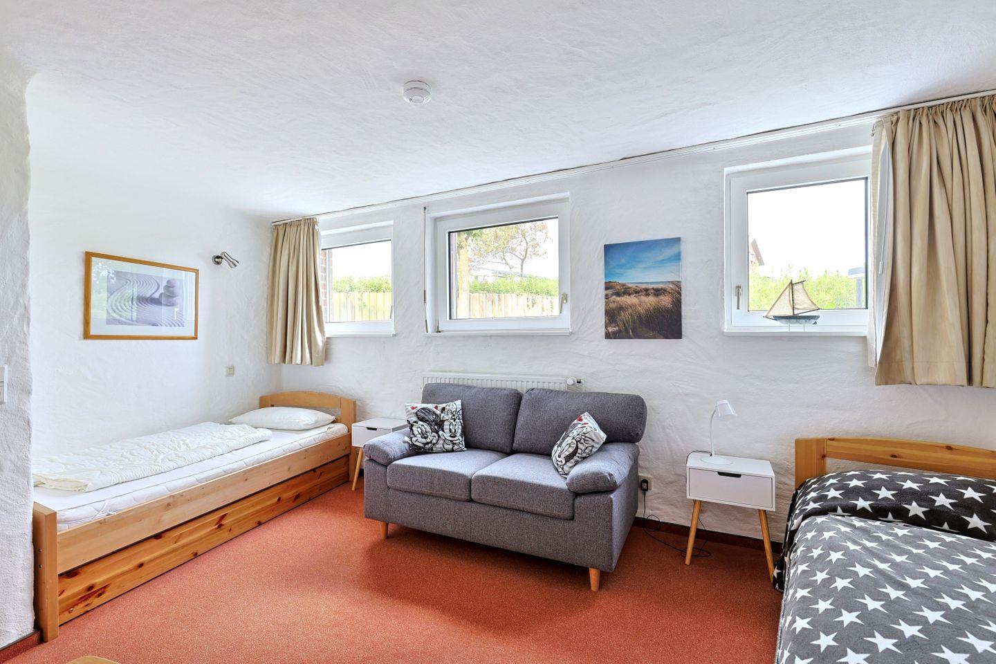 Das zweite Schlaf- bzw. Kinderzimmer verfügt über zwei gegenüberliegende Einzelbetten (90x200 cm) und befindet sich eine Treppe tiefer im Souterrain.