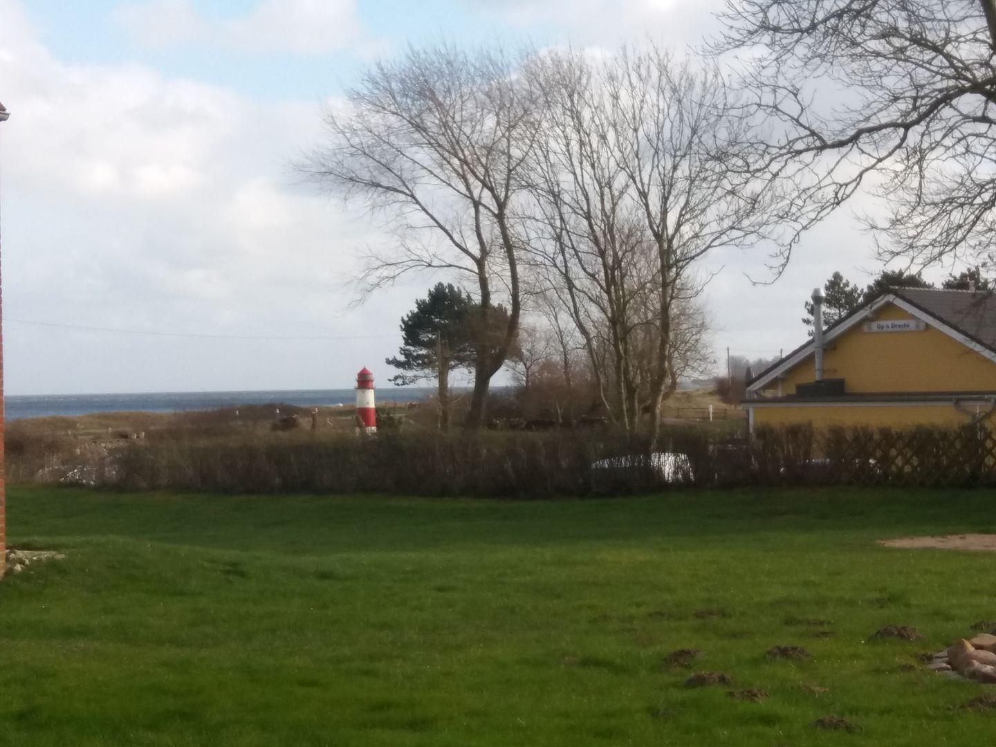 Von der angrenzenden Süd-Terrasse aus hast Du einen wunderschönen Ausblick auf den großen Garten und das Meer.