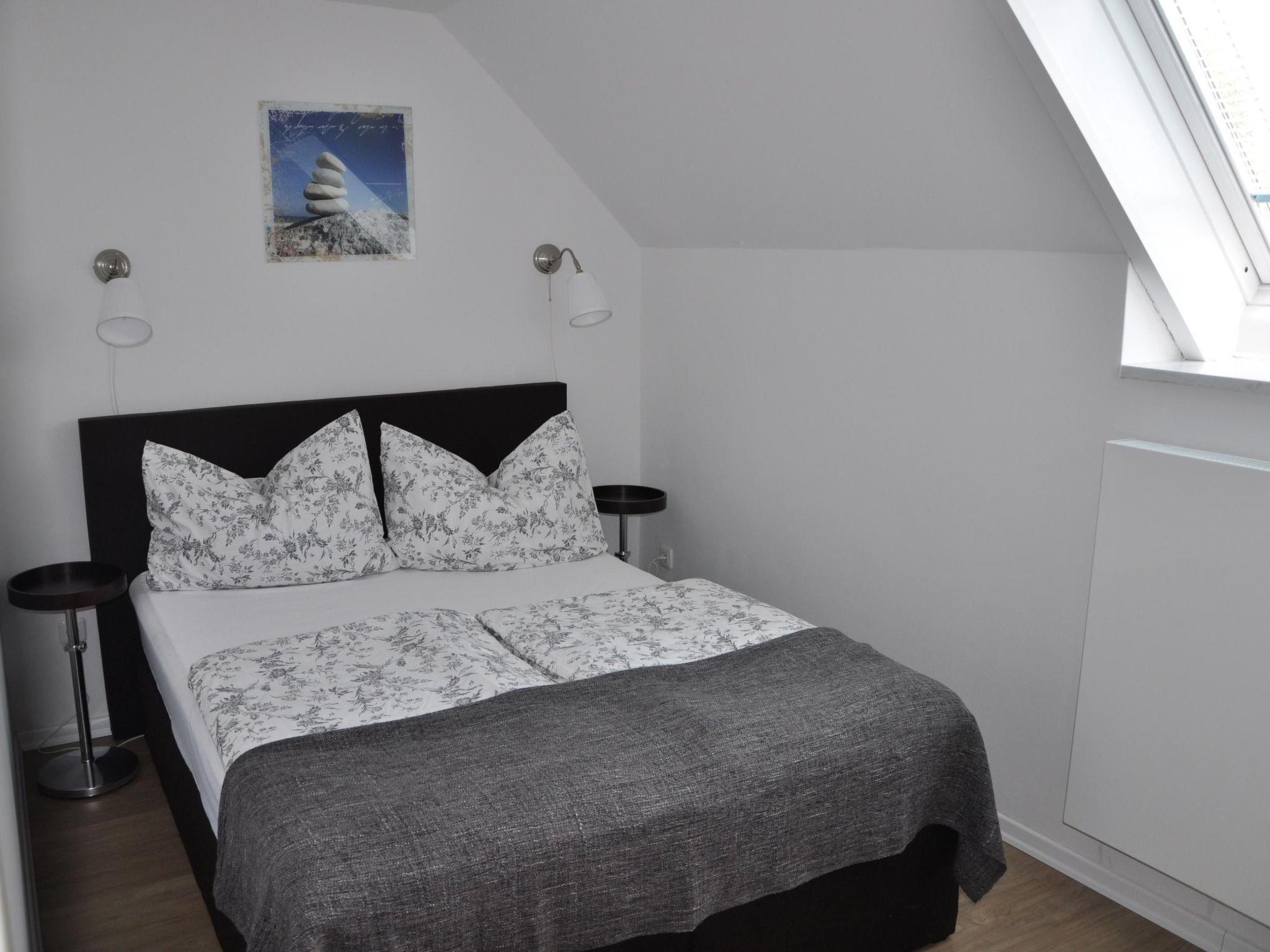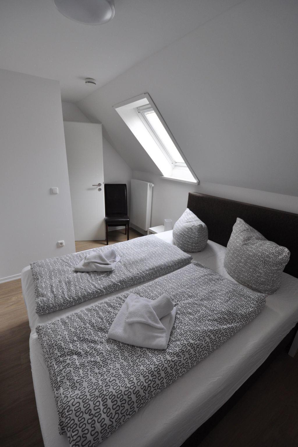 Die Maisonettewohnung hat eine Wohnfläche von circa 75 m² und ist für die Unterbringung von vier Erwachsenen hervorragend geeignet. Im Erdgeschoss erwartet Sie ein großer, kombinierter Wohn-und Küchenbereich mit einer gemütlichen Couchecke, einem modernen Essplatz für vier Personen und der komplett ausgestatteten Küche. Im oberen Stockwerk unter der Dachschräge befinden sich zwei Schlafzimmer. Tageslicht erhalten Sie durch die eingebauten Dachfenster. Im ersten Zimmer steht ein Boxspringbett mit 140 cm Breite und einer durchgehenden Matratze. Das andere Schlafzimmer verfügt ebenfalls über ein Boxspringbett, jedoch ist es 160 cm breit und hat eine geteilte Matratze von je 80 cm Breite. Außerdem gehört ein gut geschnittenes Badezimmer mit Dusche, WC und Tageslicht zur Wohnung. Alle Räume sind beheizbar.