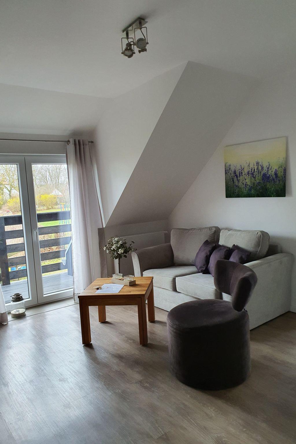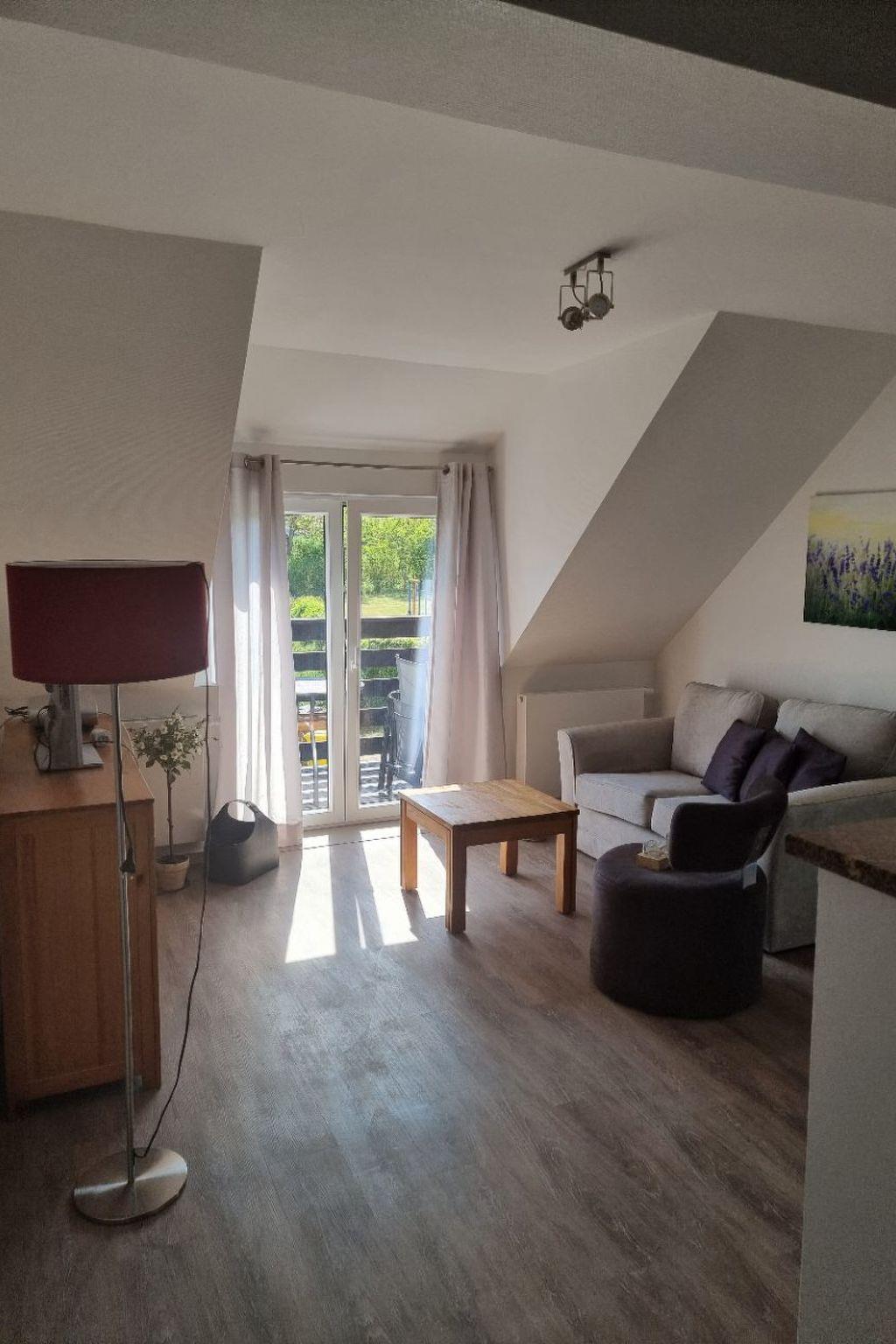 Die Ferienwohnung im ersten Obergeschoss hat eine Wohnfläche ca. 45 qm und ist für die Unterbringung von zwei Erwachsenen und einem Kleinkind hervorragend geeignet. Sie erwartet ein kombinierter Wohn- und Küchenbereich mit einer gemütlichen Couchecke. Im Schlafzimmer befindet sich ein 1,80 m breites Boxspringbett (durchgehende Matratze). Ein gut geschnittenes Badezimmer mit Dusche und WC sowie Tageslicht gehört auch zur Wohnung.