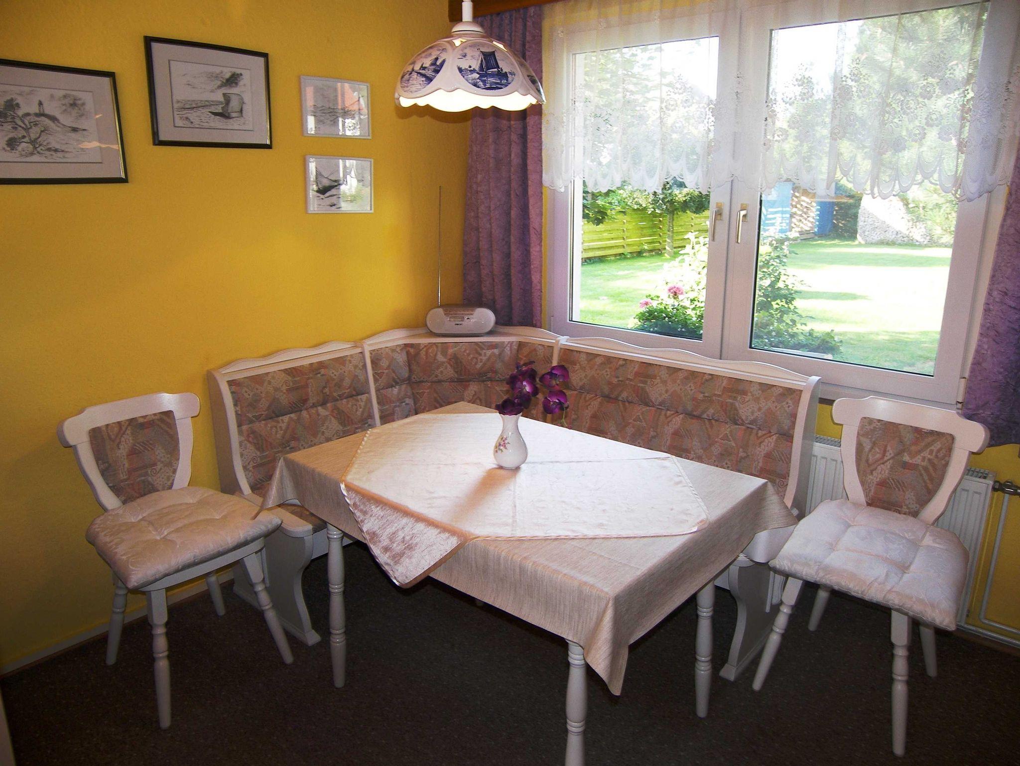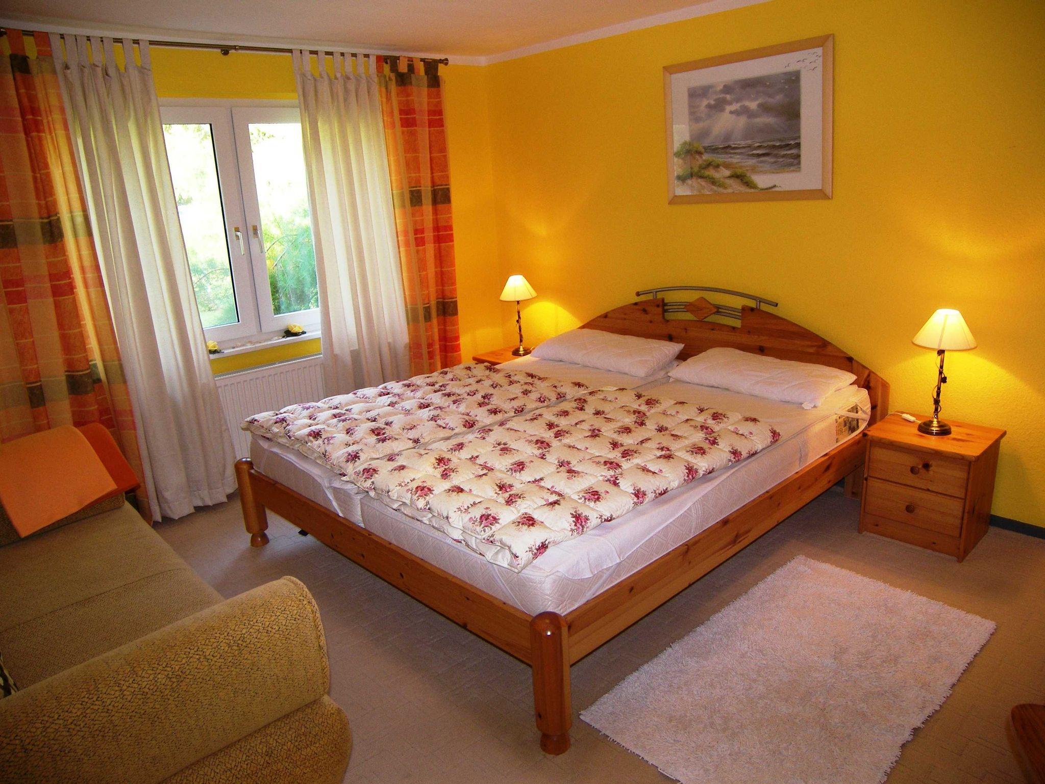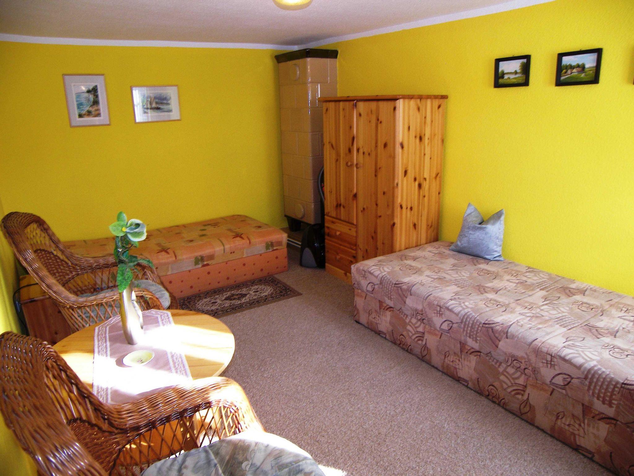 Das Schlafzimmer Nr. 2 ist über eine kleine Stufe zu erreichen und im Sommer angenehm kühl, da es unter dem Reetdach des Haupthauses liegt. In diesem Schlafzimmer befinden sich zwei Einzelbetten (Polsterliegen), ein Tisch und Stühle, ein Kleiderschrank, Heizung sowie ein Kachelofen.
