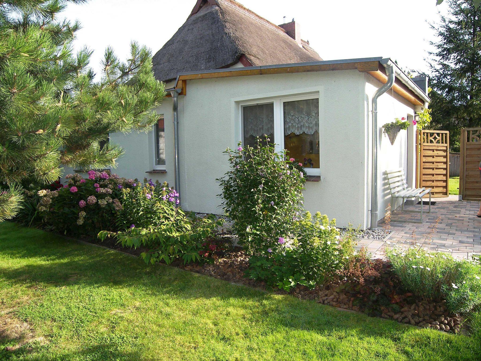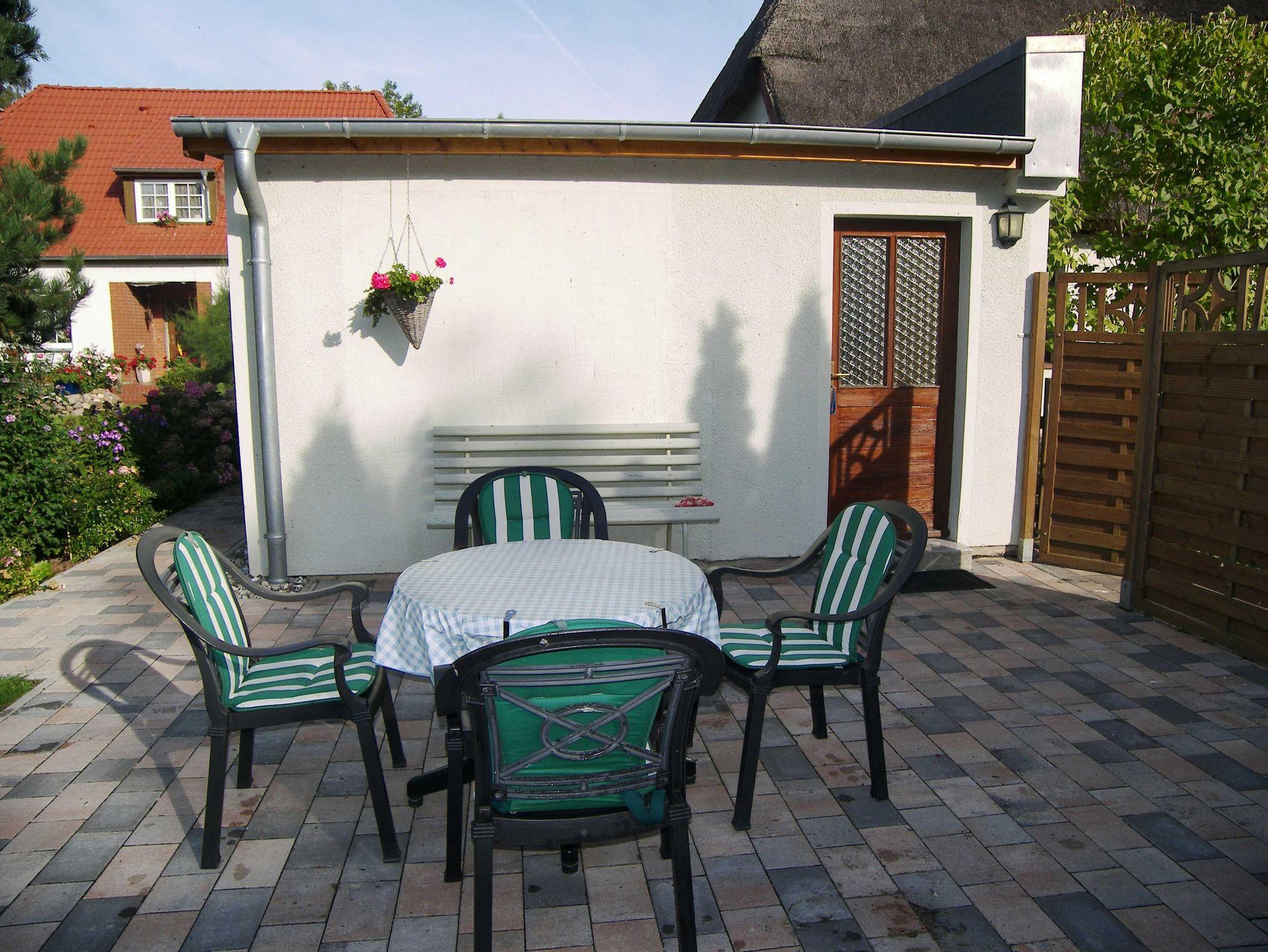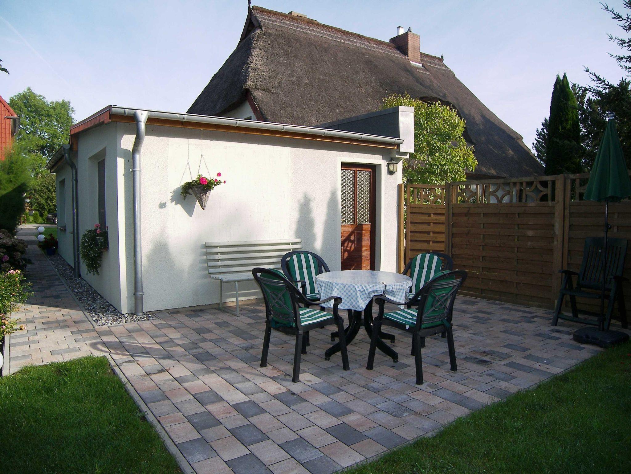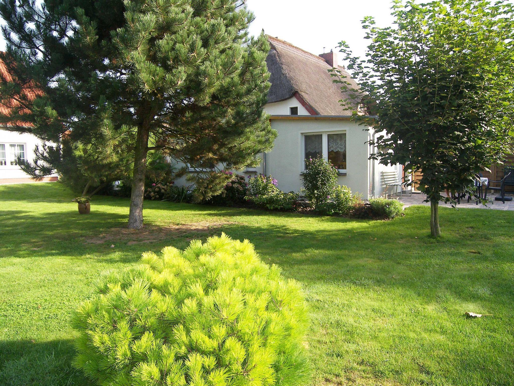Zur Ferienwohnung gehört eine zum Süden ausgerichtete Terrasse mit Sitzmöbeln und eine Liegewiese, sowie eine Grillmöglichkeit. Es kann ein Ruderboot kostenfrei genutzt werden (Krumminer Wiek mit Bootssteg ca. 250 m entfernt.) Ein Pkw-Stellplatz ist kostenlos auf dem abgeschlossenen Grundstück vorhanden.