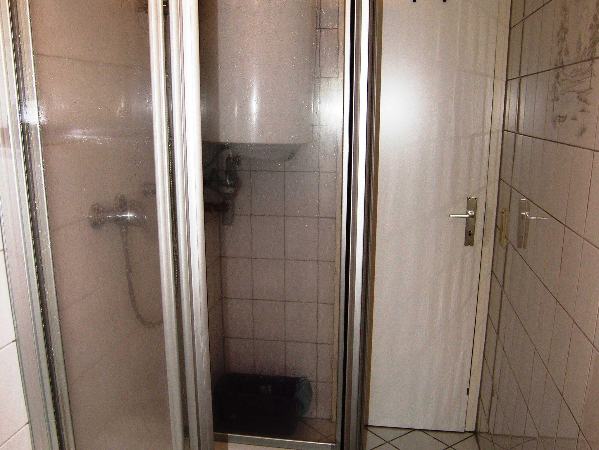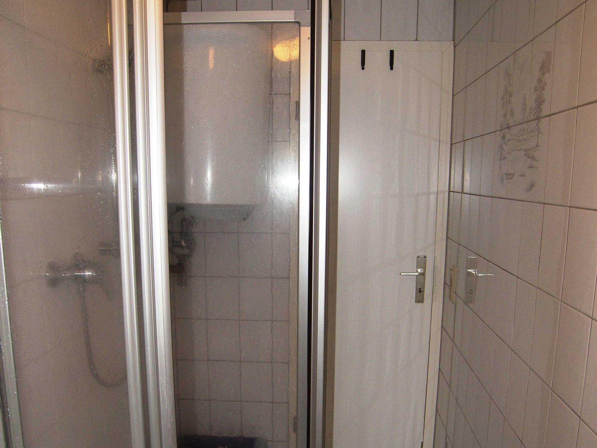 Kleines Bad mit DU/ WC. Das Schlafzimmer zur Hofseite, mit Blick ins Grüne, ist ausgestattet mit einem Doppelbett, Kleiderschrank aus Kiefernholzmöbel, sowie mit einer Couch (Teppichboden).