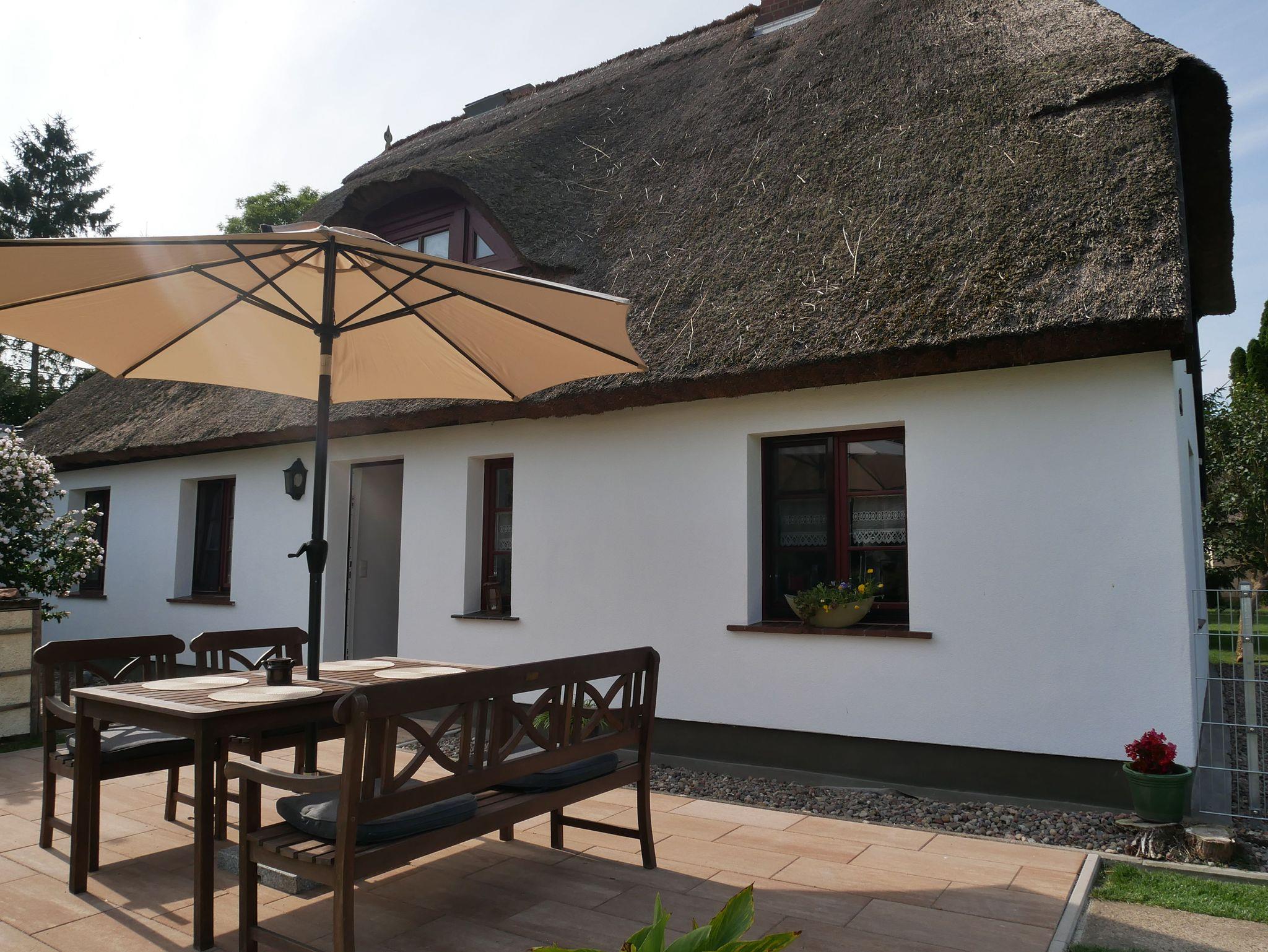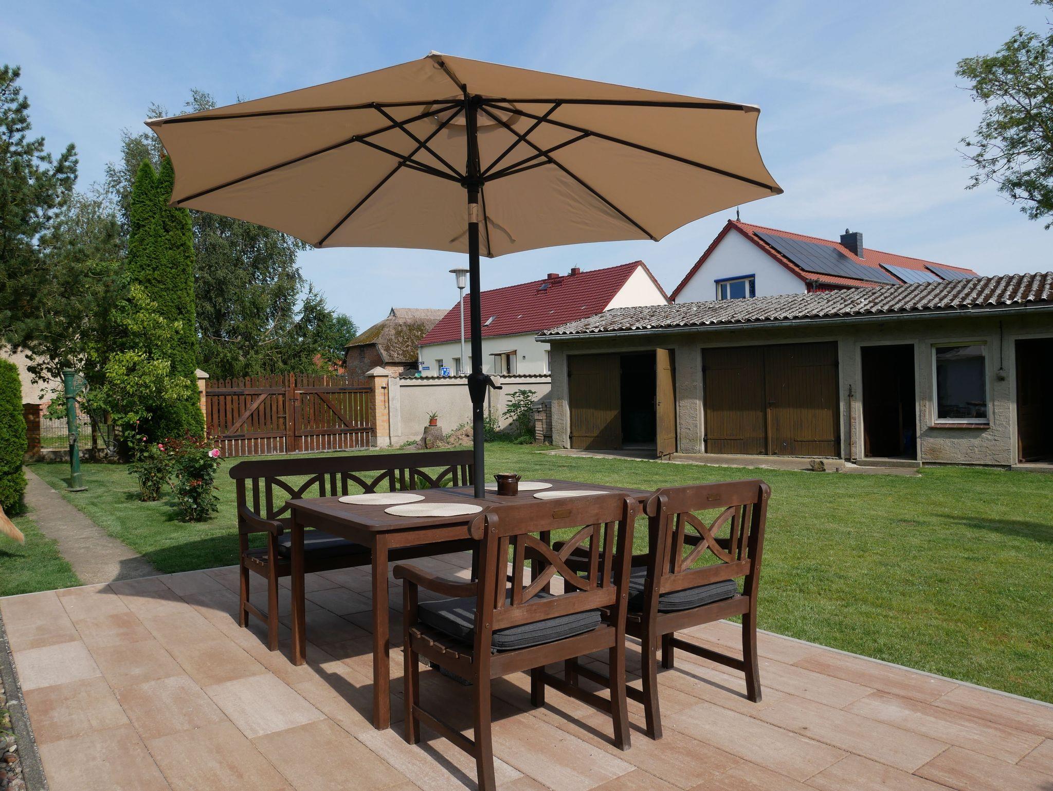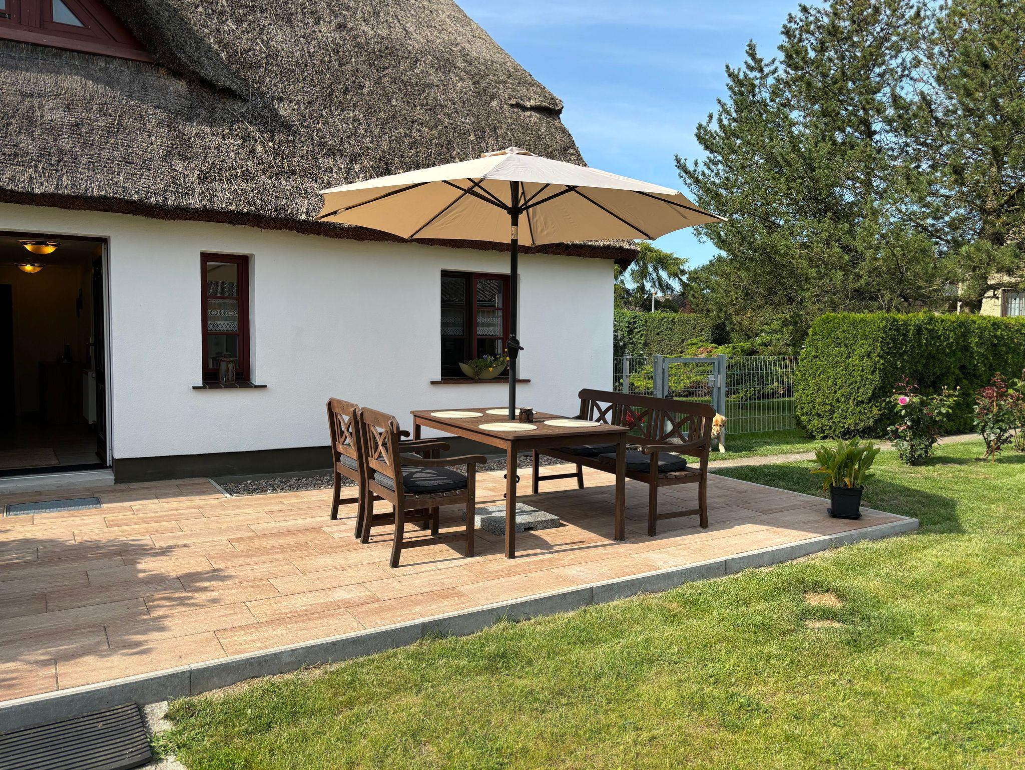 Vor dem Ferienhaus befindet sich eine möblierte Terrasse mit einem Sonnenschirm. Ein Grill kann gern geliehen werden.
