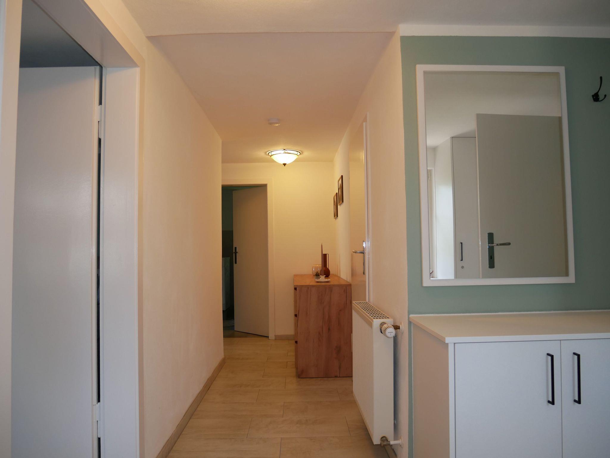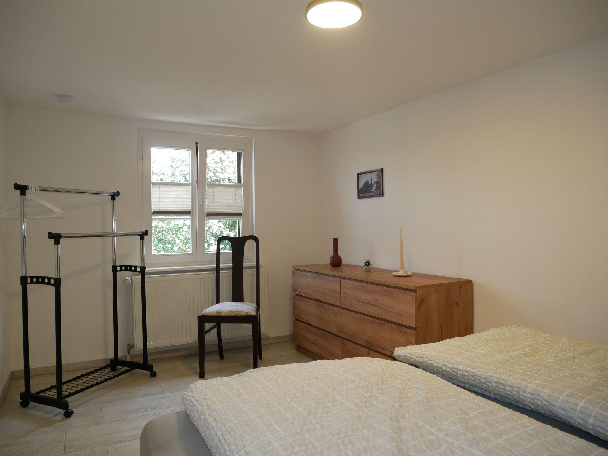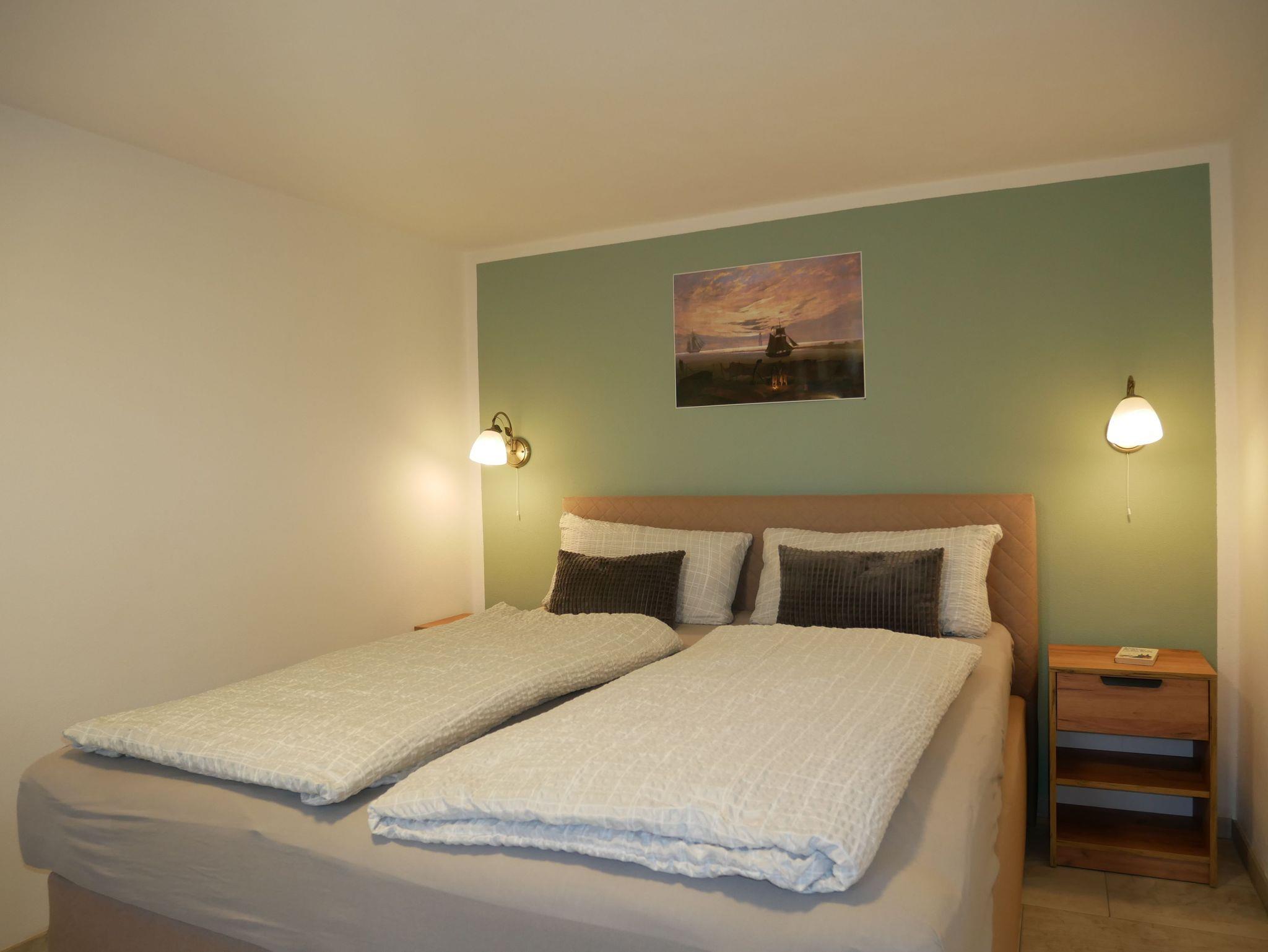 Das Schlafzimmer ist ausgestattet mit einem Doppelbett (1,60x2,00m), einer Kleiderstange und einer Kommode. Das zweite Schlafzimmer verfügt über zwei Einzelbetten. Einen Kleiderschrank und eine weitere Kommode zum Ablegen der Kleidungsstücke finden Sie im großzügigen Flurbereich. Das Badezimmer ist ausgestattet mit einer großen ebenerdigen Dusche, Haartrockner und einer Waschmaschine.
