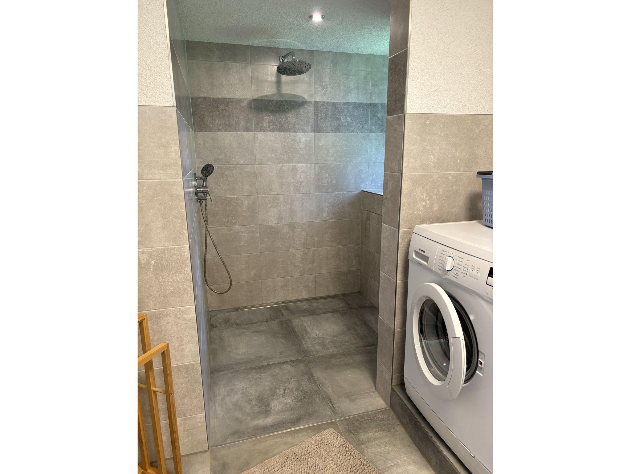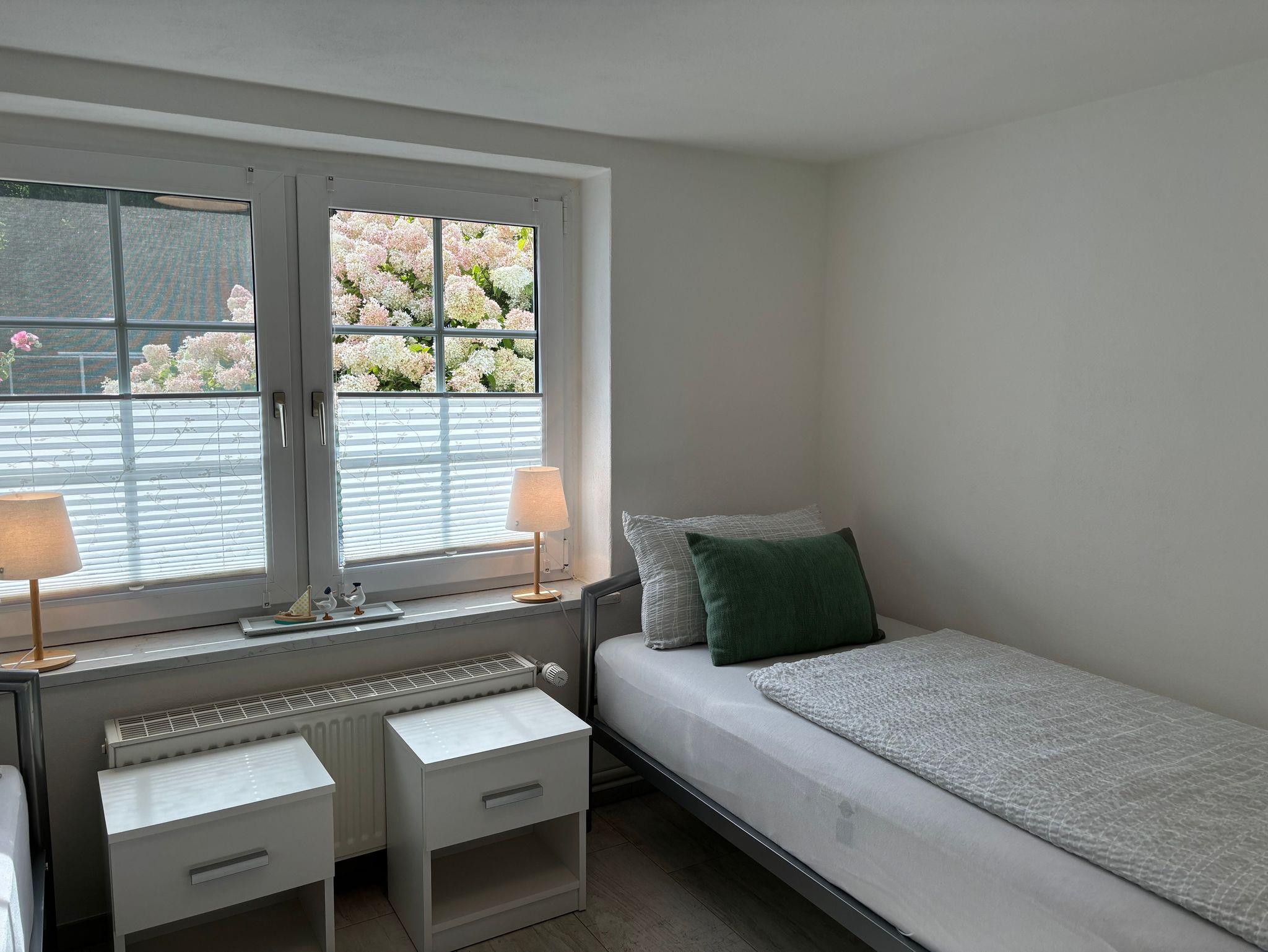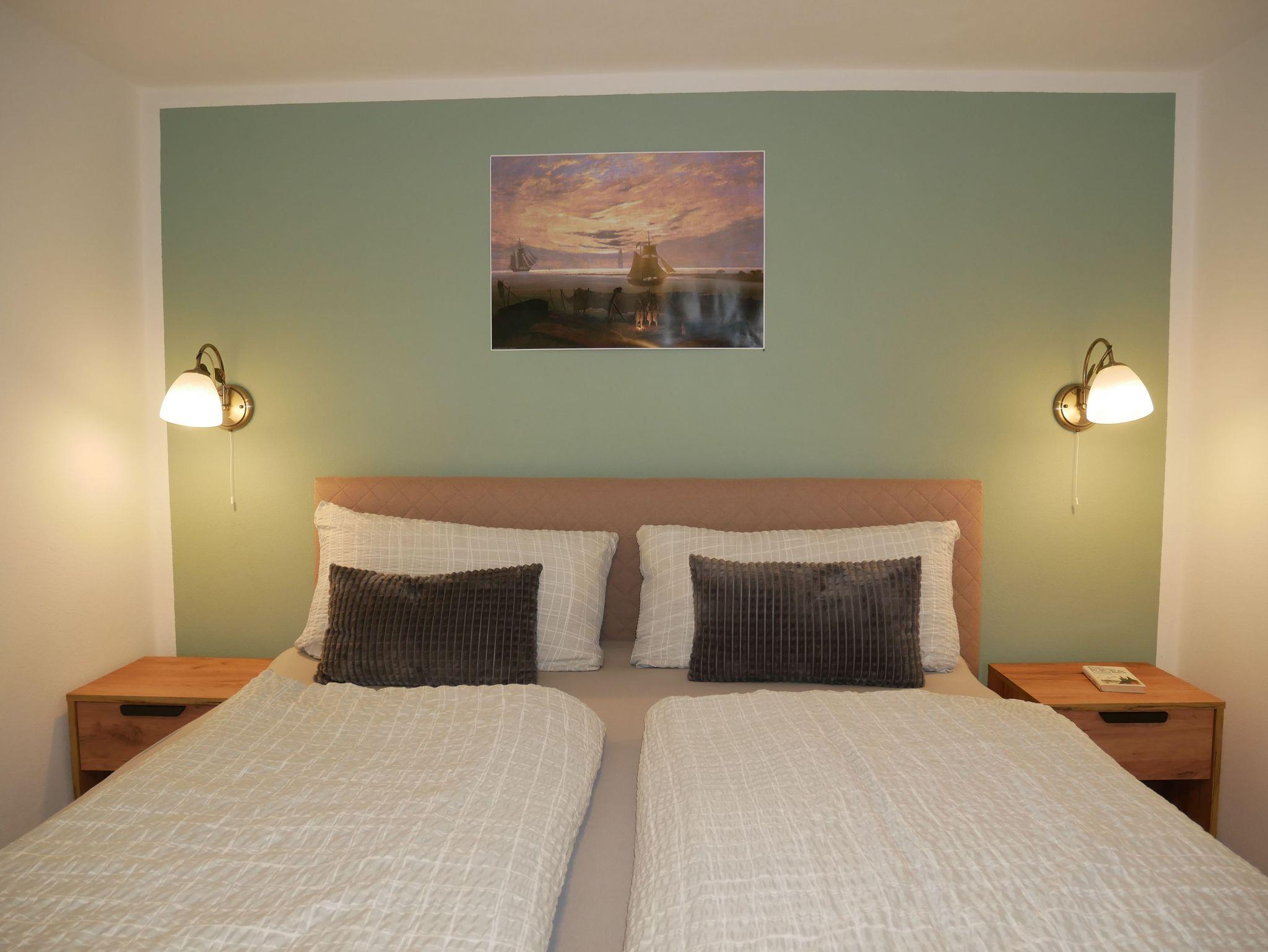 Das Schlafzimmer ist ausgestattet mit einem Doppelbett (1,60x2,00m), einer Kleiderstange und einer Kommode. Das zweite Schlafzimmer verfügt über zwei Einzelbetten. Einen Kleiderschrank und eine weitere Kommode zum Ablegen der Kleidungsstücke finden Sie im großzügigen Flurbereich. Das Badezimmer ist ausgestattet mit einer großen ebenerdigen Dusche, Haartrockner und einer Waschmaschine.