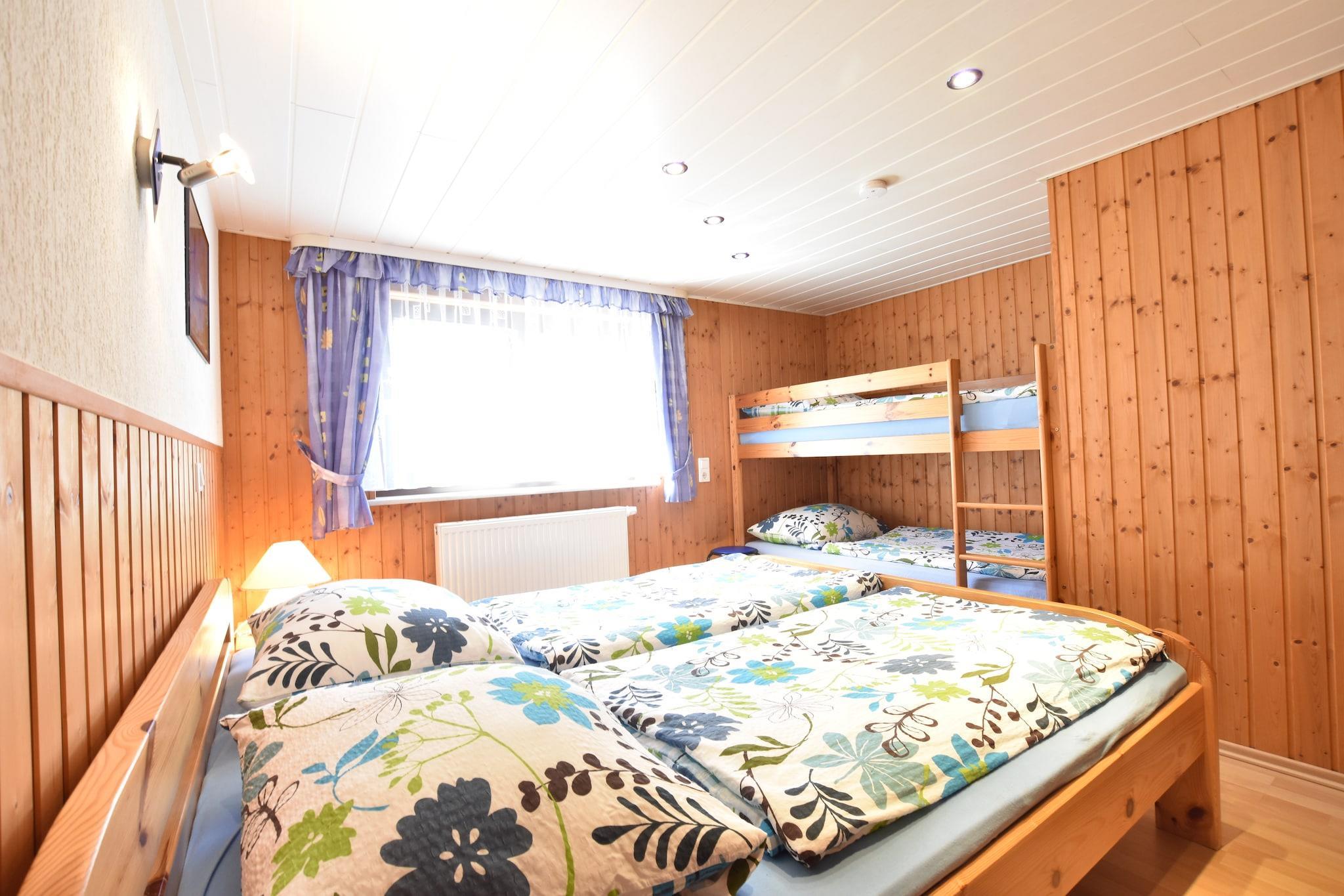Parterre: (Schlafzimmer(Etagenbett(90 x 190 cm), Doppelbett king size(180 x 200 cm)), Badezimmer(Dusche, Waschbecken, Toilette), Heizung, Kinderbett) In der 1. Etage: (Wohnzimmer(Schlafcouch 1 Pers., TV(Flatscreen), Esstisch, Sitzecke, Radio, CD-Spieler), offene Küche(Wasserkocher, Toaster, Kochherd(Ceranfeld), Kaffeemaschine, Backofen, Mikrowelle, Kühlschrank)) Terrasse, Garten(umzäunt), Fahrradabstellraum, Gartenmöbel, Grill, Parkplatz, Sandkasten, Spielgeräte, Sonnenschirm