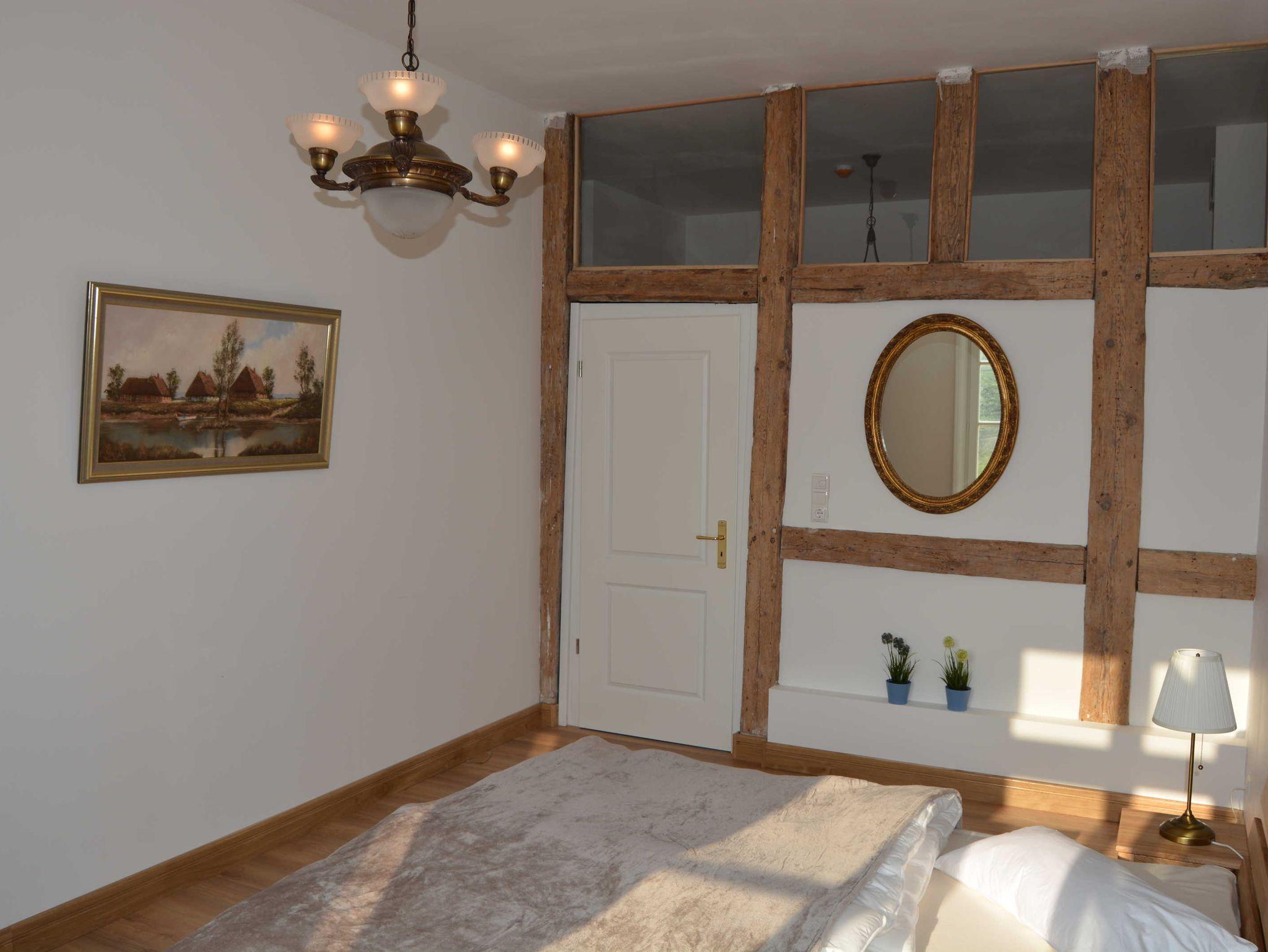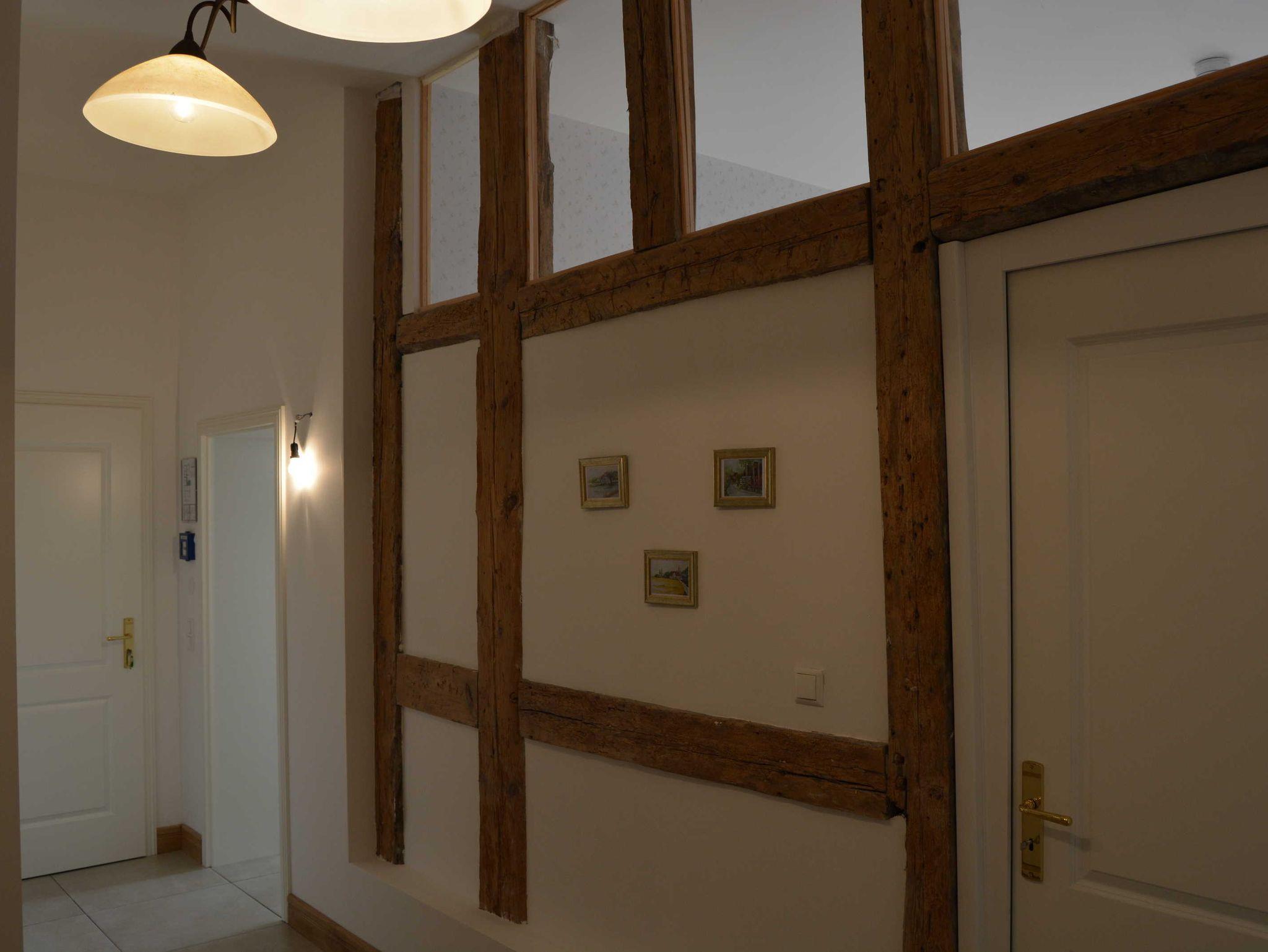 Die Ferienwohnung Hasengrube liegt im Erdgeschoss, ist ca. 71qm groß und wird ebenfalls über den vorgelagerten Wintergarten sowie die große Eingangshalle des Gutshauses erreicht.