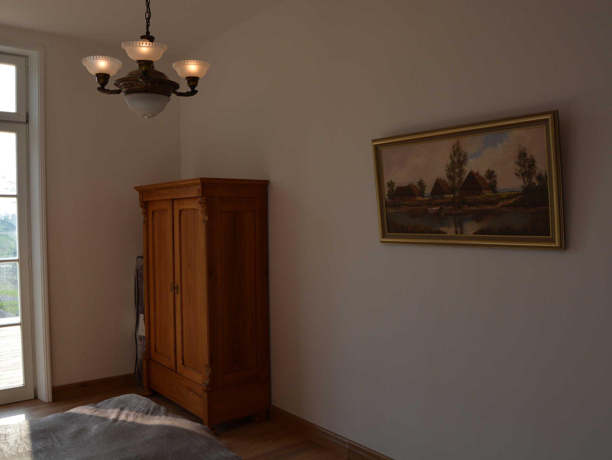 Idyllische Ferienwohnung im historischen Gutshaus Redentin nahe der Ostsee, mit großer Veranda und Blick ins Grüne.