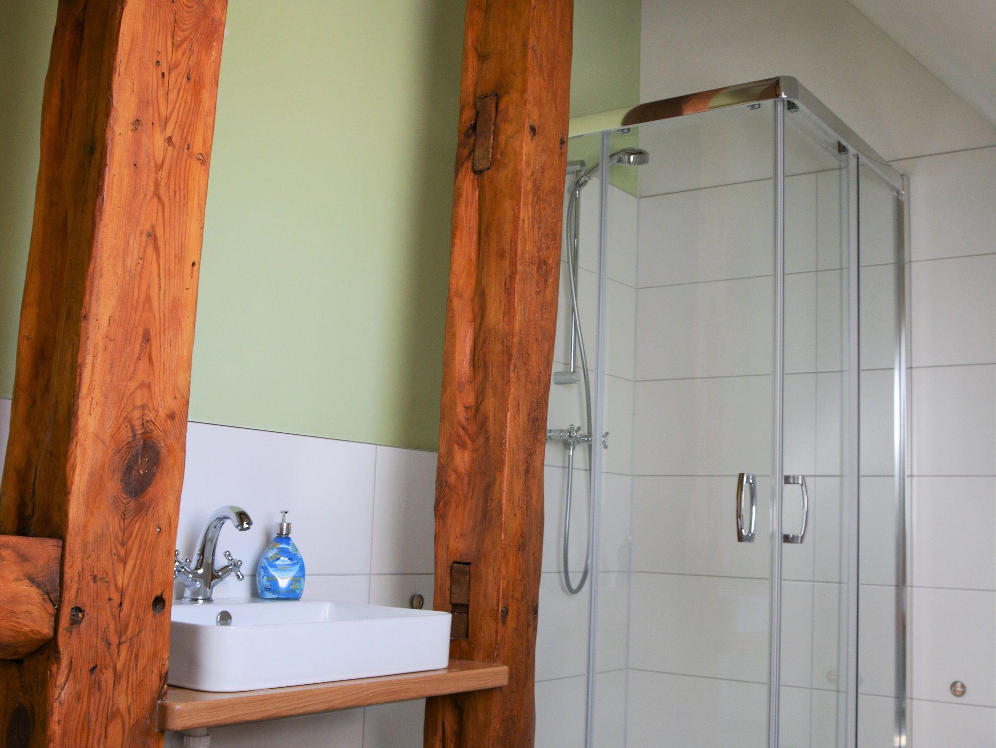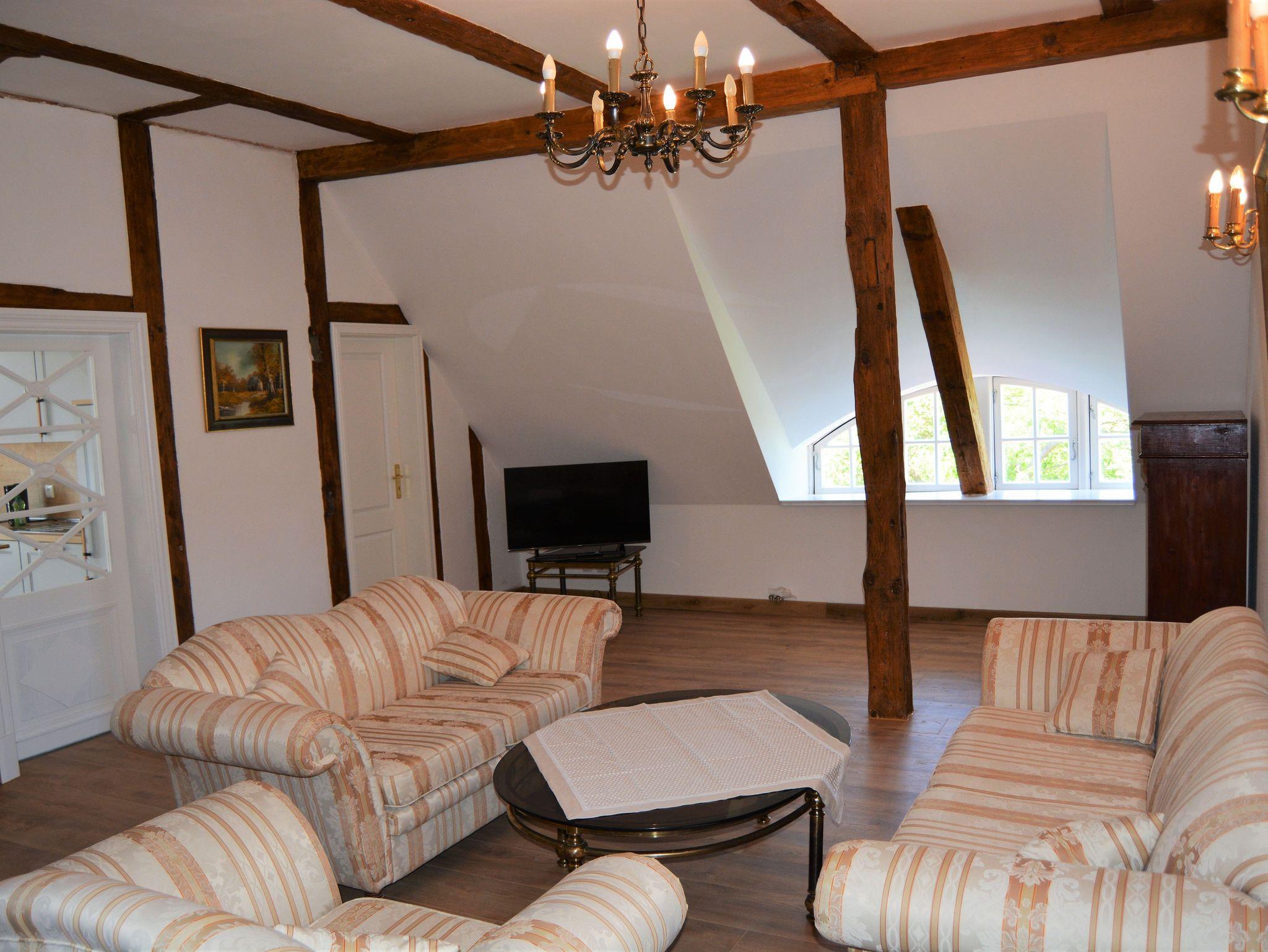 Die Wohnung Schwalbennest ist mit ihren fast 110qm Gesamtfläche sehr großzügig ausgelegt. Die freigelegten Balken schaffen eine naturnahes Ambiente.