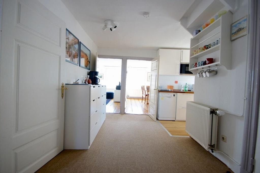 In einzigartiger Altstadtlage - direkt im Zentrum von Travemünde, der Vorderreihe – finden Sie die historische Ferienwohnung. Die Wohnung befindet sich im 1. und 2. OG des historisch erwähnten 250 Jahre alten Fachwerkhauses. Sie betreten die Wohnung über einen hellen Flur. Linker Hand befindet sich das moderne in weiß gehaltene Badezimmer und das Schlafzimmer – hell und modern mit hochwertigem Bett und Blick auf den schönen Innenhof! Geradeaus gelangen Sie in den großzügigen Wohn- und Essbereich mit angrenzender offener Küche und Holztreppe zum Schlafzimmer im Spitzboden. Die gesamte Wohnung ist mit hochwertigem Teppich und Fliesen ausgestattet, sowie im Wohn- und Esszimmer mit altem Dielenboden und bietet durch das Fachwerk ein besonderes Wohnumfeld. Die wunderschöne Wohnung ist vollständig renoviert und liebevoll eingerichtet worden. Die Einrichtung ist exklusiv: 32- Flat-TV im Wohnzimmer,32-Zoll-LCD-TV als Zweitfernseher im oberen Schlafzimmer und Designermöbel. Die offene Küche ist mit neuster Technik sowie Geschirrspüler, Ceran-Kochfeld, Umluftbackofen, Mikrowelle, PixiNespresso Kaffeemaschine, Wasserkocher, Toaster, Waffeleisen, Mixer, Saftpresse, Gewürzauswahl etc. ausgestattet. Von fast allen Räumen haben Sie einen wunderbaren Blick auf die schöne Trave. Des Weiteren befindet sich im Innenhof eine voll ausgestattete Terrasse, die zum Verweilen und Träumen einlädt. Die Ferienwohnung bietet einen Dauerstrandkorb bei der Strandkorbvermietung Knoll am Sandstrand von Travemünde, der kostenlos für Sie reserviert ist.