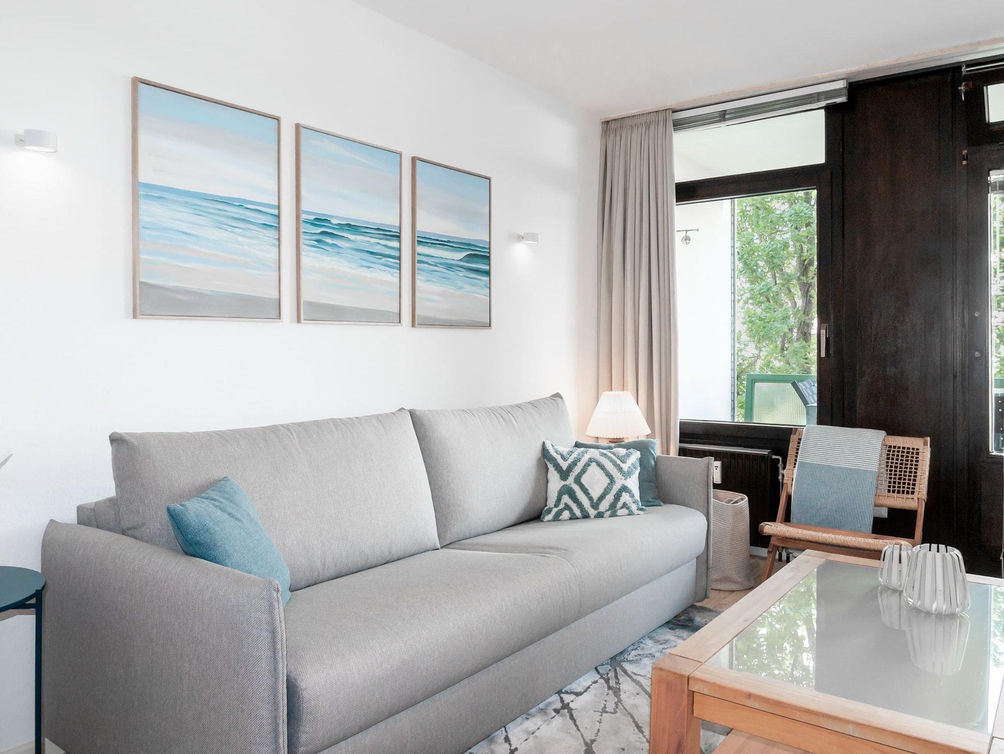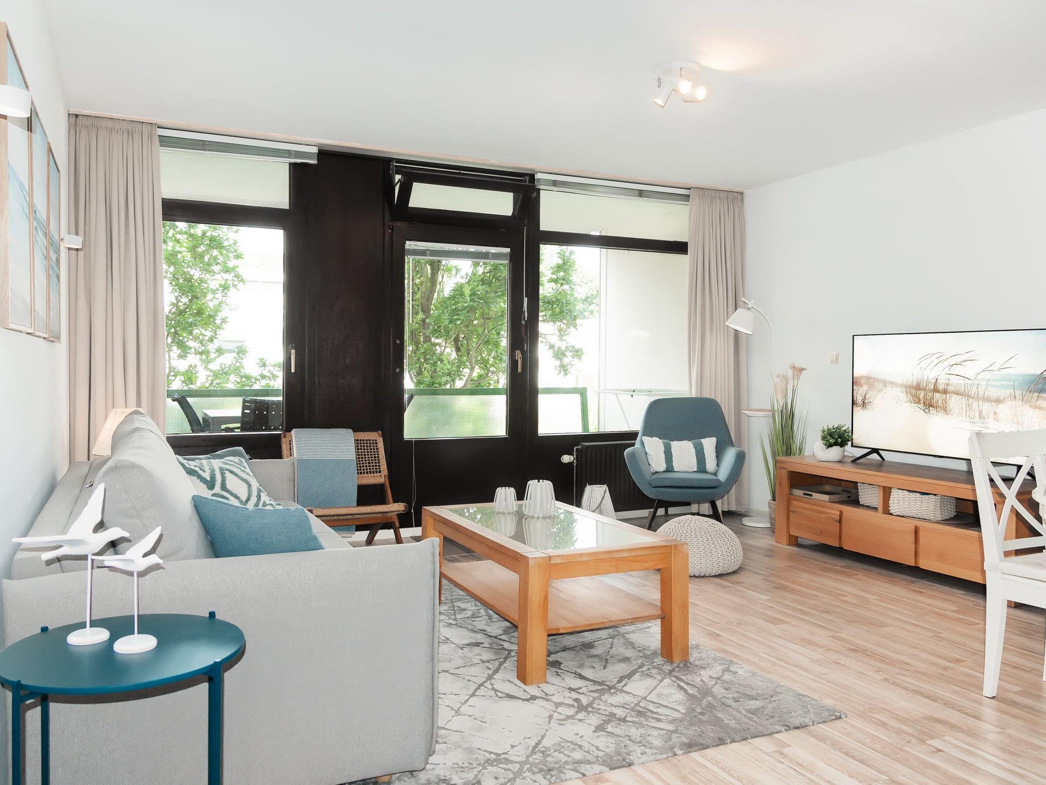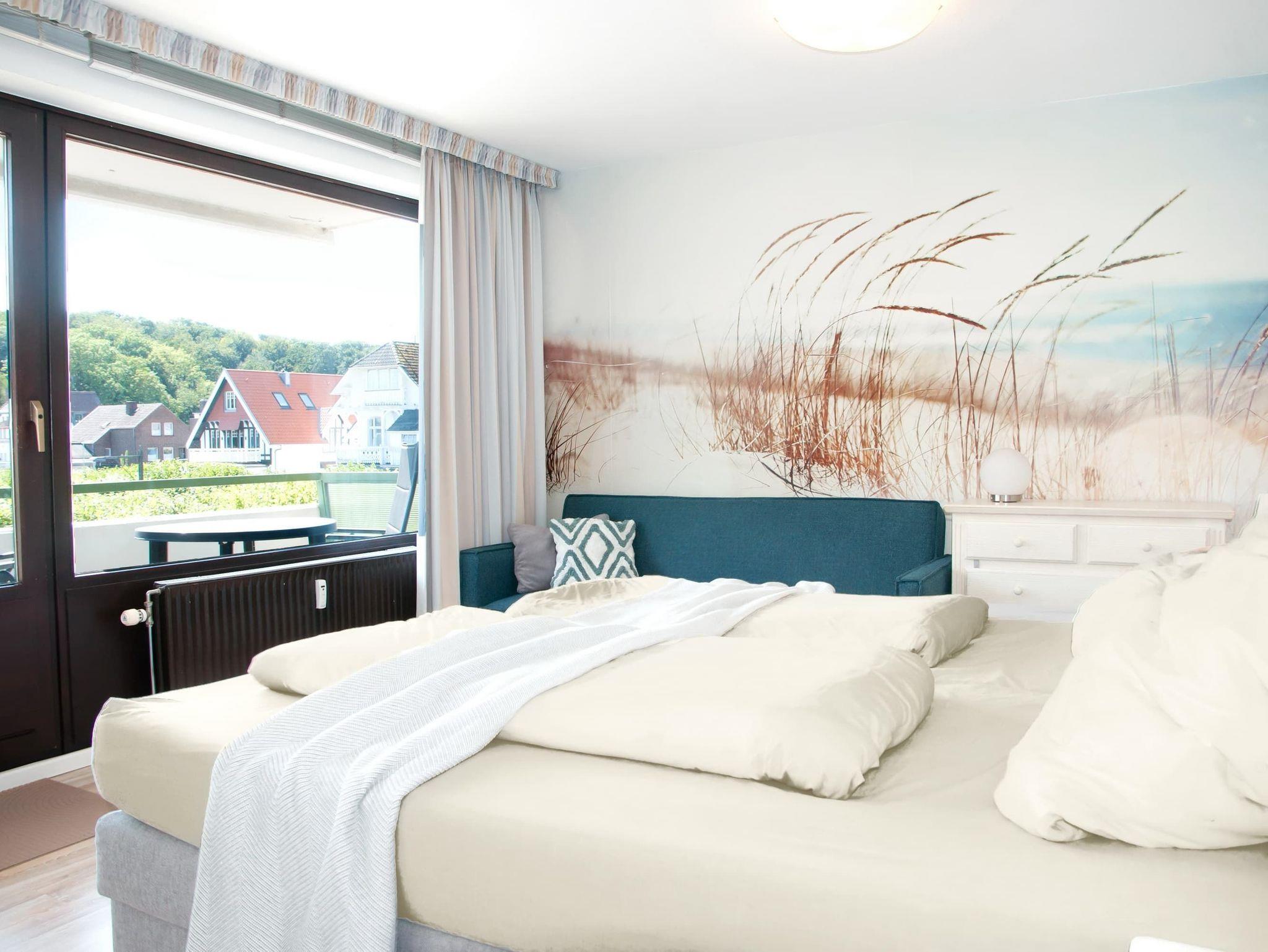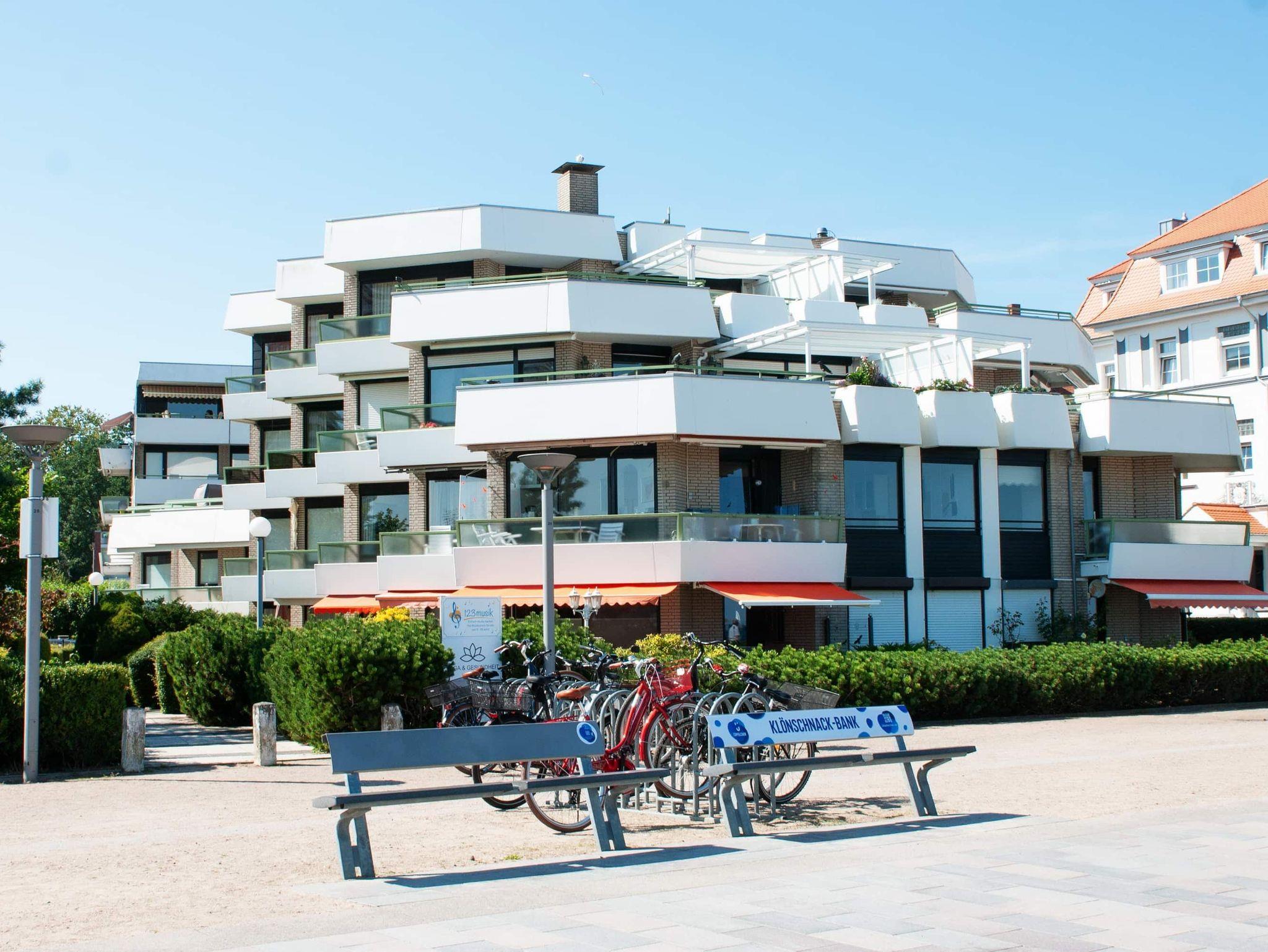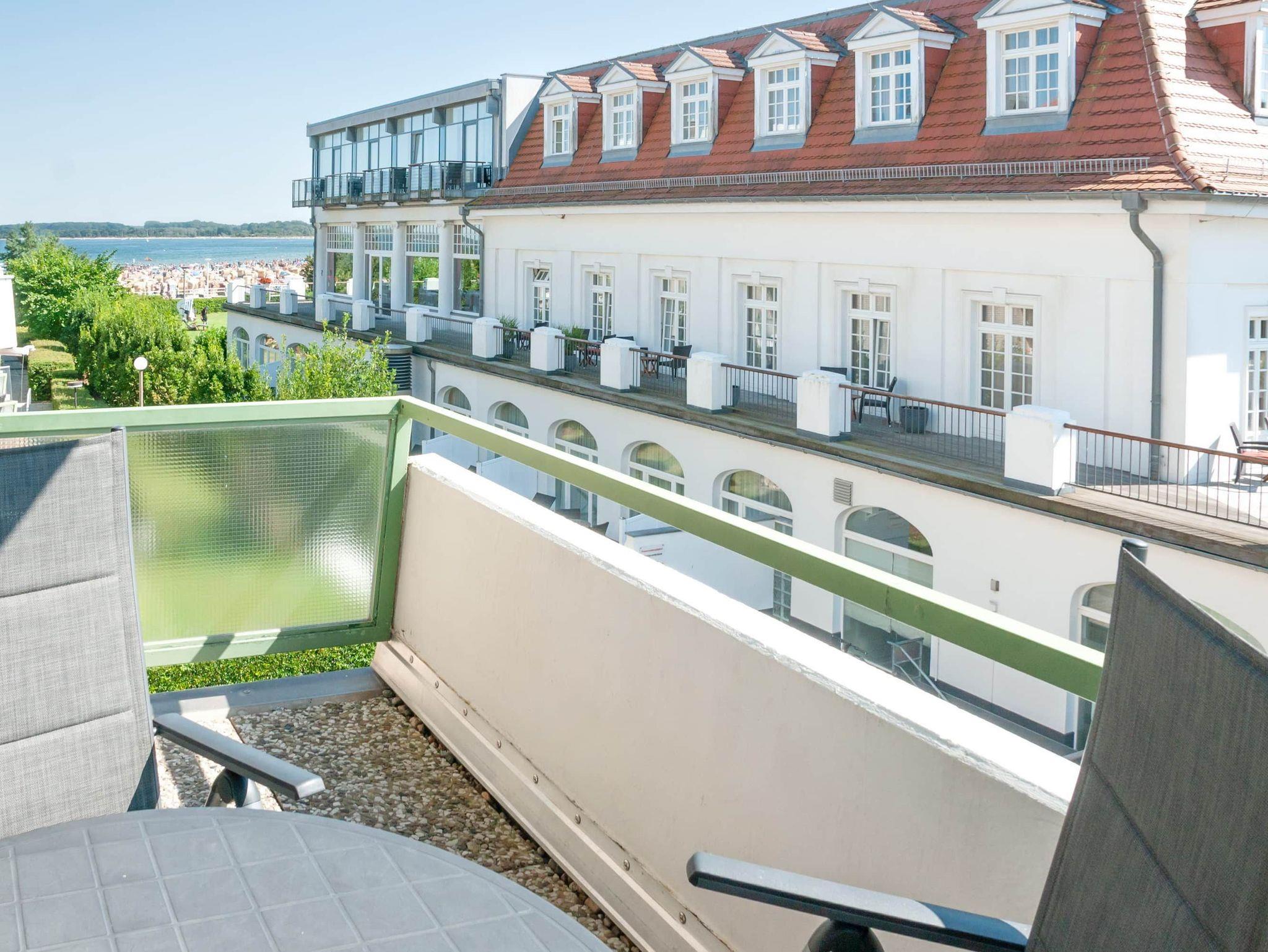 Moderne 2-Zimmer-Ferienwohnung in Lübeck-Travemünde mit seitlichem Meerblick und zwei Balkonen.