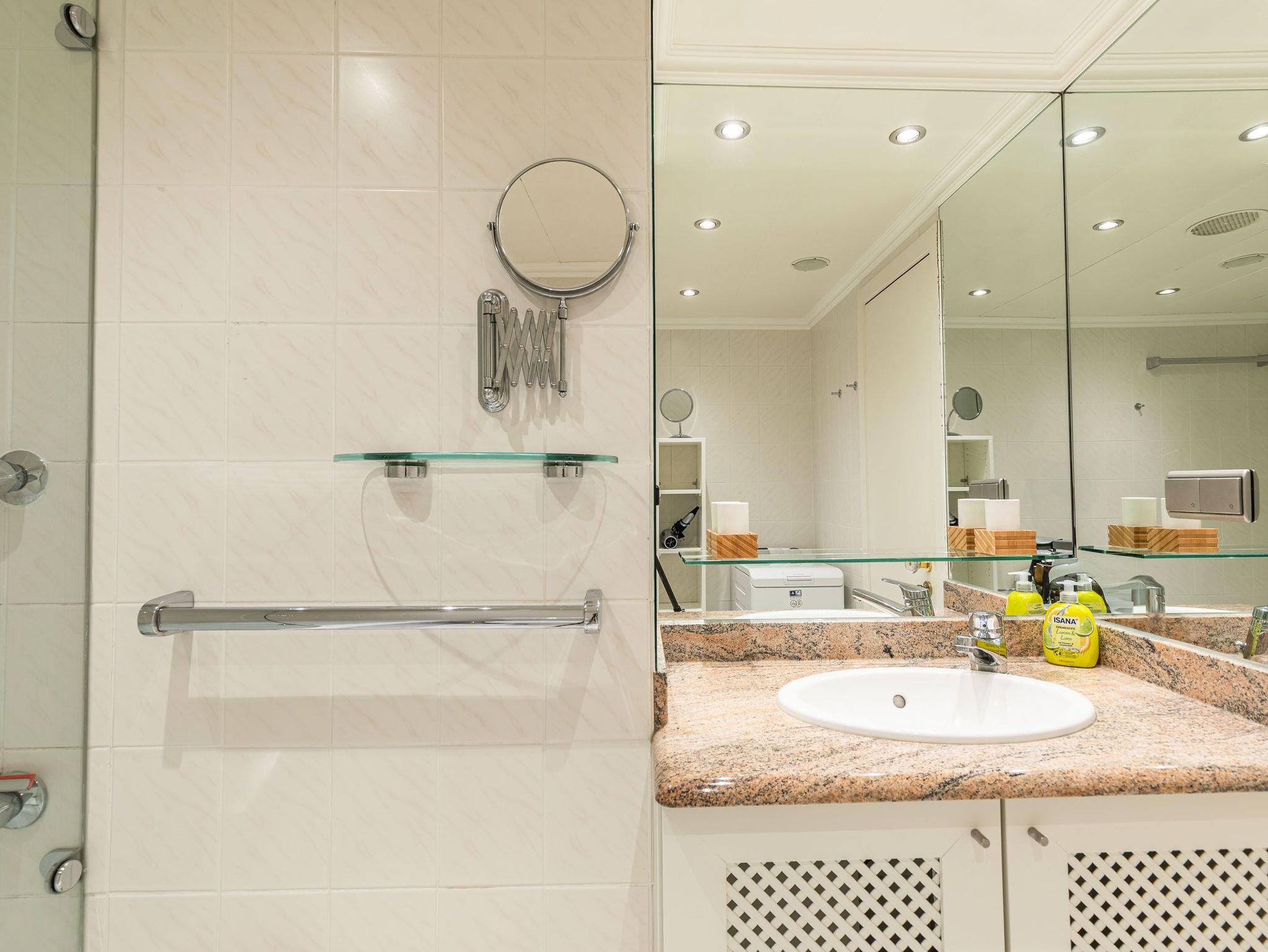 Umlaufende Loggia von ca. 21 m², Markise, Küche, Geschirrspüler, Mikrowelle, Vollbad/WC, Fön, Waschmaschine, 2x TV, Stereoanlage, kostenl. W-Lan, Safe, Aufzug, inkl. Tiefgaragenstellplatz (Einfahrtshöhe: 1,85 m).