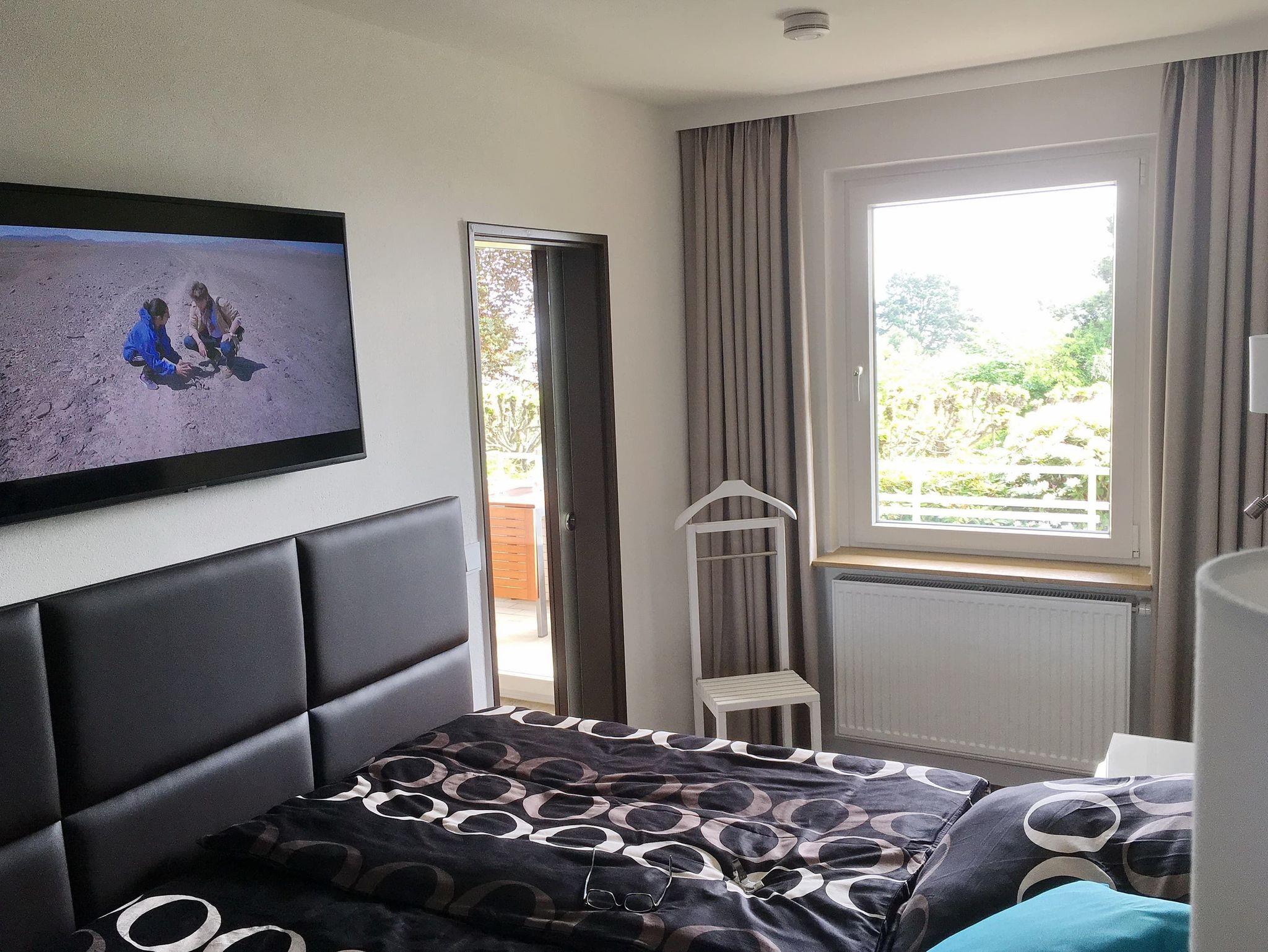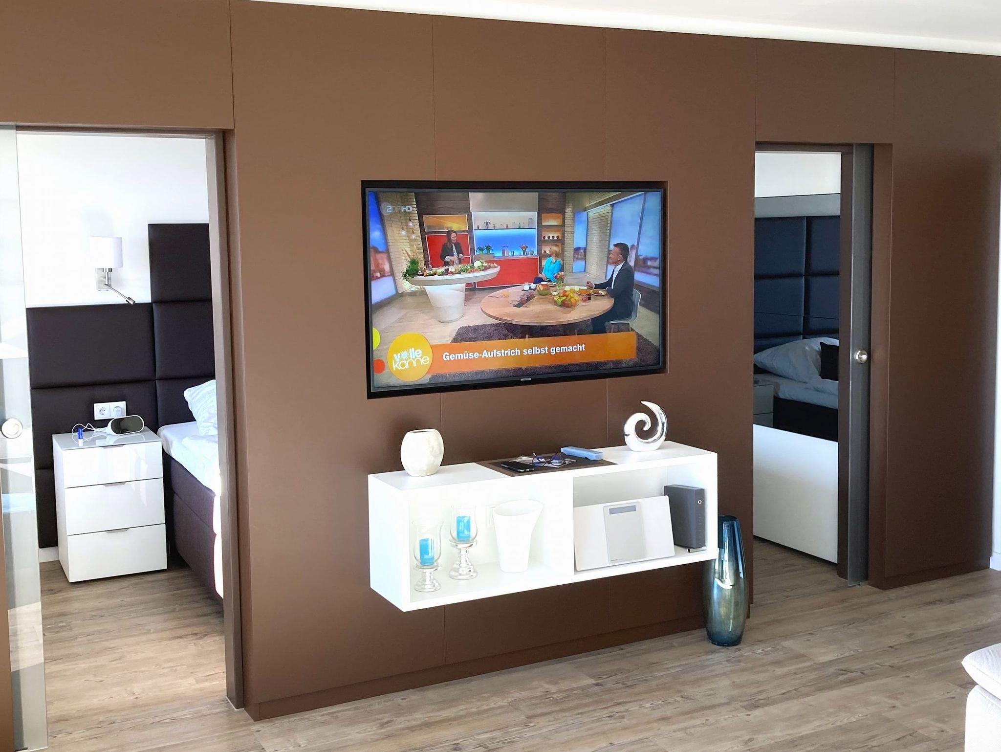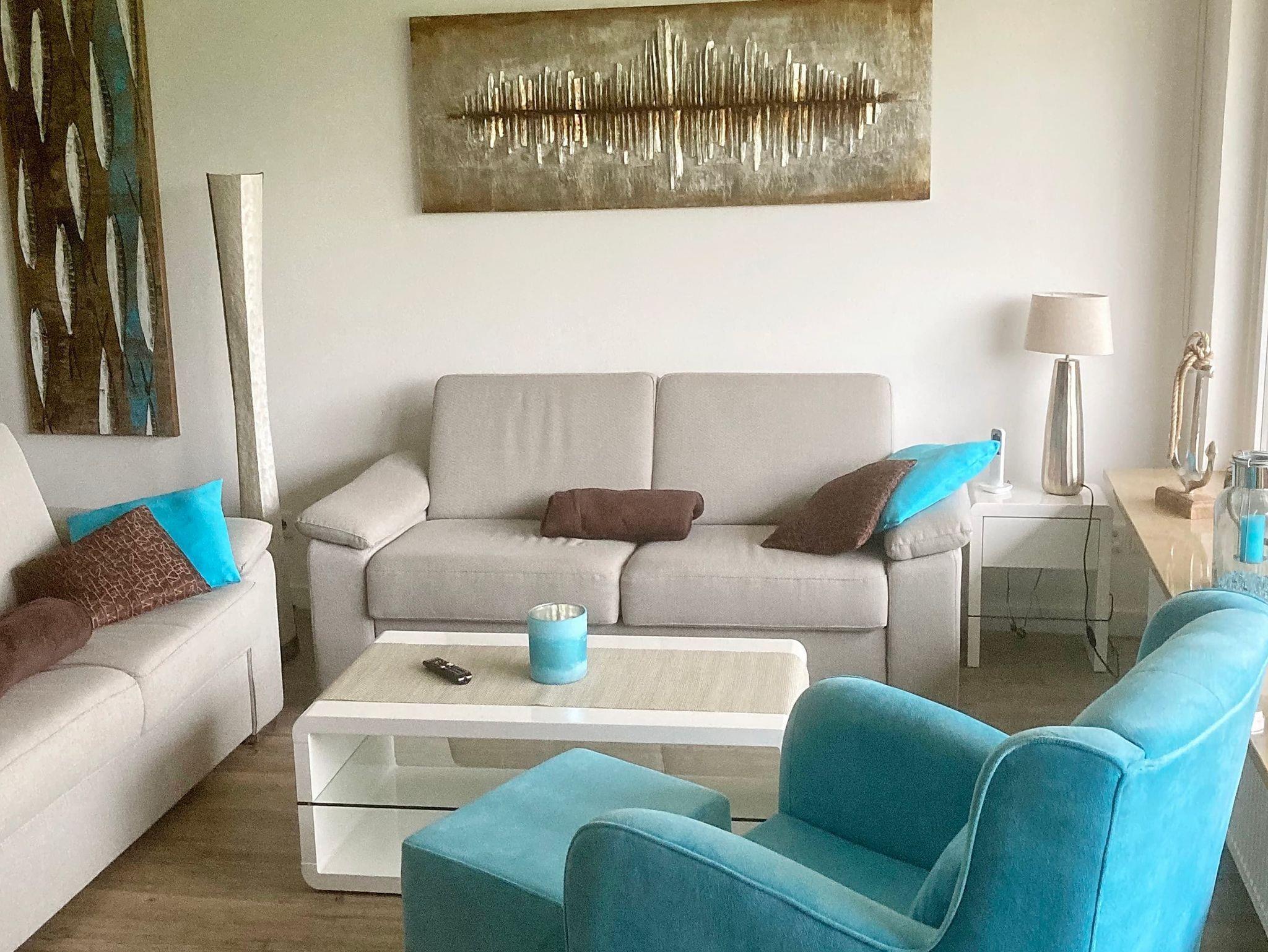 Diese großzügige und geschmackvoll eingerichtete 2-Zimmer-Wohnung, liegt direkt an der Liegewiese und bietet Ihnen alle Voraussetzungen für einen erholsamen Urlaub an der Ostsee. Die Wohnung betreten Sie durch den Flur, von welchem auch der geräumige Abstellraum, sowie das Badezimmer abgehen. Im Wohnzimmer dieser exklusiv ausgestatteten Ferienwohnung finden Sie zwei gemütliche Couch-Garnituren, einen bequemen Sessel mit Fußhocker sowie einen großen 55-Zoll Smart-TV und einen kleinen Schreibtisch. Die hochwertig bestückte Küche verfügt über einen modernen 4-Flammen-Herd, einen Geschirrspüler und Elektrogeräte namenhafter Hersteller. Im Wohnbereich befindet sich zudem die Essecke, bestehend aus einem Tisch und 4 Stühlen. Im Schlafzimmer steht ein großzügiges und bequemes Boxspringbett, ein geräumiger Kleiderschrank mit Mini-Tresor sowie ein großer TV. Der Wohnbereich und das Schlafzimmer können abgedunkelt werden. Das moderne Duschbad mit Naturstein verfügt über eine großzügige ebenerdige Dusche. In der gesamten Wohnung ist ein Design-Vinylboden in Holzoptik ausgelegt. Die große Loggia ist mit gemütlichen Möbeln sowie einer Liege ausgestattet und lädt zu gemütlichen Stunden mit Blick auf das Meer ein. Vom Wohnzimmer und der Loggia können Sie ganztägig das bunte Treiben auf dem Wasser, sowie an der Strandpromenade beobachten. Im Sommer steht Ihnen ein Strandkorb am Strand kostenfrei zur Verfügung. Genießen Sie entspannte Stunden an der Ostsee.