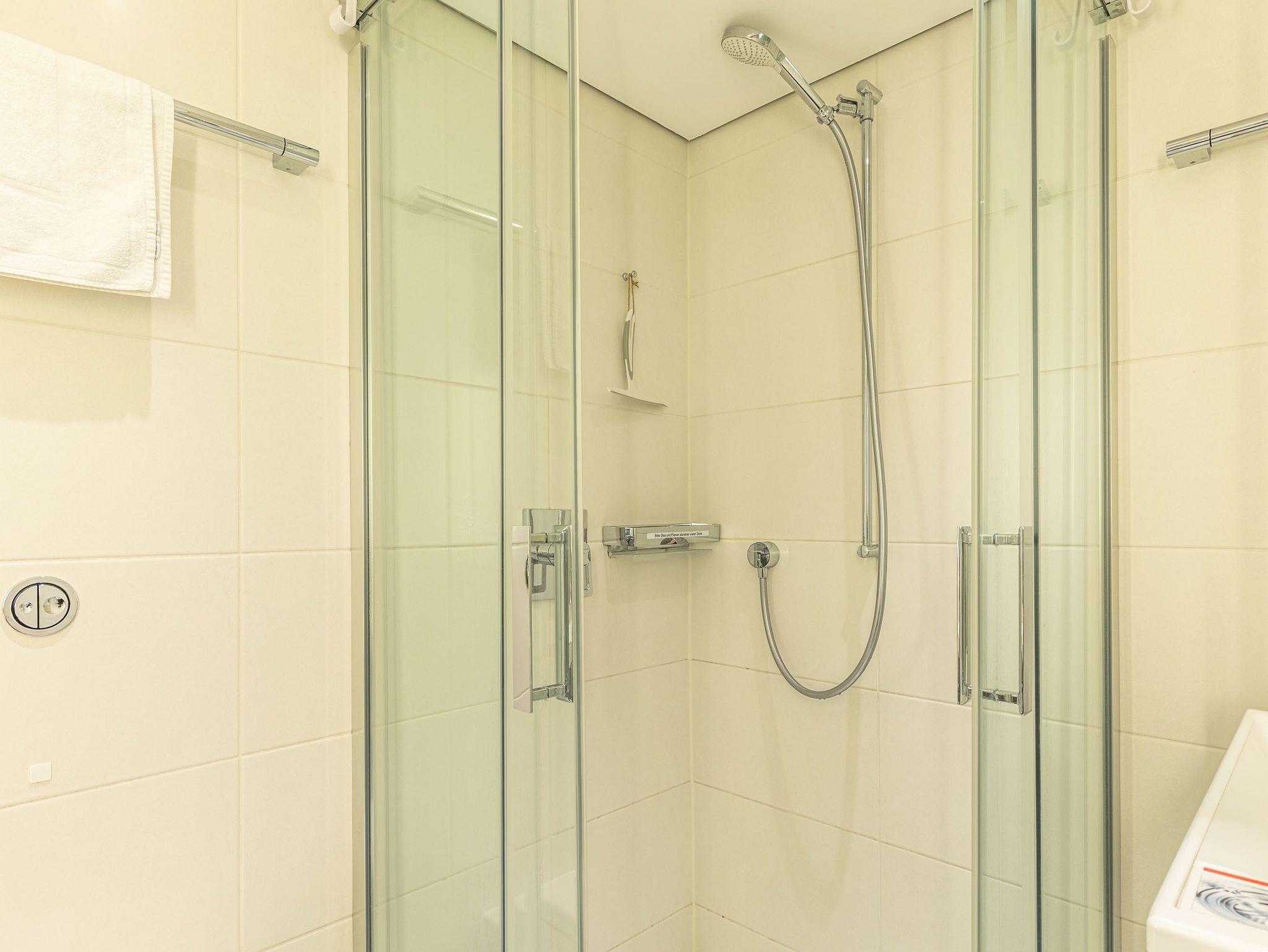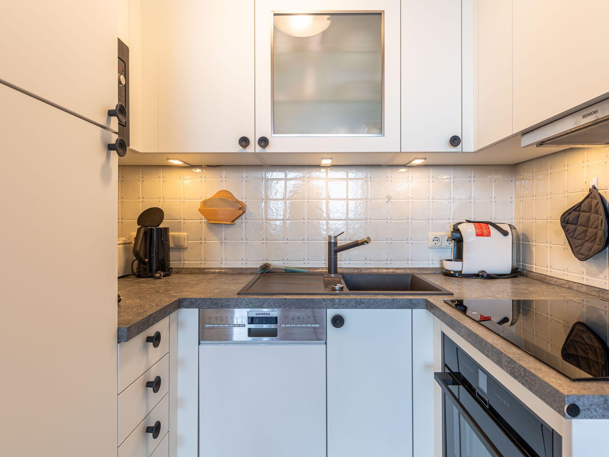 Umlaufende Loggia von ca. 26 m², offene Einbauküche, Mikrowelle, Geschirrspüler, Waschmaschine/Trockner, Duschbad/WC, Fön, 2x TV, Stereoanlage mit Digitalradio, kostenl. W-Lan, Aufzug, inkl. Tiefgaragenstellplatz (Einfahrtshöhe: 1,85 m).