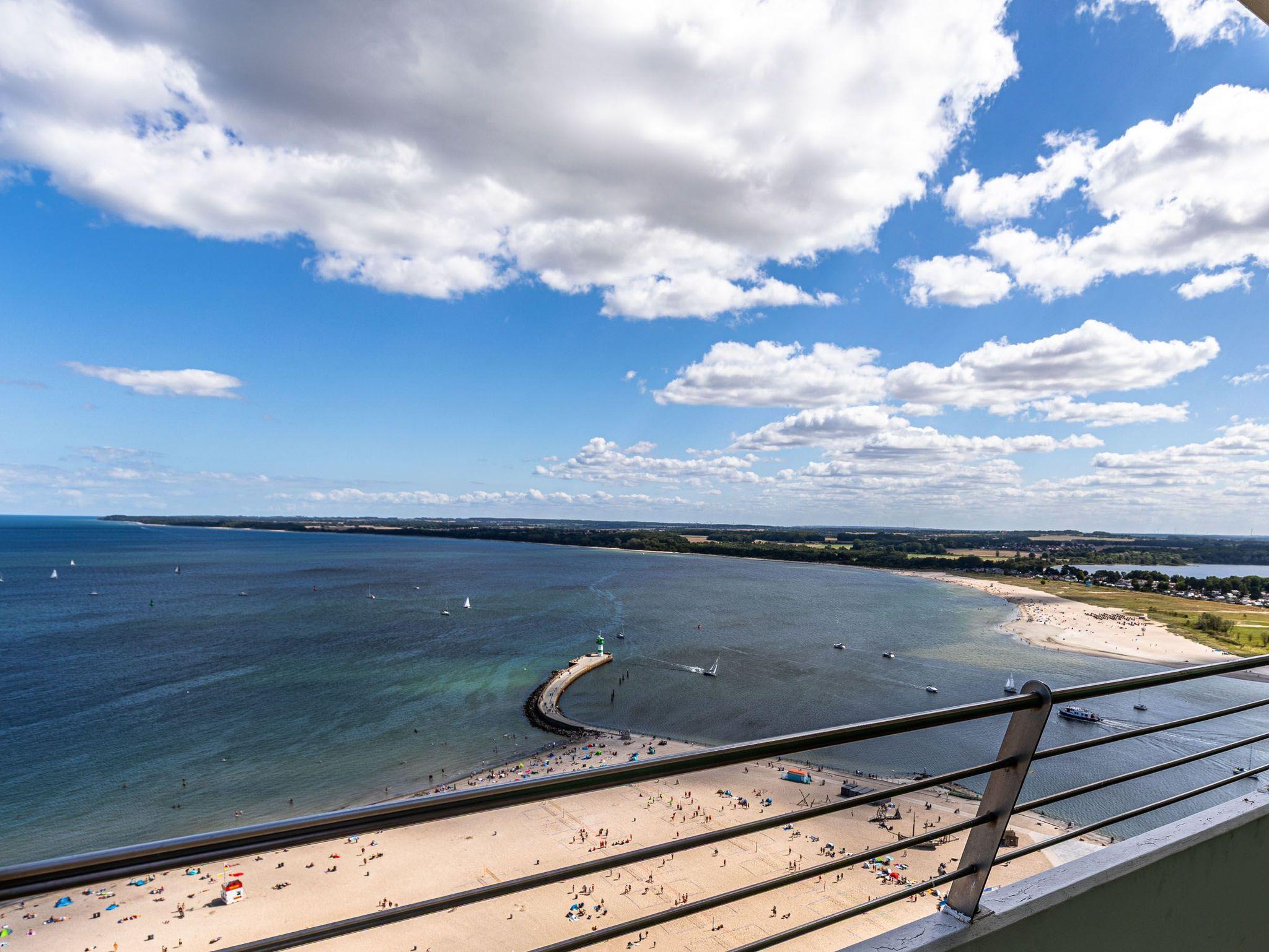 Highlight dieser komfortablen 3-Zimmer Ferienwohnung ist die traumhafte Lage mit Blick über den Strand und Ostsee, sowie auf ein- und ausfahrendem Schiffsverkehr. Der großzügige Wohnraum besteht aus einer hellen Wohnlandschaft und einer bequemen Essecke und einer offenen Einbauküche. Im ersten Schlafzimmer steht ein Doppelbett (2x 90 cm x 200 cm) und ein großer Einbauschrank. Im weiteren Schlafzimmer steht ebenfalls ein Doppelbett (2x 90 cm x 200 cm) auch mit Kleiderschrank. Das moderne Duschbad erreichen Sie vom Flur. Den überdimensionalen Eckbalkon zum Strand und Ostsee erreichen Sie von allen Wohnräumen, um den tollen Panoramablick zu genießen.