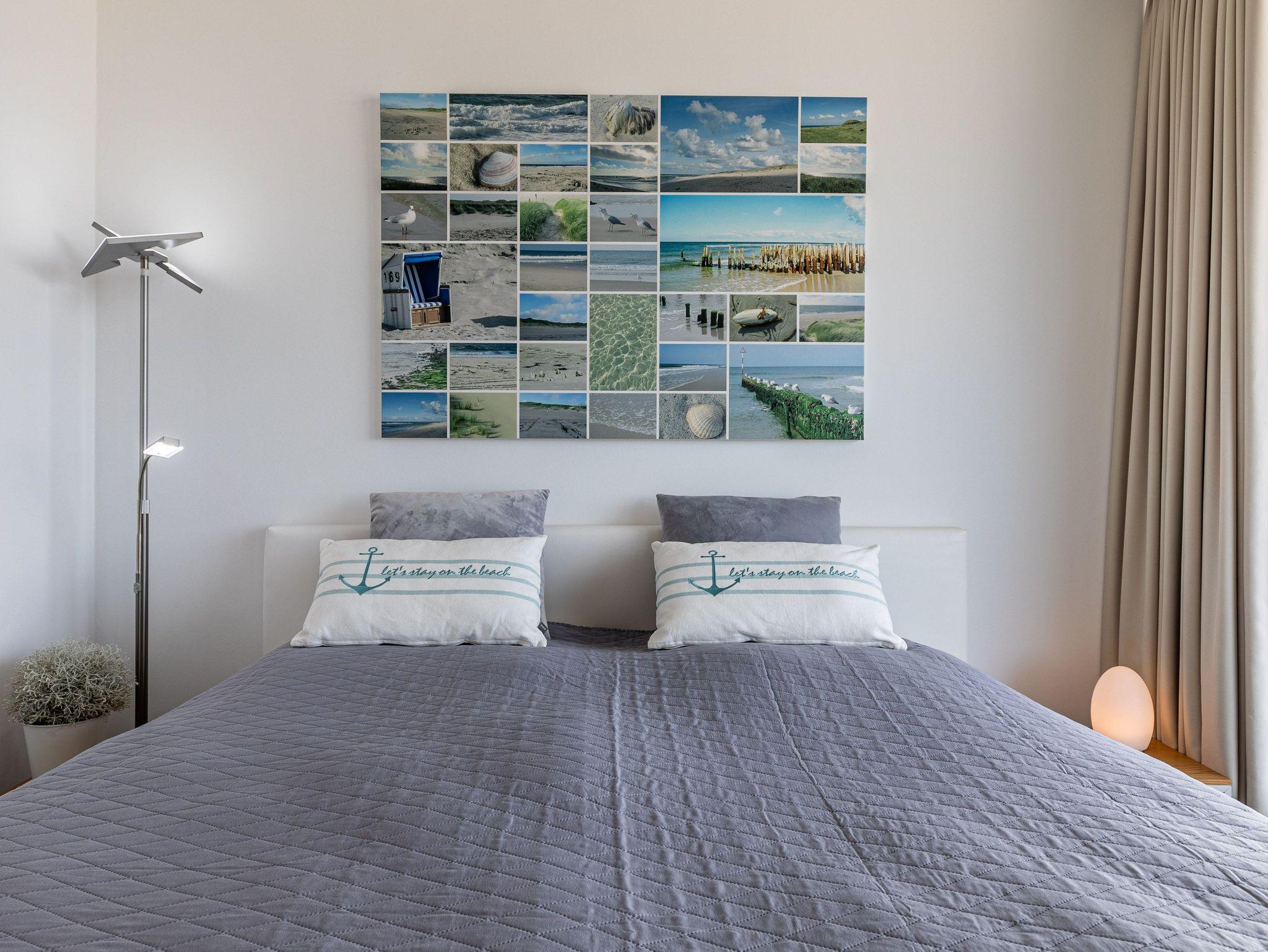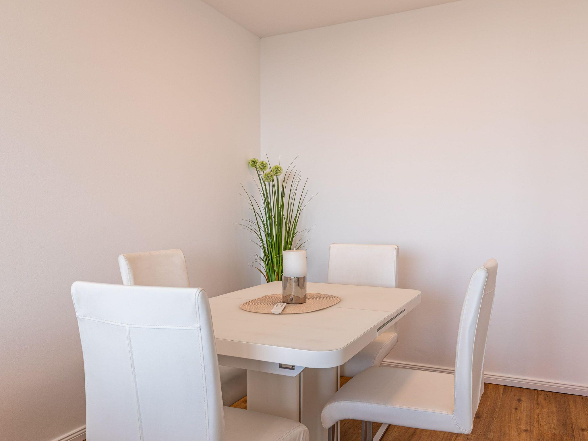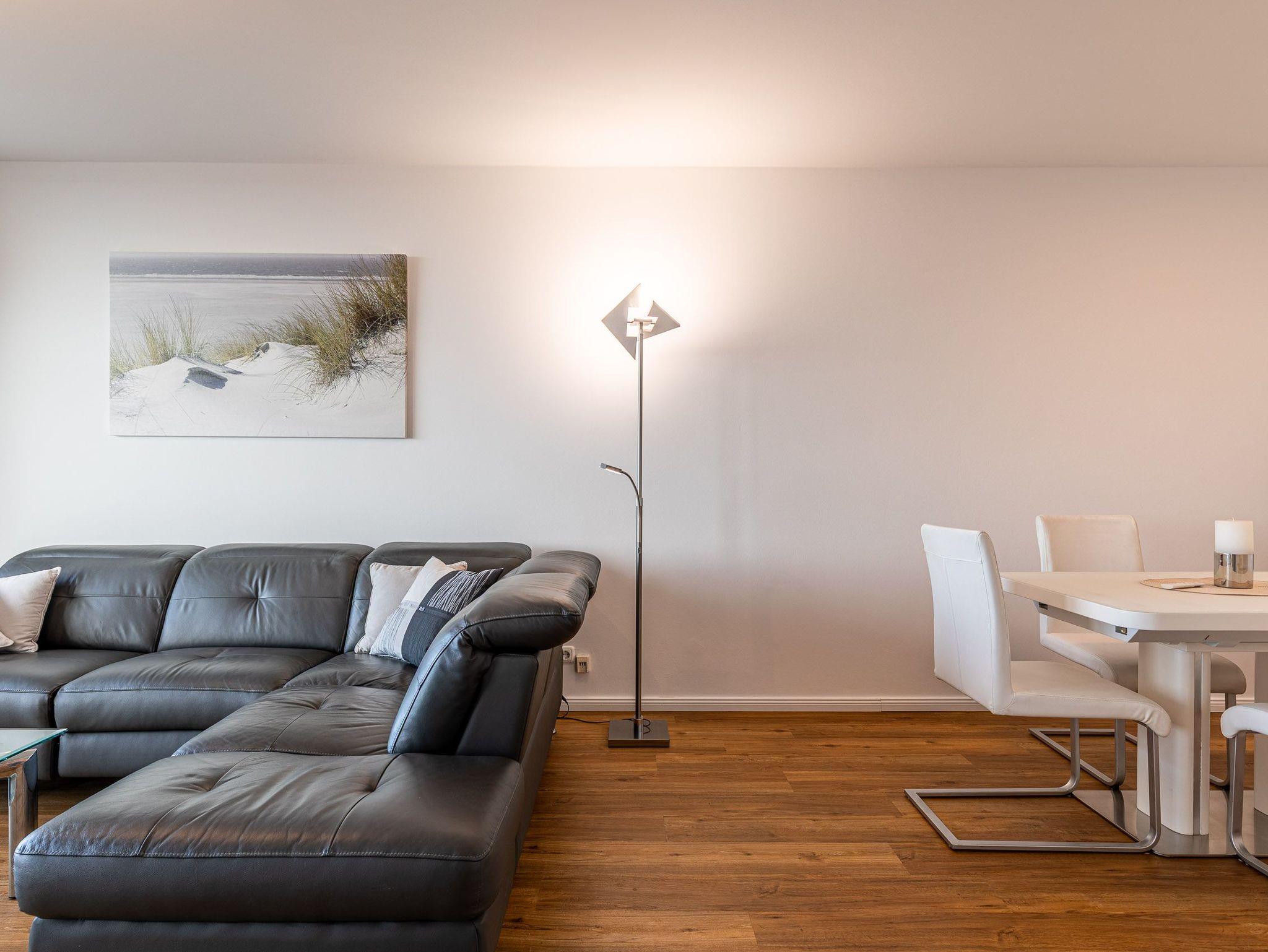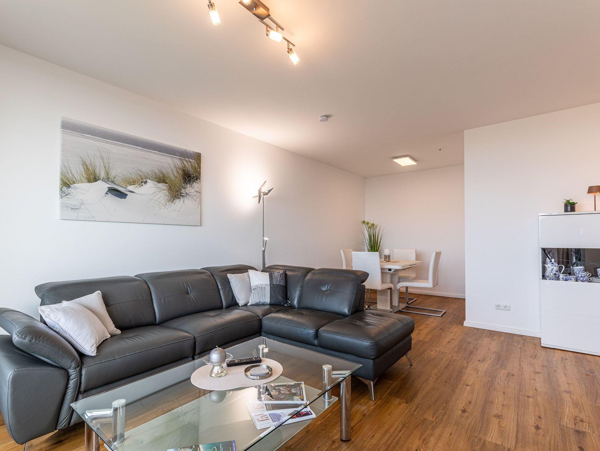 Die moderne Küche mit Geschirrspüler, Mikrowelle und Backofen lässt keine Wünsche offen. Im gemütlichen Wohnbereich mit Couchgarnitur und Essecke können Sie entspannen, das Schlafzimmer mit komfortablem Doppelbett (180 × 200 cm) verspricht erholsame Nächte. Vom Wohn- und Schlafzimmer gelangen Sie direkt auf den Balkon, um den Blick auf Meer und Strand zu genießen.