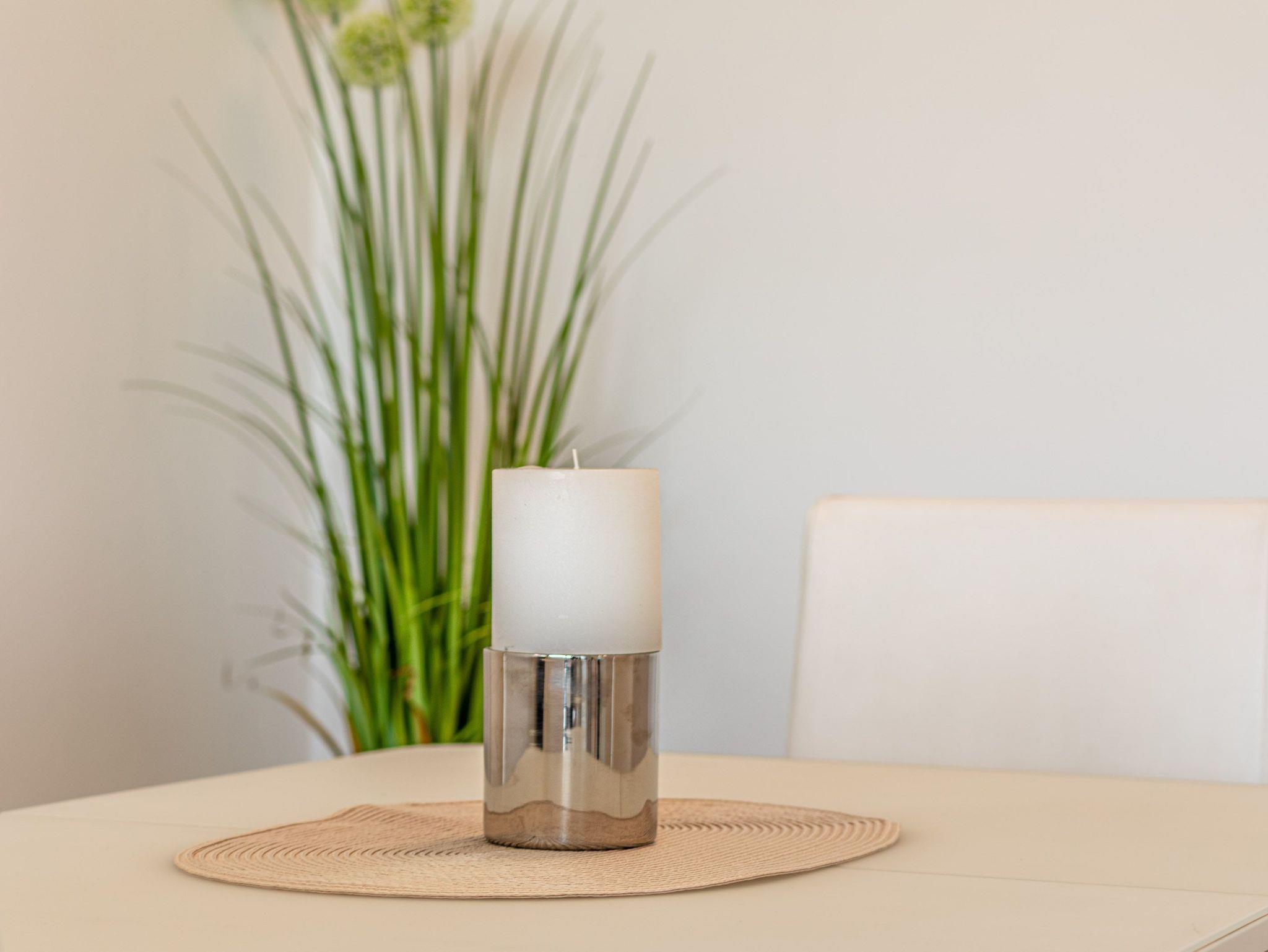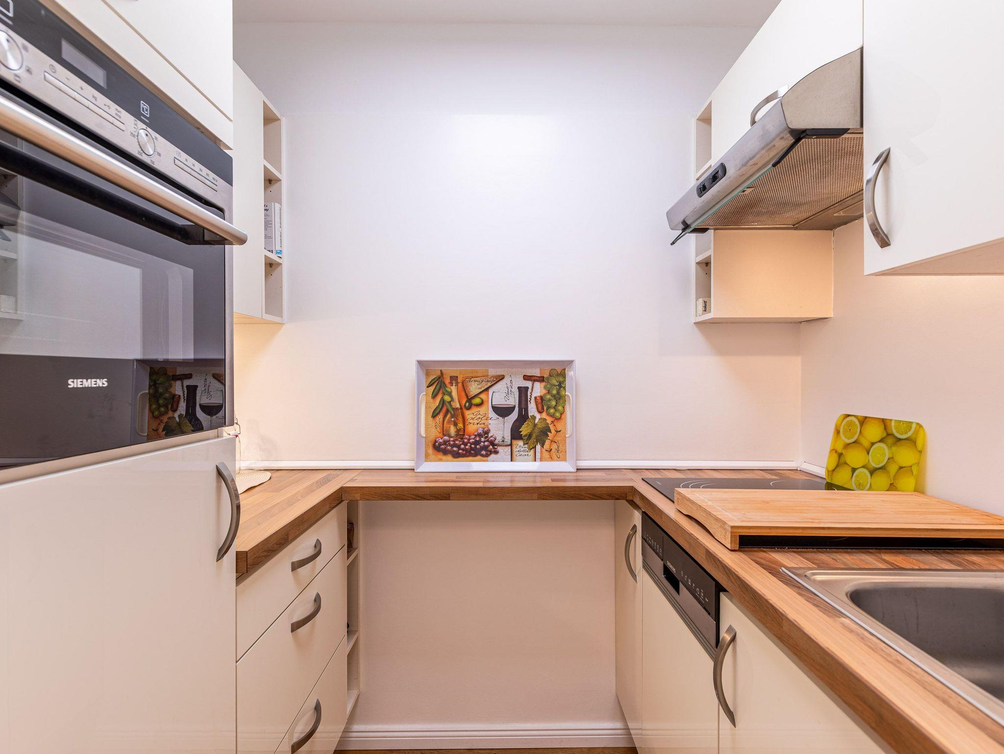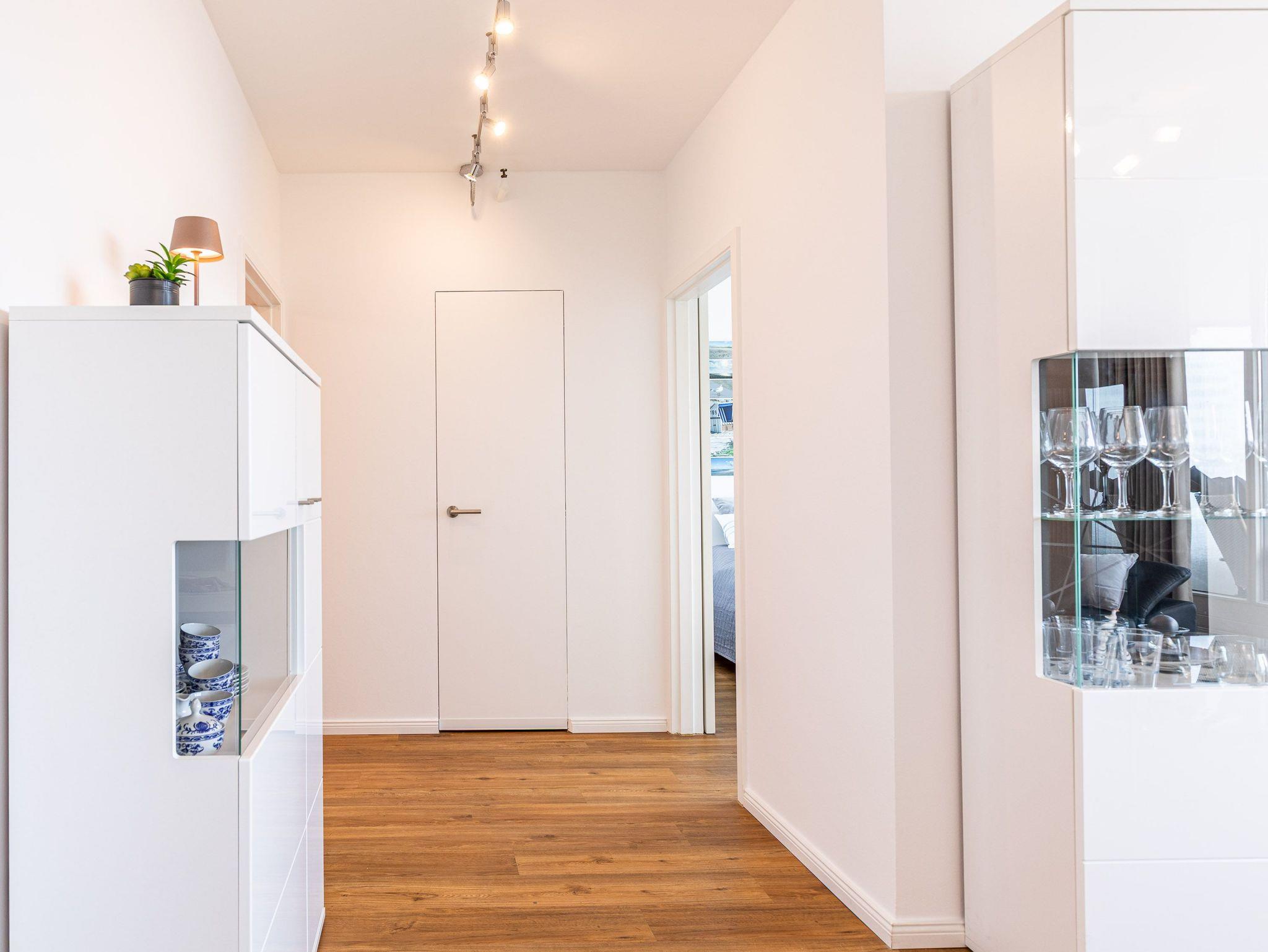 Die moderne Küche mit Geschirrspüler, Mikrowelle und Backofen lässt keine Wünsche offen. Im gemütlichen Wohnbereich mit Couchgarnitur und Essecke können Sie entspannen, das Schlafzimmer mit komfortablem Doppelbett (180 × 200 cm) verspricht erholsame Nächte. Vom Wohn- und Schlafzimmer gelangen Sie direkt auf den Balkon, um den Blick auf Meer und Strand zu genießen.