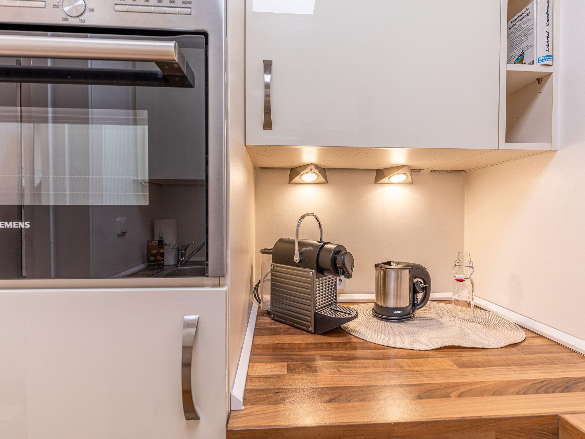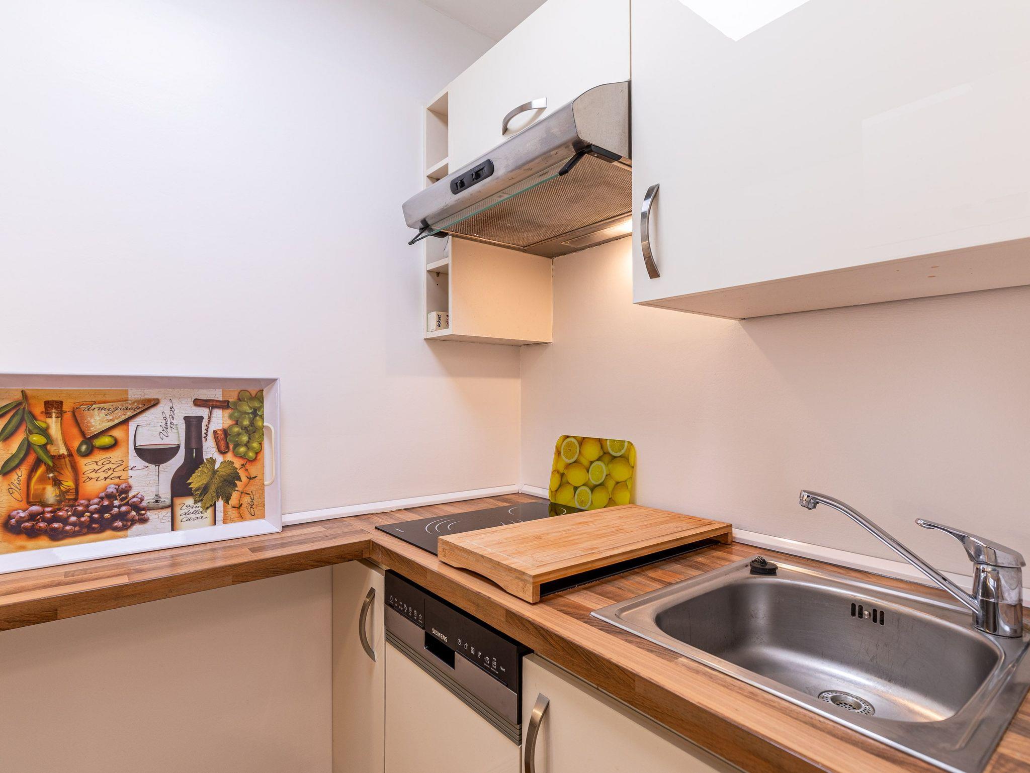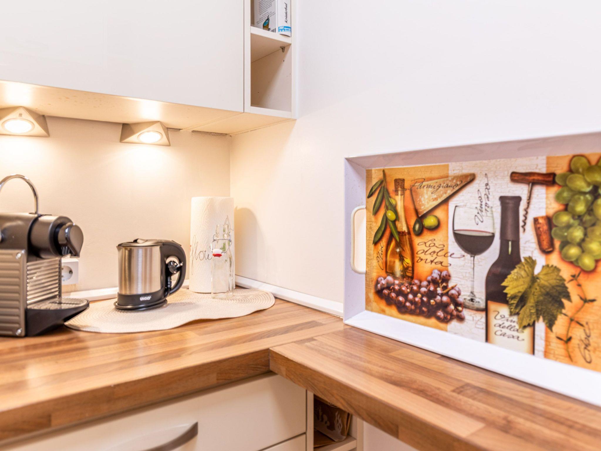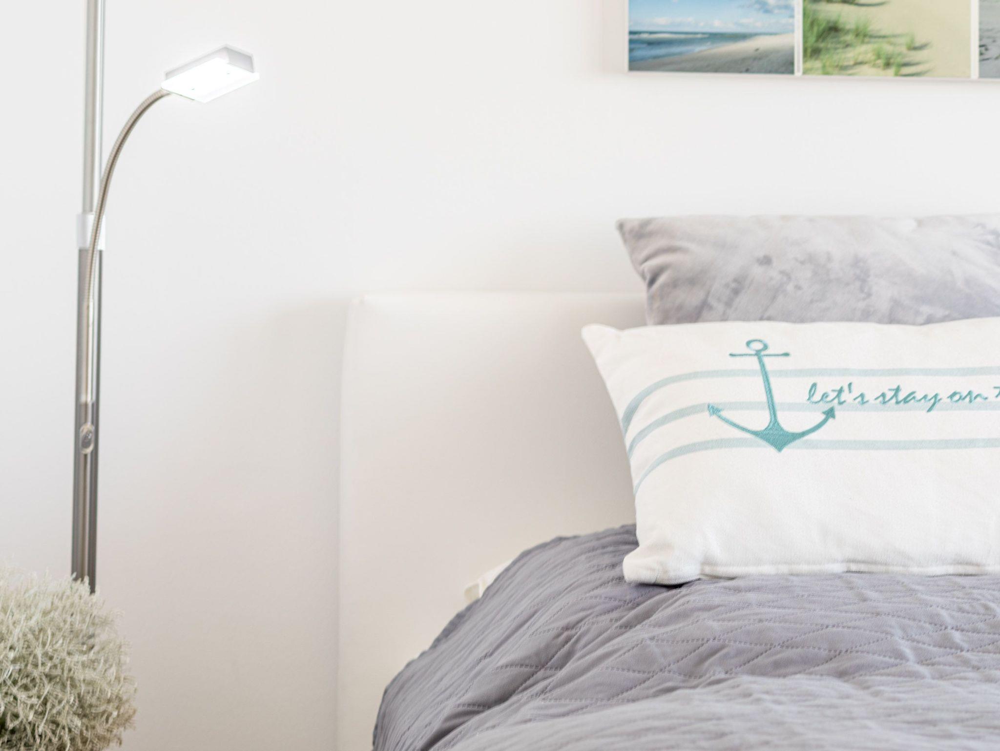 Die moderne Küche mit Geschirrspüler, Mikrowelle und Backofen lässt keine Wünsche offen. Im gemütlichen Wohnbereich mit Couchgarnitur und Essecke können Sie entspannen, das Schlafzimmer mit komfortablem Doppelbett (180 × 200 cm) verspricht erholsame Nächte. Vom Wohn- und Schlafzimmer gelangen Sie direkt auf den Balkon, um den Blick auf Meer und Strand zu genießen.