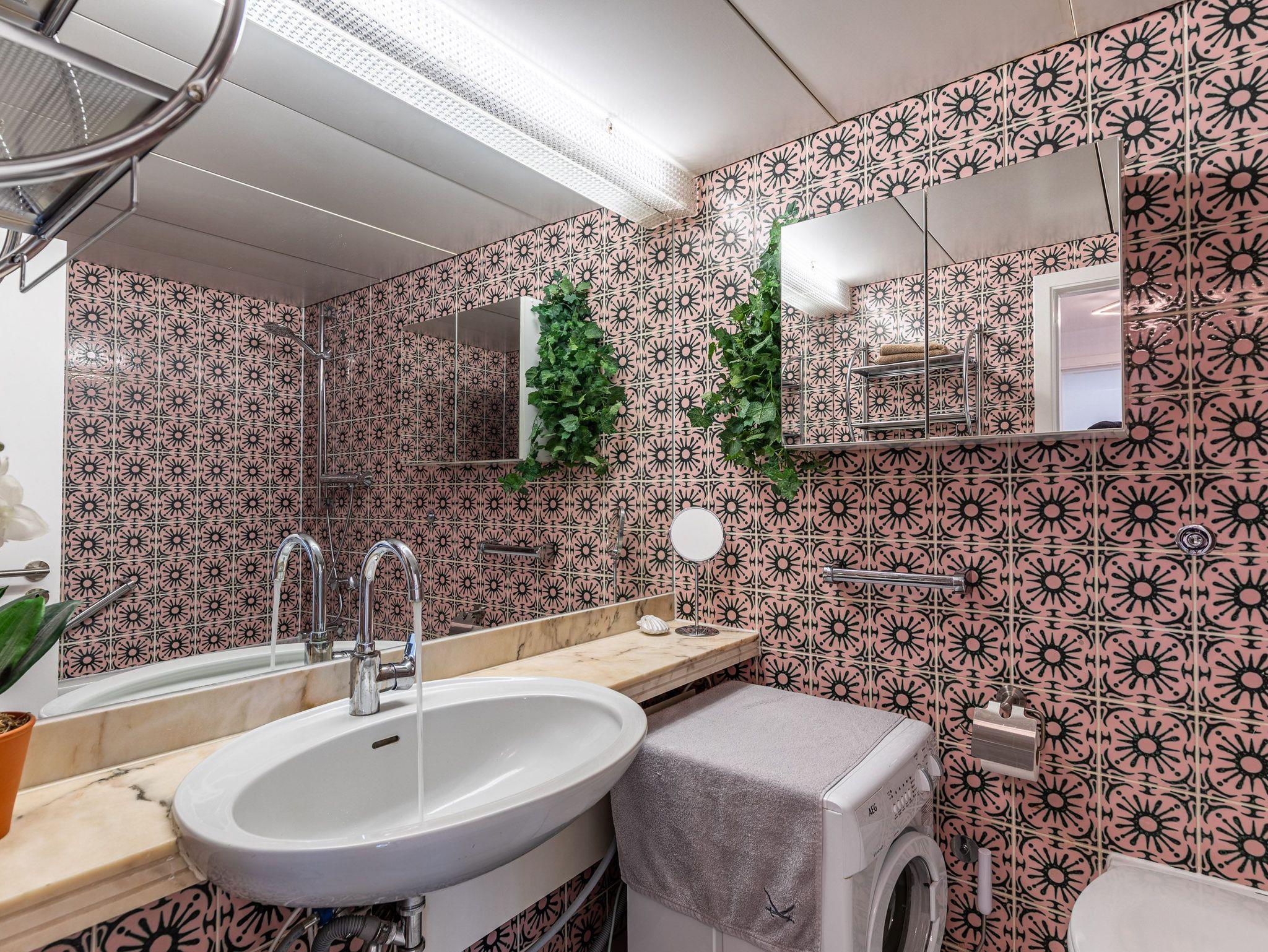 Das Bad mit Vollwanne, WC und Föhn sorgt für Komfort, ebenso wie kostenfreies WLAN, TV, Waschmaschine, Aufzug und ein eigener Tiefgaragenstellplatz (Einfahrtshöhe 1,85 m).