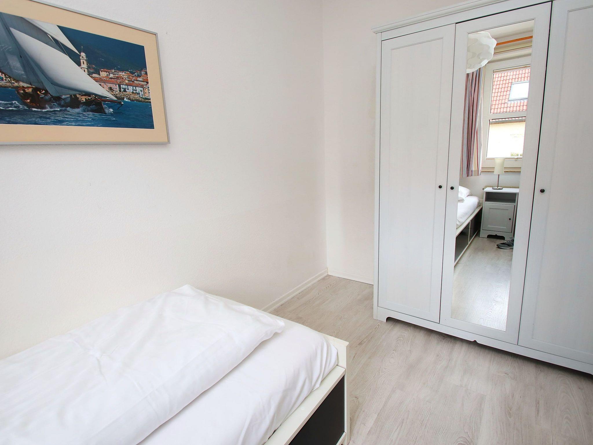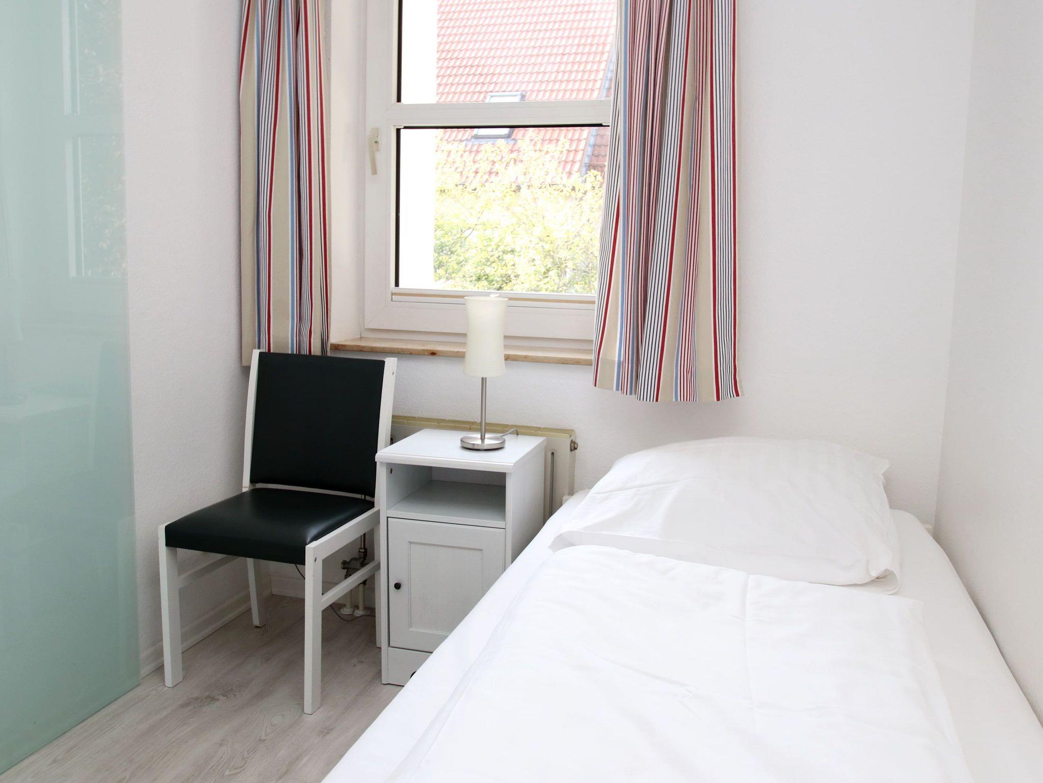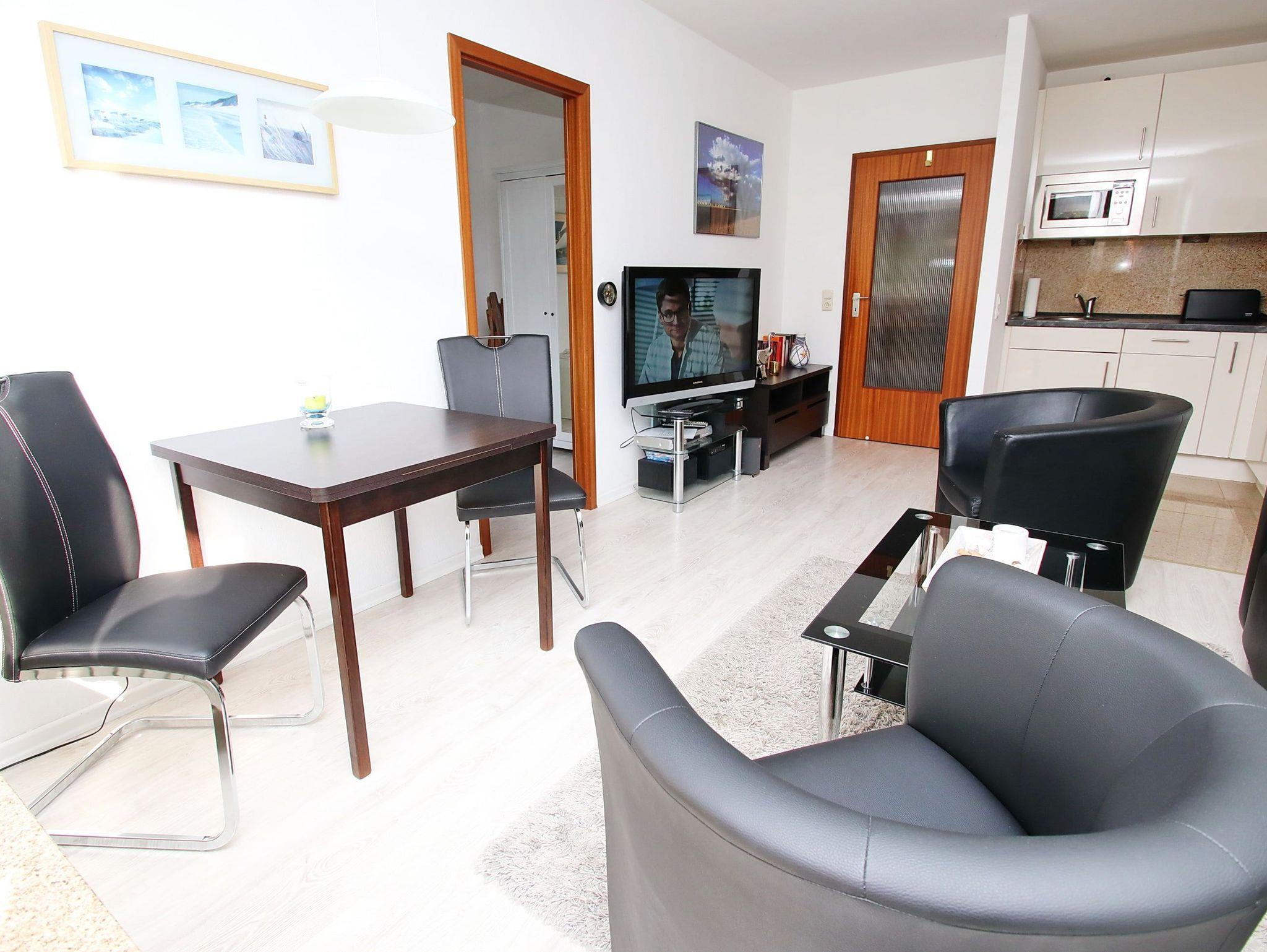 Dieses Appartement besticht mit seiner ruhigen, zentralen und strandnahen Lage in der Kaiserallee. Im Flurbereich, von dem links das Duschbad und rechts das erste Schlafzimmer abgeht, befindet sich ein kleiner und ein etwas größerer Einbauschrank. In dem ersten Schlafzimmer erwartet sie ein bequemes Doppelbett (140 cm x 200 cm) und ein kleiner TV mit DVD-Player. Gerade aus gelangen Sie direkt in den offenen, hellen Wohnbereich, der mit einer gemütlichen dreiteiligen Couchgarnitur, einer Essecke am Fenster und einer modernen Einbauküche ausgestattet ist. Das zweite, vom Wohnbereich abgehende, Schlafzimmer verfügt über ein komfortables Einzelbett (90 cm x 200 cm) und einen Kleiderschrank. Der sonnige Südbalkon lädt zum Verweilen ein.