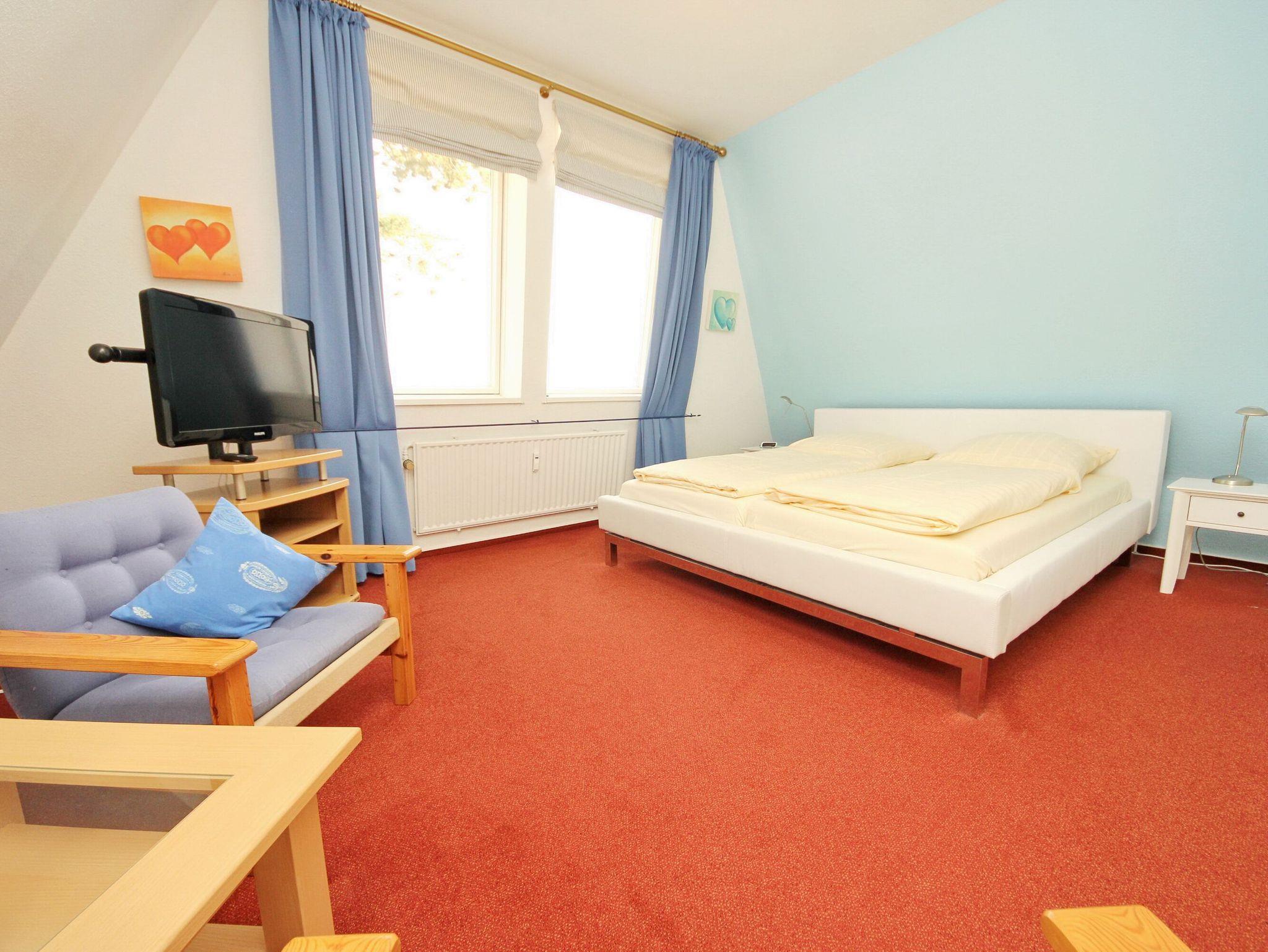 Dieses empfehlenswerte Appartement gehört mit seiner Lage in erster Reihe an der Strandpromenade und Strand mit herrlichem Meerblick zu den absoluten Highlights. Vom Wohnungseingang im Flur kommen Sie in den Wohnraum und zum sonnigen Balkon. Hier erleben Sie den Kaiserblick pur. Auf der linken Seite im Wohnzimmer befindet sich eine Essecke neben der modernen Einbauküche. In der zweiten Wohnraumhälfte, rechts, stehen eine bequeme Couch mit einem Tisch und einem Sessel zum Relaxen. Das Schlafzimmer, ebenfalls mit Meerblick, erreichen Sie durch eine Treppe im Flurbereich. Dort finden Sie ein Doppelbett (2x 90 cm x 200 cm), einen Einbaukleiderschrank und eine kleine Sitzgruppe vor. Das modernisierte Bad befindet sich nur ein paar Stufen höher und lässt keine Wünsche offen. Den Strand erreichen Sie durch einen direkten Zugang am Haus.