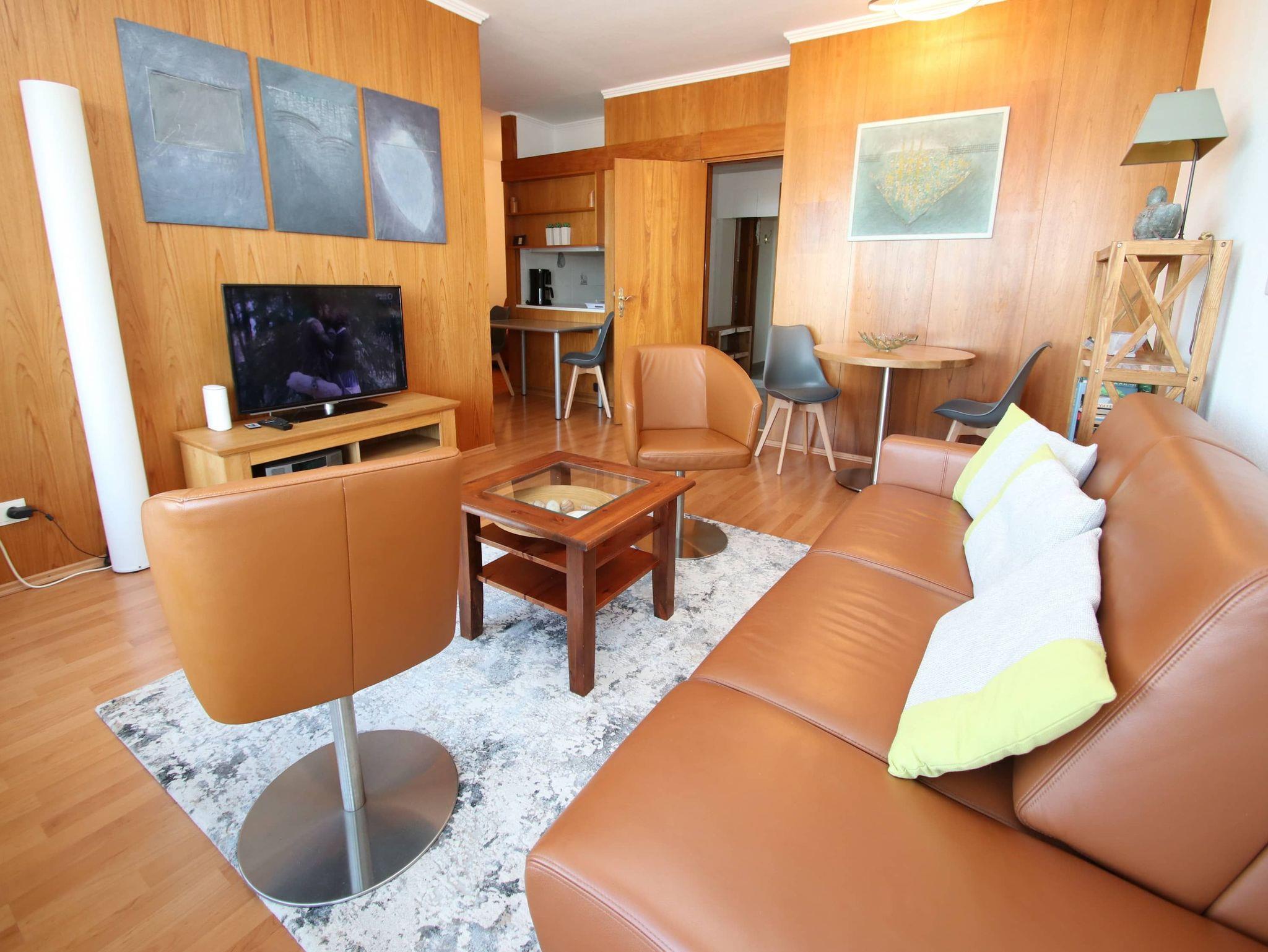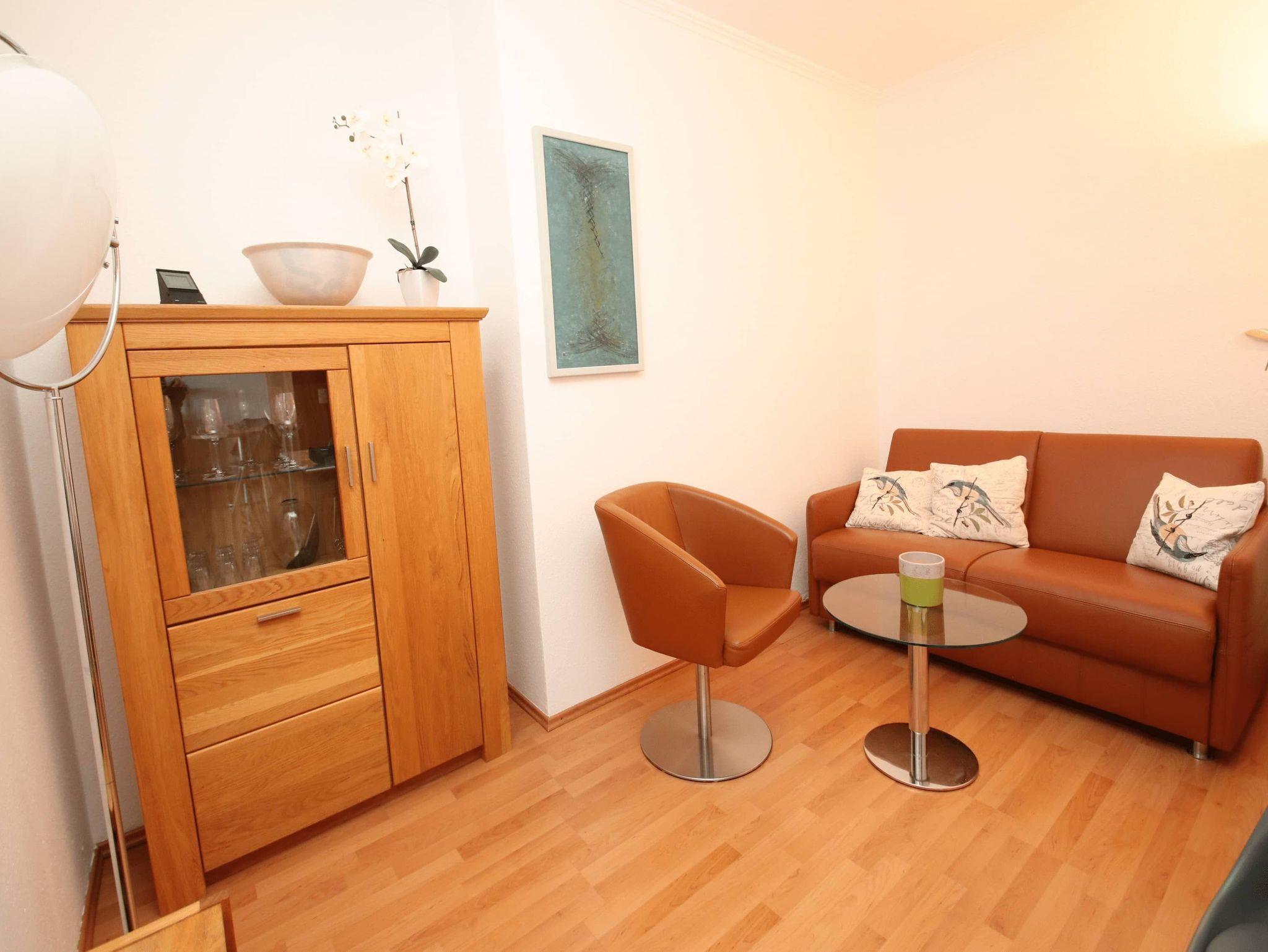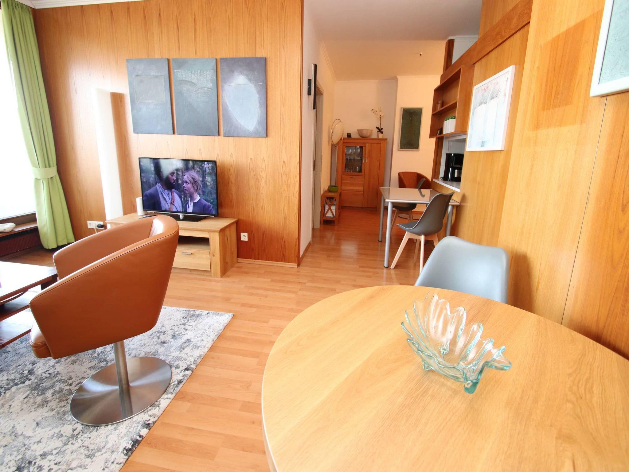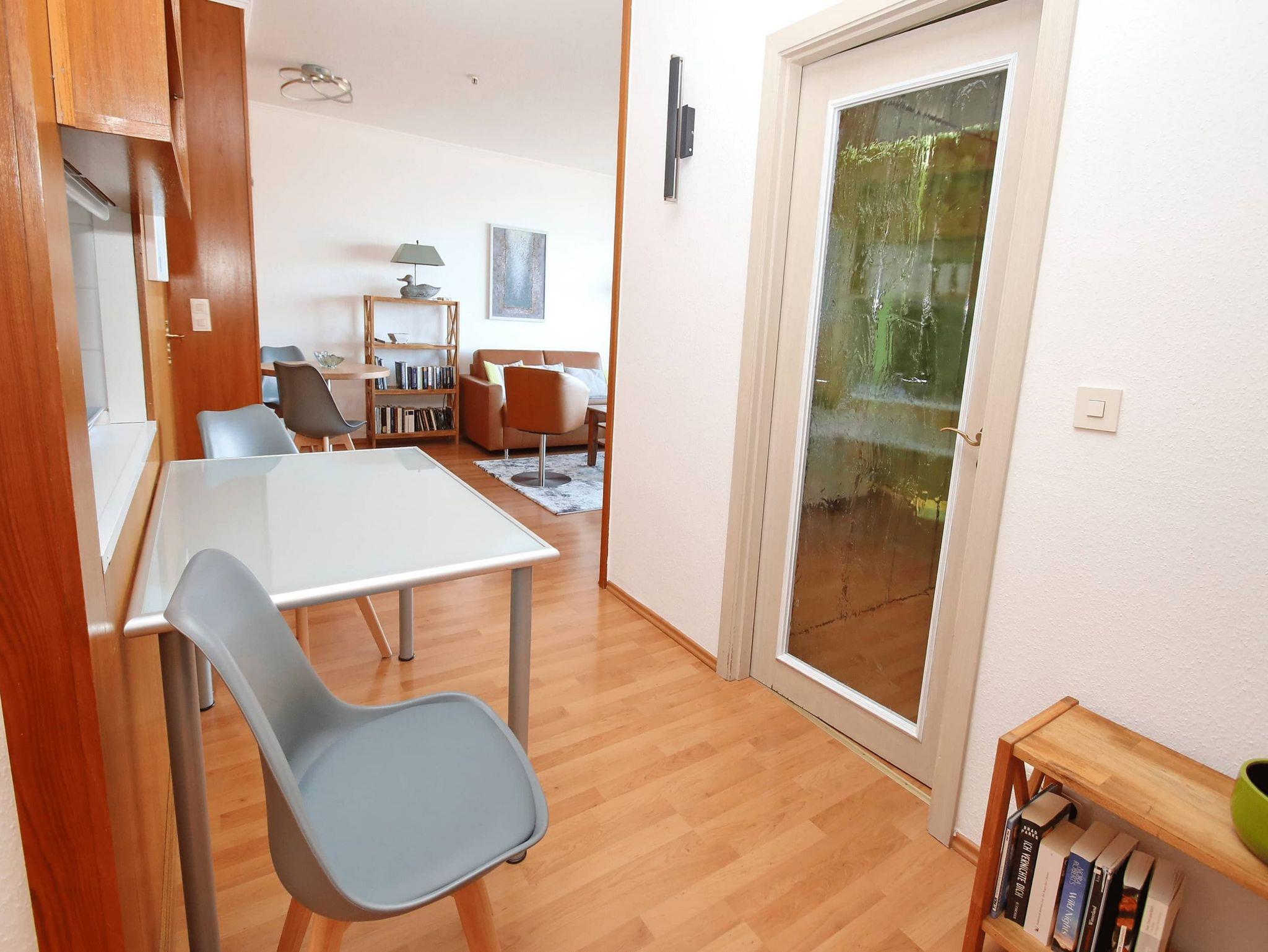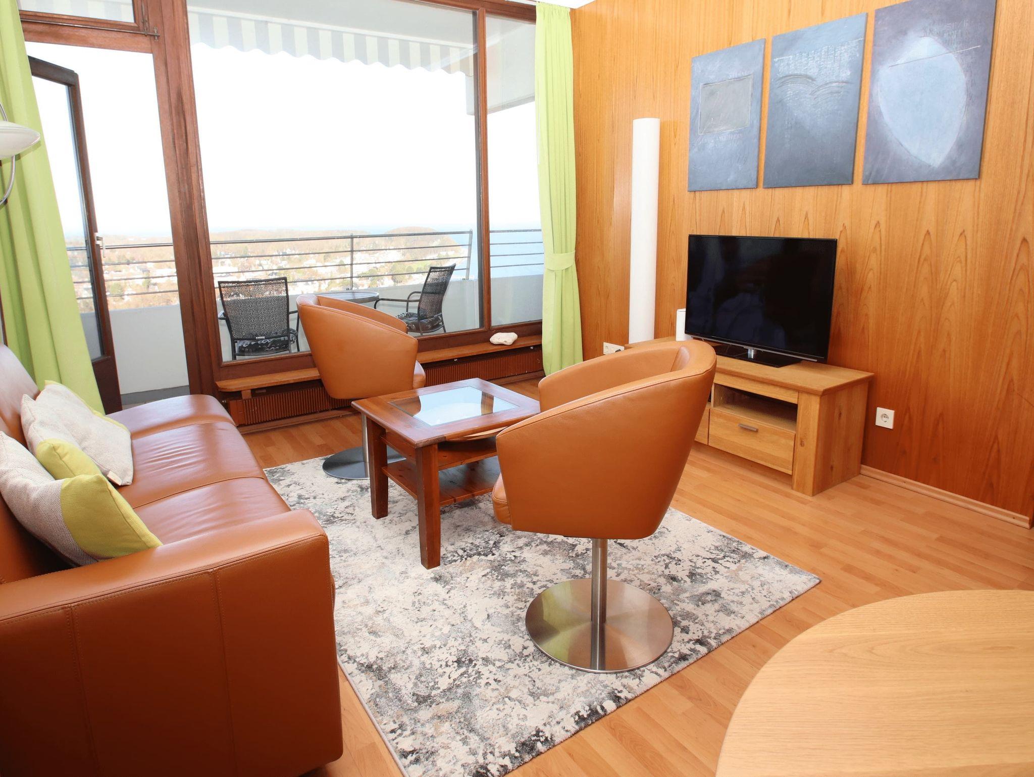 Modern, komfortabel und geschmackvoll ist dieses helle Appartement für einen erholsamen Urlaubsaufenthalt eingerichtet. Im Wohnraum steht eine bequeme Ledercouch mit passenden Sesseln, ein Tisch, eine helle Anrichte und ein schöner Glasvitrinen Schrank. Im großen Schlafzimmer befinden sich ein Doppelbett (2x 90 cm x 200 cm) und eine geräumige Kleiderschrankwand. Eine Sitz-/Schlafcouch (120 cm x 200 cm) in der Wohnraumnische lädt auch zum Ausruhen, Lesen und Relaxen ein. Die vom Flur abgehende Küche und der davor gelegene Essplatz sind durch eine große und überraschend praktische Durchreiche verbunden. Das Bad geht vom Flur ab. Liebevolle Dekorationen, moderne Bilder sowie geschmackvolle Gardinen mit Verdunklungsmöglichkeit sorgen dafür, dass Sie sich wohlfühlen werden. Auch Ihr Vierbeiner ist in diesem Appartement herzlich willkommen. Einen traumhaften Meerblick auf die Lübecker Bucht genießen Sie vom großen Balkon.