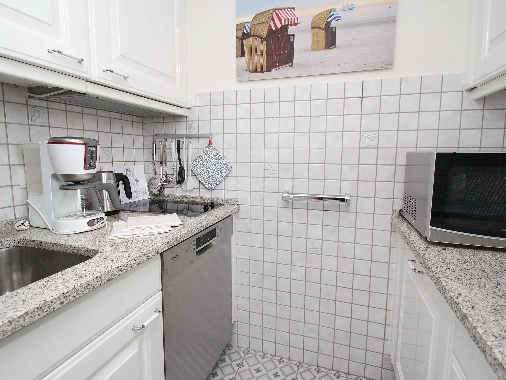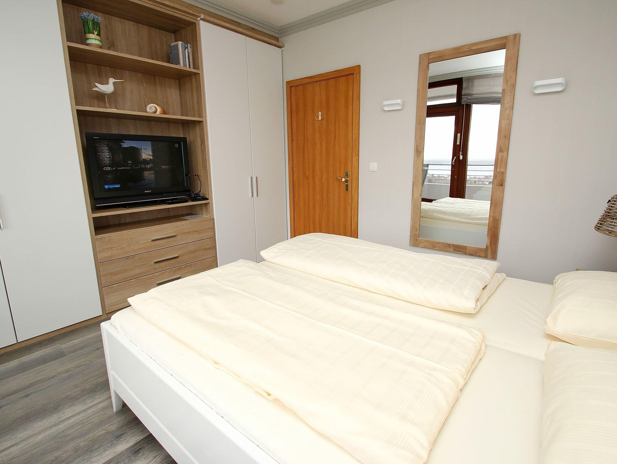 Balkon, Markise, Küche, Geschirrspüler, Mikrowelle, Vollbad/WC, Fön, 2x TV, DVD, Stereoradio mit CD, kostenl. W-Lan, Aufzug, inkl. Tiefgaragenstellplatz (Einfahrtshöhe: 1,85 m).