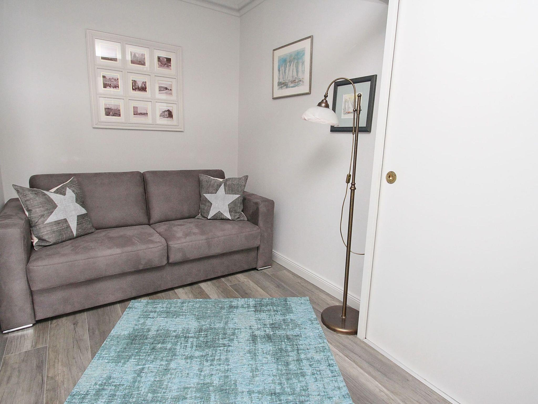 Diese liebevoll dekorierte Wohnung ist bis ins kleinste Detail hervorragend ausgestattet. Im Wohnzimmer befinden sich eine gemütliche Couch mit Ottomane und ein Tisch. Die weitere Einrichtung besteht aus einer schönen Anrichte und einem Esstisch mit vier Stühlen. Abgehend vom Wohnzimmer finden Sie in der Wohnraumnische eine Sitz-/Schlafcouch (155 cm x 200 cm) vor. Im Schlafzimmer erwarten Sie ein hochwertiges Doppelbett (2x 90 cm x 200 cm) und ein Kleiderschrank. In das moderne Bad sowie in die Küche mit Durchreiche zum Wohnzimmer, gelangen Sie vom Flur aus. Den sonnigen Balkon erreichen Sie von beiden Wohnräumen. Hier genießen Sie einen herrlichen Panoramablick auf die Trave mit der Passat und lebhaftem Schiffsverkehr, zur Lübecker Bucht sowie zum Hafen.
