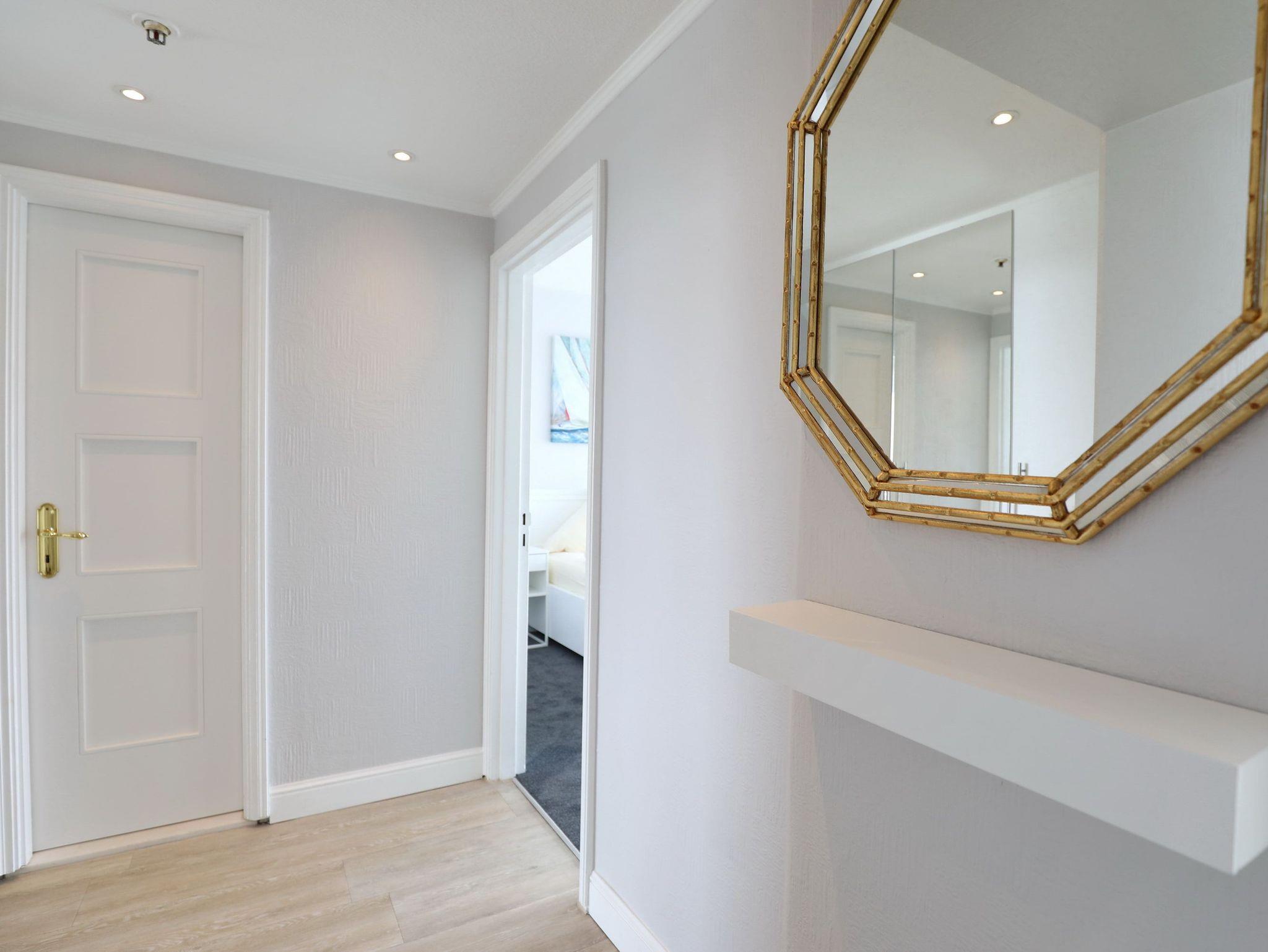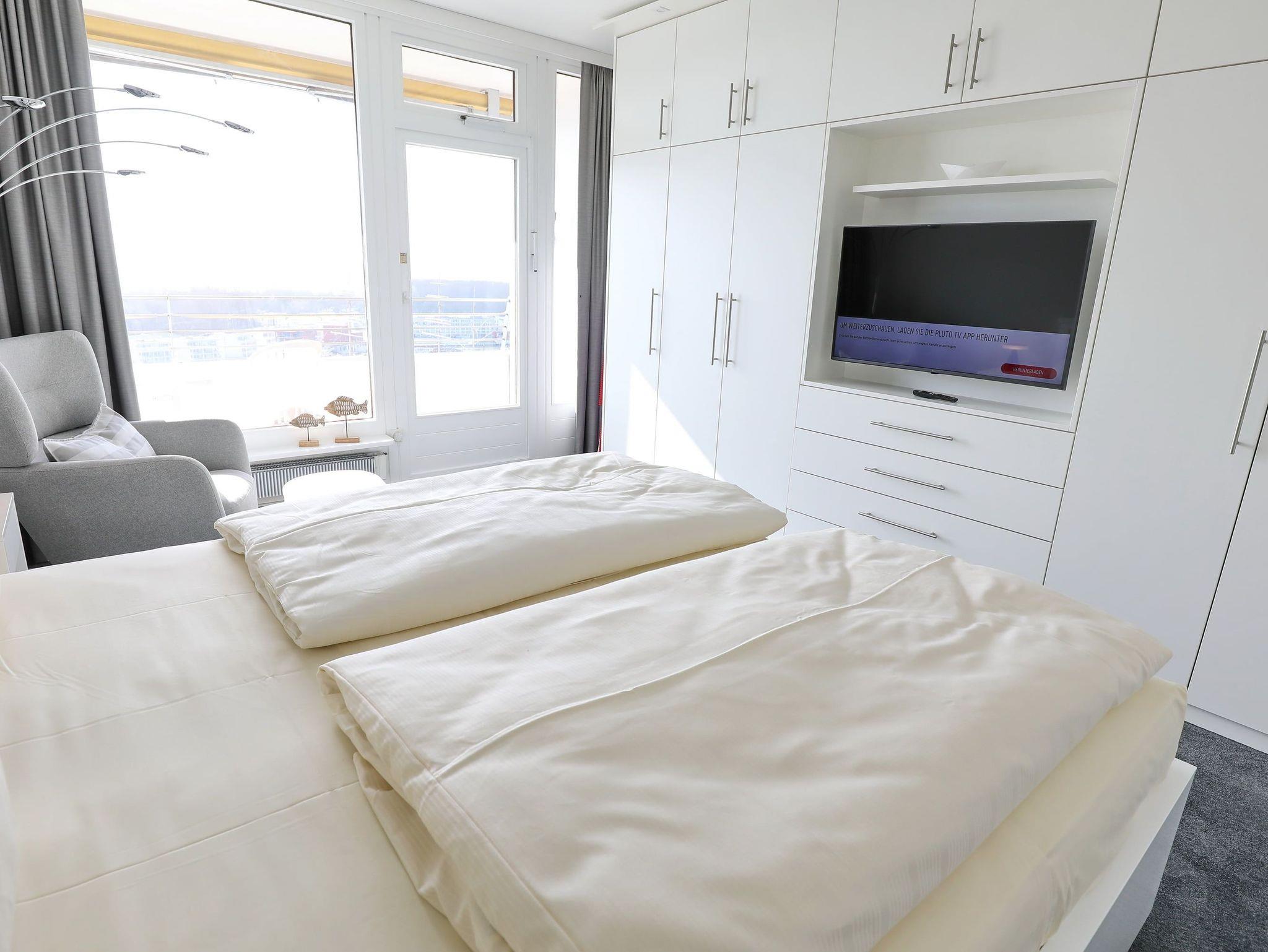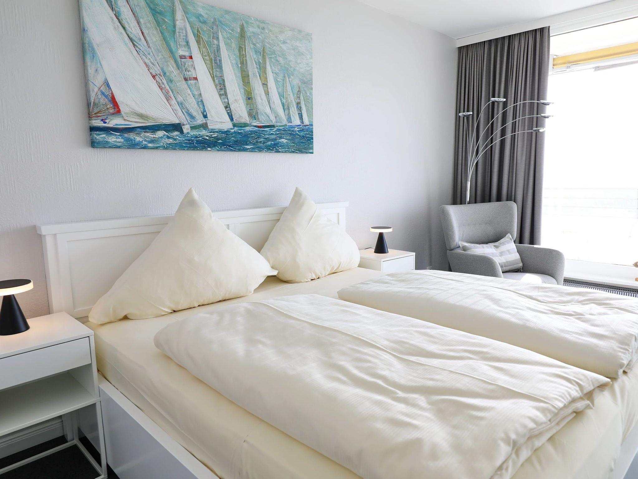 Dieses elegante und komfortable Appartement bietet für höchste Ansprüche ein Wohnfühlerlebnis zum Entspannen fern des Alltags. In dieser großzügigen hellen Wohneinheit, mit großer Fensterfront im Wohnzimmer stehen zwei bequeme Couchgarnituren mit passendem Couchtisch sowie ein schicker Esstisch mit Stühlen. Die moderne Küche, mit Durchreiche zum Esstisch, lässt keine Wünsche offen. Im Schlafzimmer erwarten Sie ein schönes Doppelbett (2x 90 cm x 200 cm) und eine Kleiderschrankwand mit einem Relaxsessel vor dem Fenster. Weitere schöne Dekorationen laden zum Wohlfühlen ein. Den sonnigen Eckbalkon erreichen Sie von beiden Wohnräumen, um den Blick zur Trave mit lebhaftem Schiffsverkehr und Altstadt bis zum Skandinavienkai zu erleben.