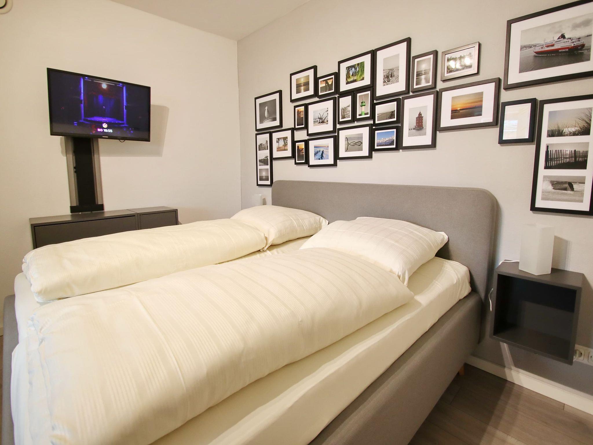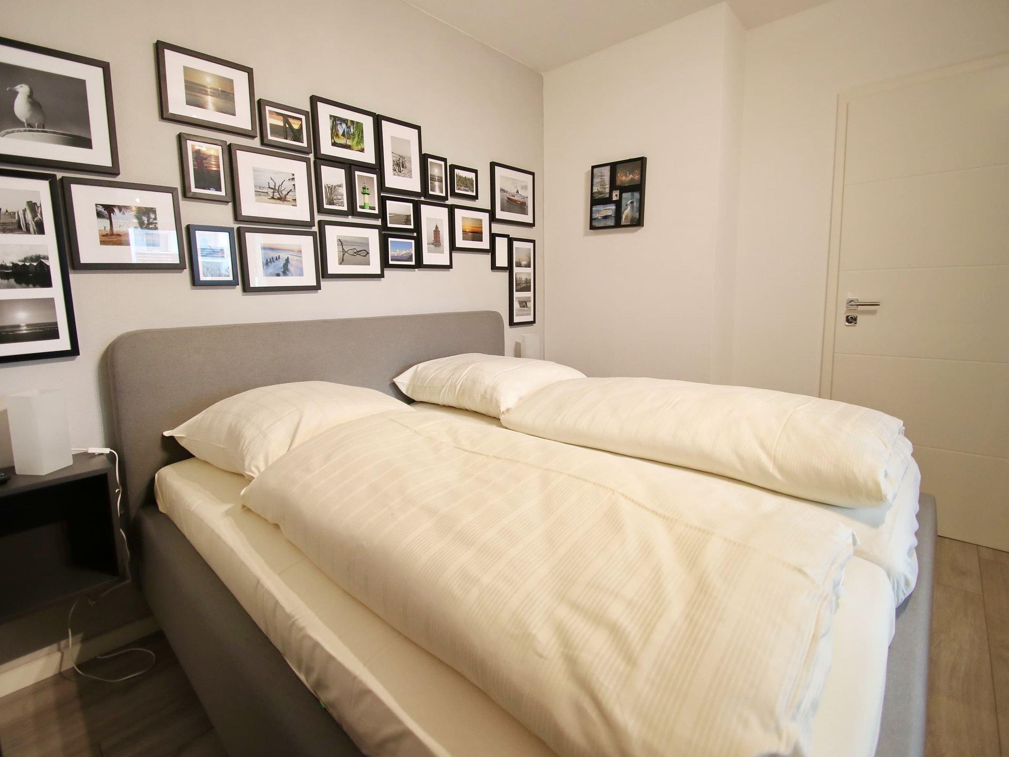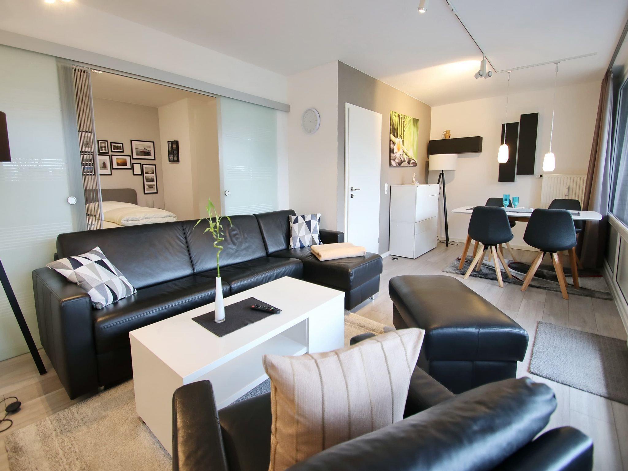 Die gesamte Einrichtung dieser modernen Ferienwohnung ist hochwertig und farblich aufeinander abgestimmt. Durch den Flur geradeaus erreichen Sie den hellen, stets lichtdurchfluteten Wohnbereich mit einer Essecke und einem gemütlichem Ledersofa mit integrierter Schlaffunktion (1,60 x 2,00). Vom Flur geht die Küche sowie auch das Bad mit bodengleicher Dusche ab. Das gemütliche Schlafzimmer mit großer Glasschiebetür zum Wohnraum hat eine Einrichtung mit unverwechselbarer Identität und Wohlfühlcharakter.