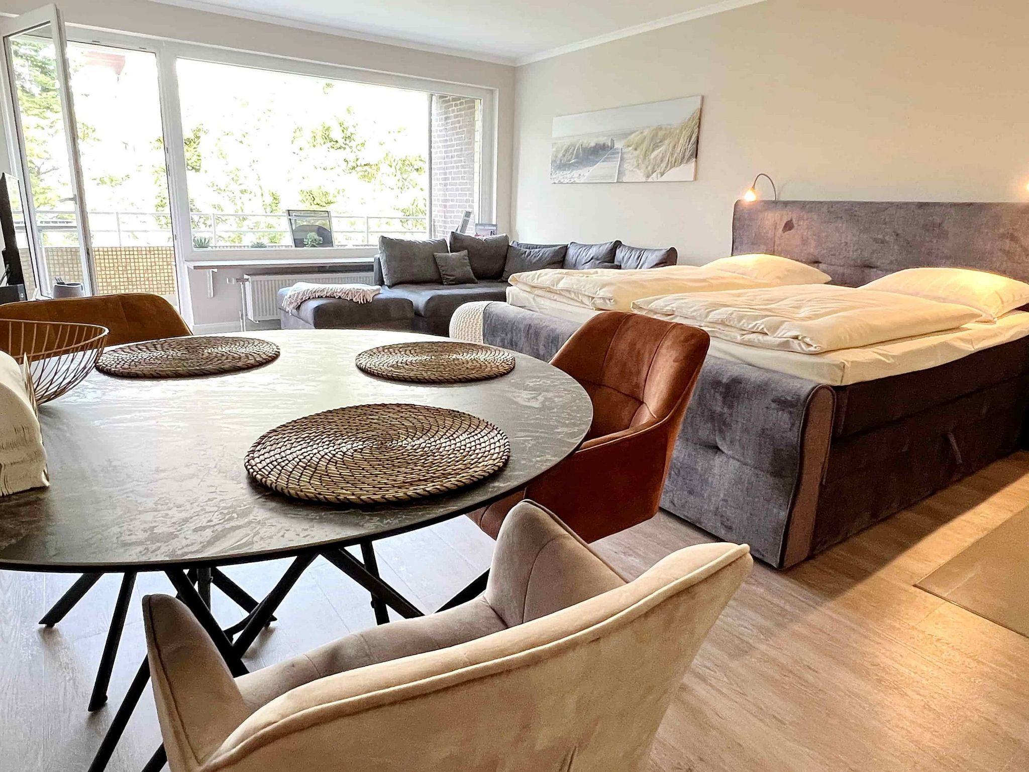 Modern renovierte 1-Zimmer-Ferienwohnung in Lübeck-Travemünde mit Balkon und Strandblick.