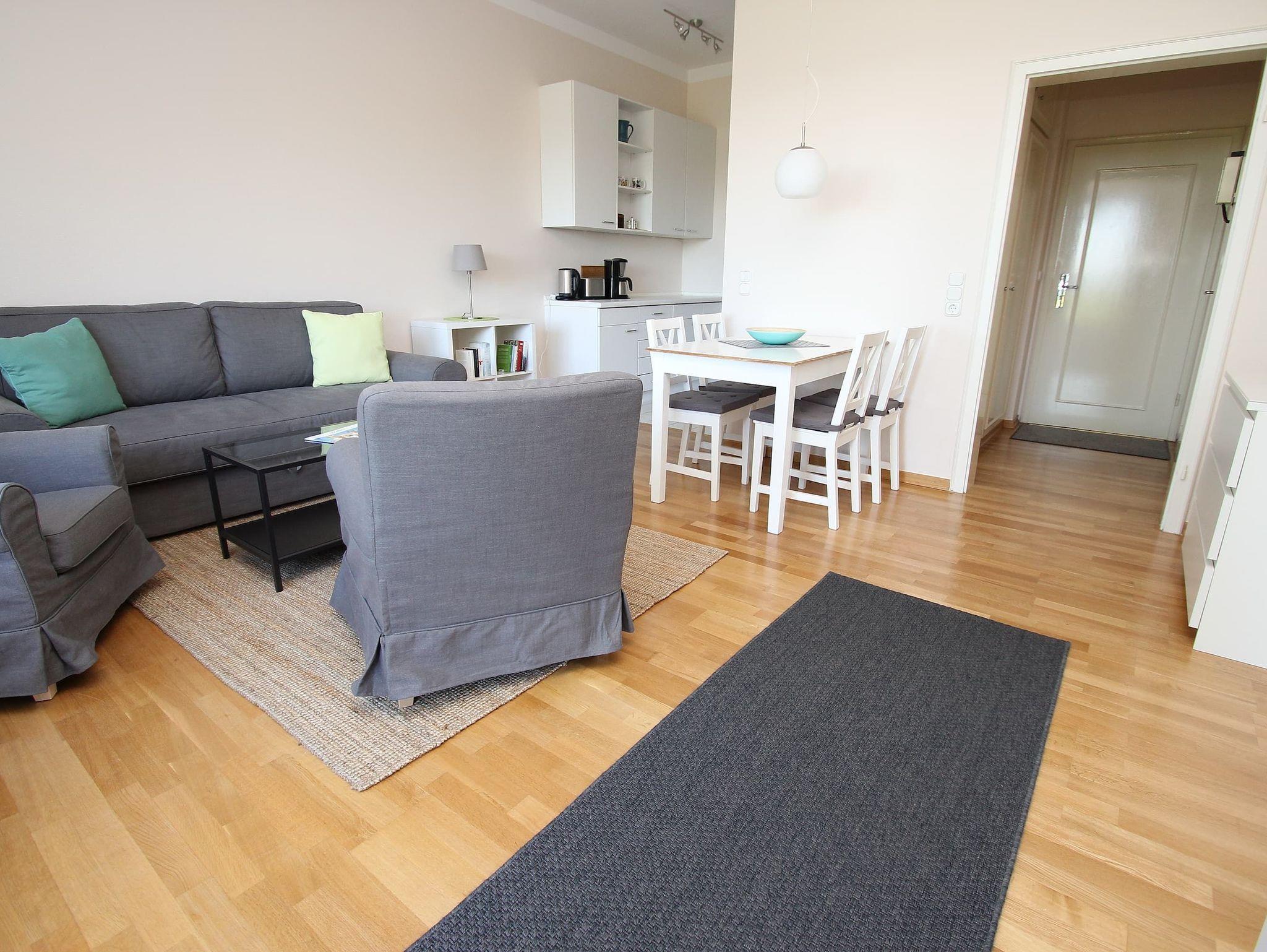 Terrasse, Außenjalousien, Küche, Geschirrspüler, Duschbad/WC, Fön, TV, Stereoanlage, kostenl. W-Lan, Aufzug, inkl. Tiefgaragenstellplatz (Einfahrtshöhe: 1,95 m).