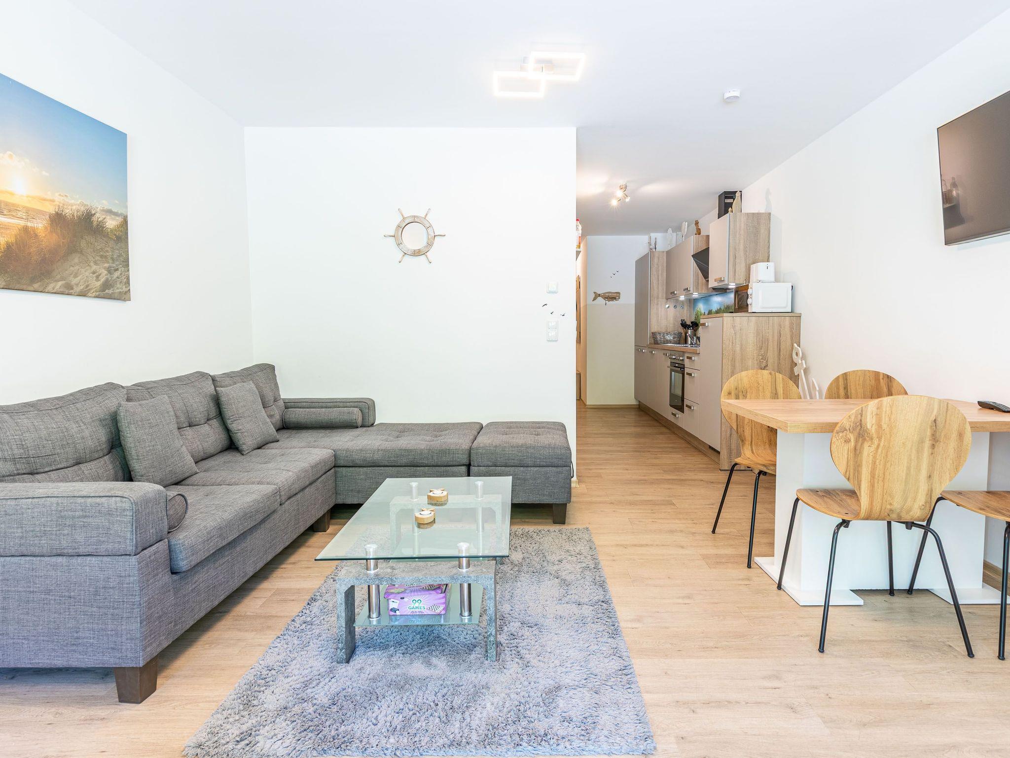 Freuen Sie sich auf diese exklusive Ferienwohnung mit reichlich Komfort. Die Ferienwohnungen im Haus Aaron sowie das Appartementhaus wurden im Jahr 2022 neu erbaut. Im hellen, und modern eingerichteten Wohnzimmer erwartet Sie eine gemütliche Couchgarnitur, einen Esstisch mit eleganten Stühlen, sowie eine komfortable offene Küche mit einem Geschirrspüler. Vom Wohnzimmer gelangen Sie auf die große Sonnen-Terrasse mit Ihrem privaten Strandkorb. Vom Flur dieser modernen Ferienwohnung erreichen Sie das große Schlafzimmer, welches über einen geräumigen Kleiderschrank sowie zwei Einzelbetten (90cmx200cm), diese können aber auch auseinander geschoben werden, verfügt. Im zweiten Schlafzimmer erwartet Sie ebenfalls ein Kleiderschrank und sowie ein Doppelbett (160cmx200cm). Die Ferienwohnung verfügt zusätzlich über zwei moderne Bäder, eins mit Dusche [&] WC und das zweite Badezimmer mit einer Badewanne [&] WC. Genießen Sie Ihren Urlaub in tollen Ambiente und mit exklusiver Ausstattung. Ihren PKW können Sie auf dem großen Grundstück auf der privaten Parkfläche abstellen. Eine Wallbox zum laden von E-Autos ist ebenfalls auf dem Gelände vorhanden und gegen Gebühr buchbar. Auch Ihr Vierbeiner ist in dieser Ferienwohnung herzlich Willkommen.