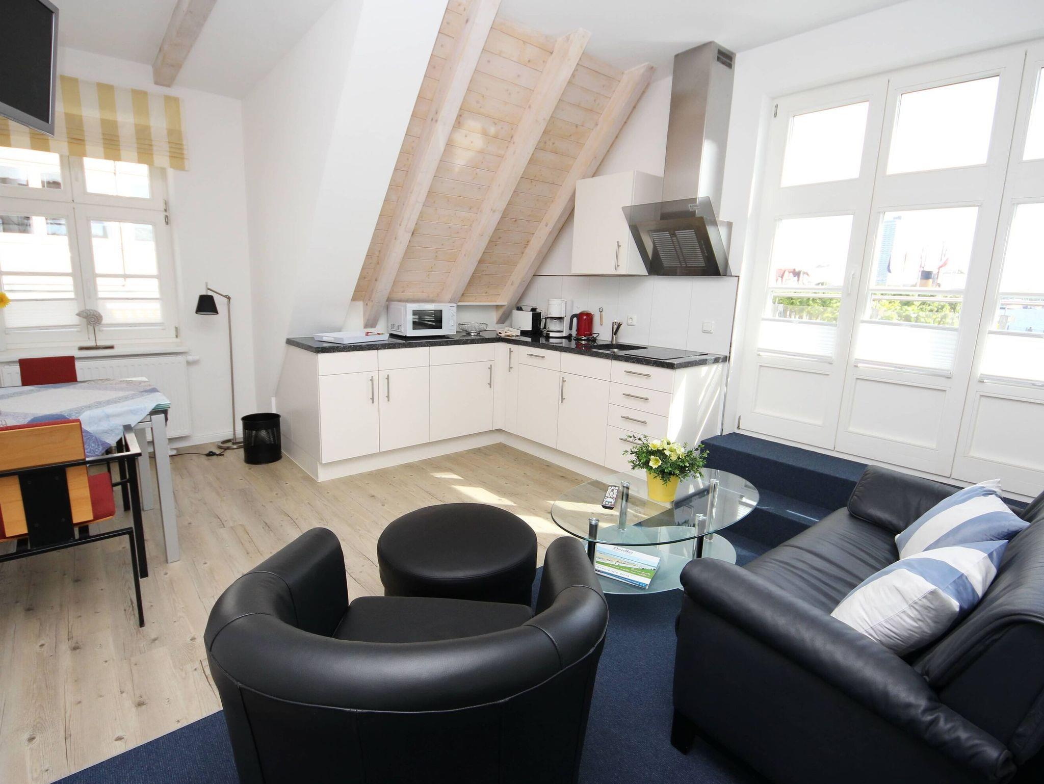 Zwei Dachterrassen (eine davon mit Strandkorb), Küchenzeile, Geschirrspüler, Mikrowelle, Duschbad/WC, Fön, TV, Stereoradio mit CD, kostenl. W-Lan, inkl. Außenstellplatz.