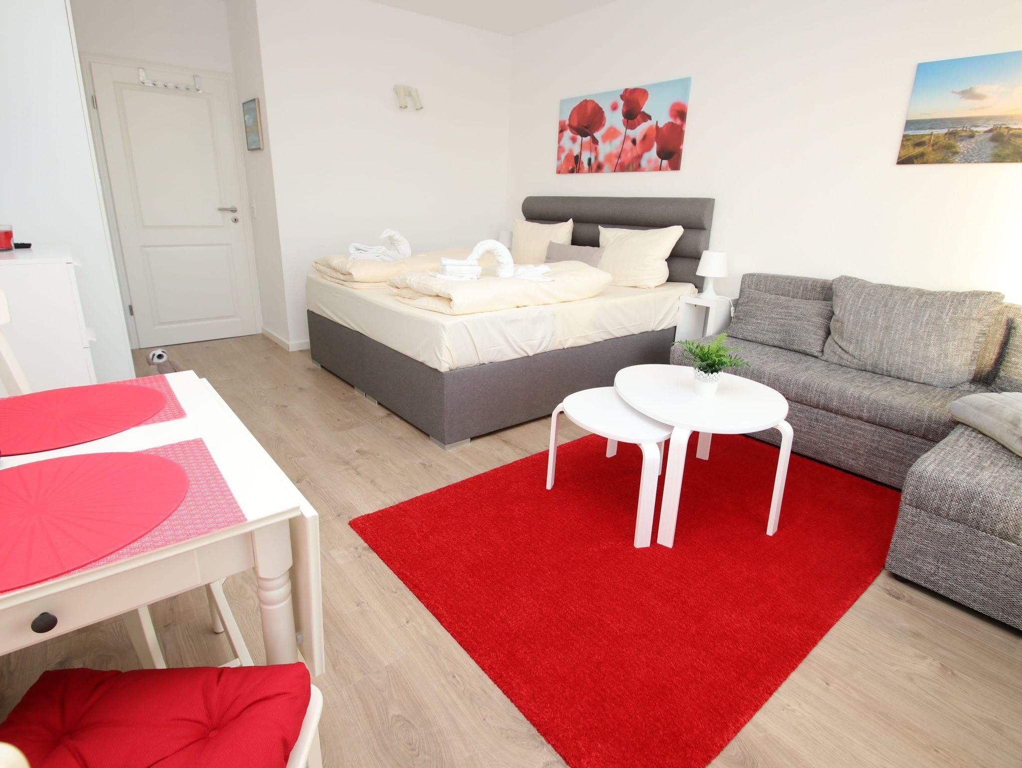 Dieses hochwertige Appartement entspricht allen Ansprüchen und lädt von Anfang an zum Wohlfühlen ein. Der helle Wohnraum besteht aus einem komfortablen Doppelbett (2 x 90 cm x 200 cm) und einer schönen Couch mit Tisch. Des Weiteren gehören zu der geschmackvollen Einrichtung eine Essecke mit Stühlen und ein Kleiderschrank. Der gesamte Wohnbereich ist mit einem Fußboden in Holzoptik ausgestattet. Die moderne Küche ist im Eingangsbereich integriert. Das luxuriöse Duschbad erreichen Sie vom Flur. Diese fantastische Wohnung bietet ideale Voraussetzungen für einen erholsamen Urlaub. Vom Balkon genießen Sie einen traumhaften Blick auf die Mecklenburger Bucht und auf die Trave mit ein- und ausfahrendem Schiffsverkehr.