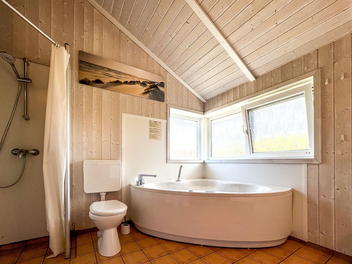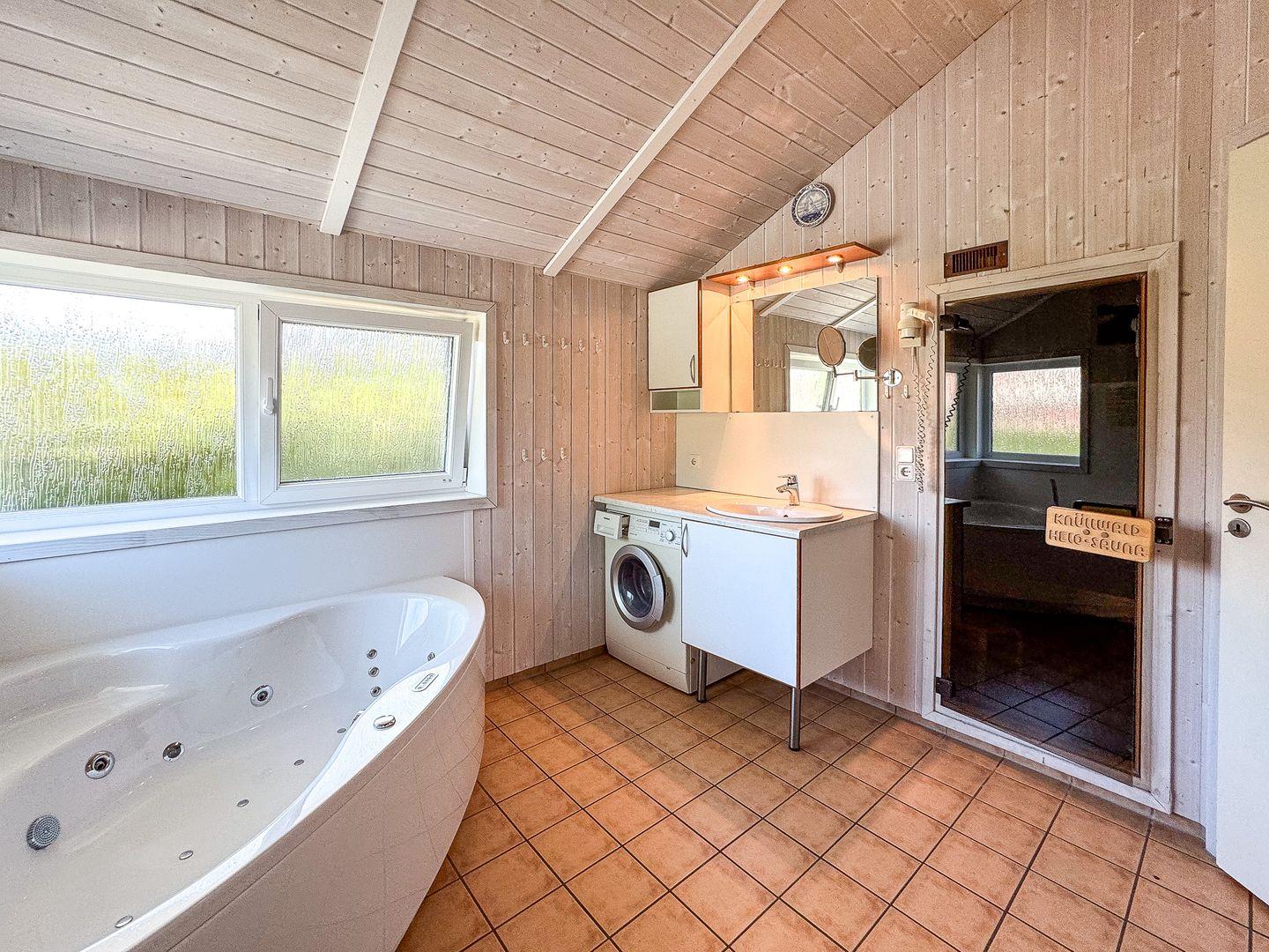 Das Badezimmer bietet eine Sauna, einen Whirlpool (für bis zu 2 Personen), eine bodengleiche Dusche, WC und ein Waschbecken.