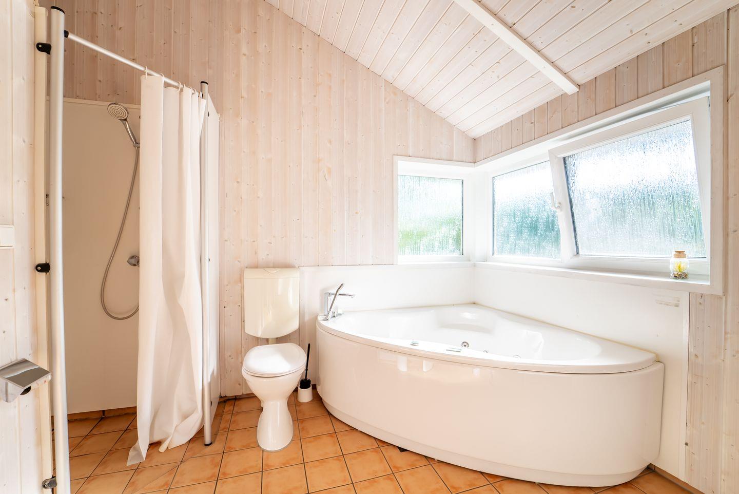 Das Badezimmer bietet eine Sauna, einen Whirlpool (für bis zu 2 Personen), eine bodengleiche Dusche, ein WC und ein Waschbecken.