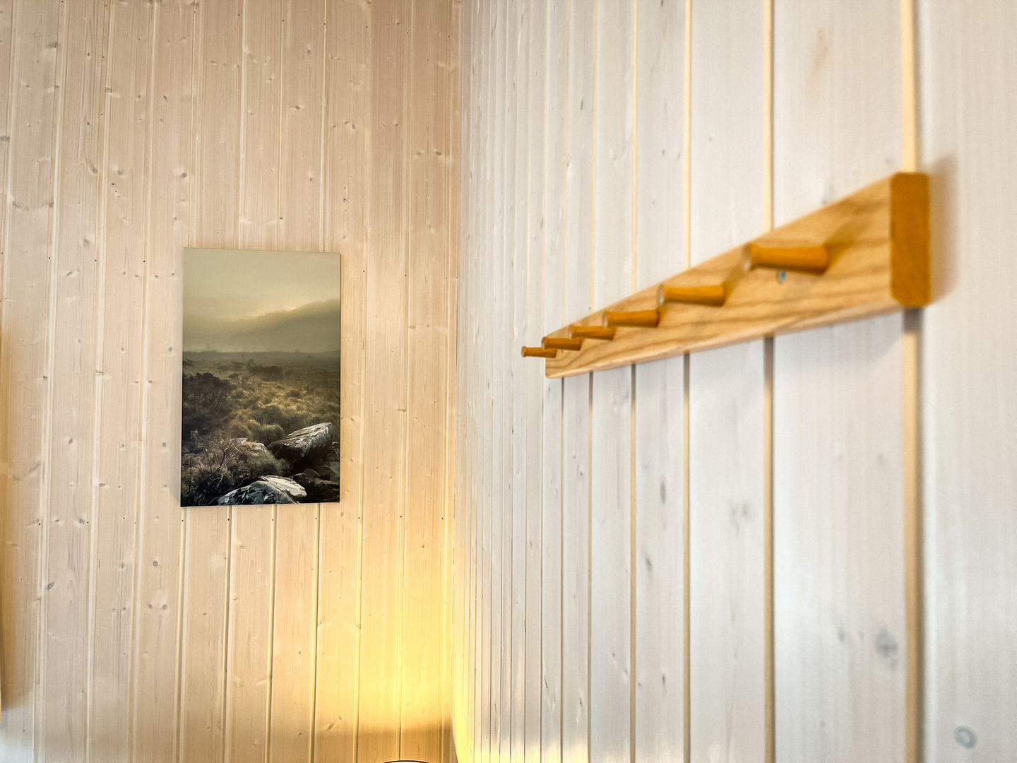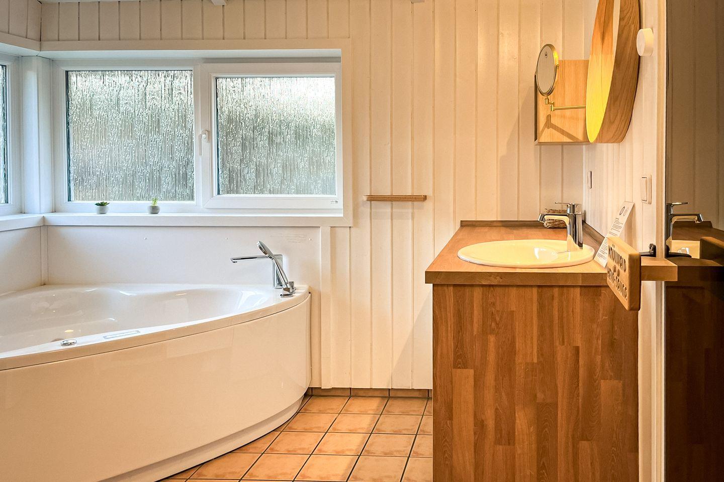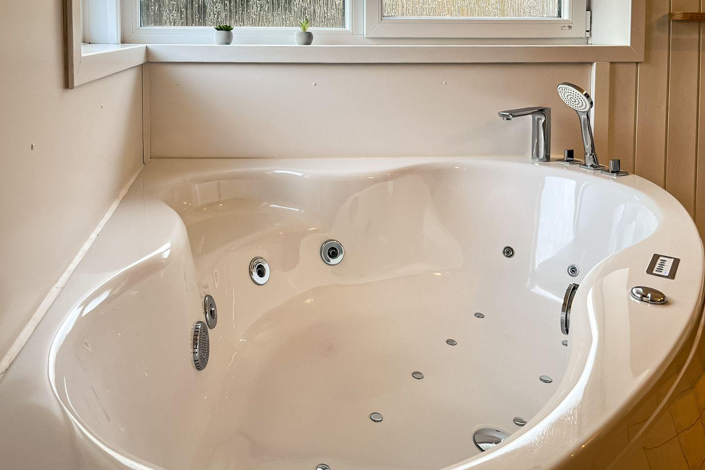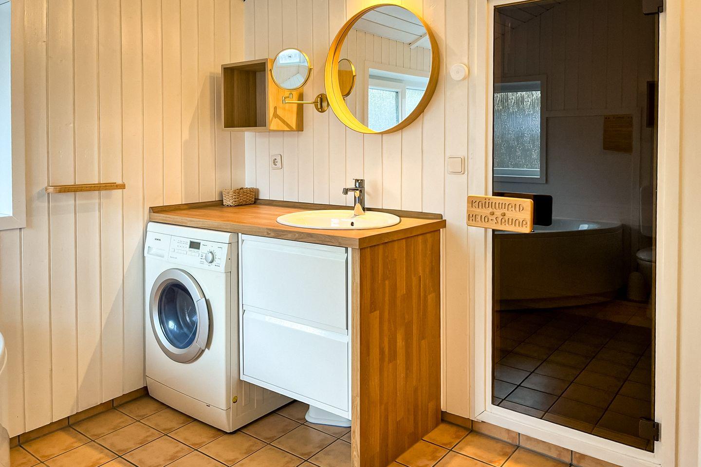 Das Badezimmer bietet eine Sauna, einen Whirlpool (für bis zu 2 Personen), eine bodengleiche Dusche, ein WC und ein Waschbecken.
