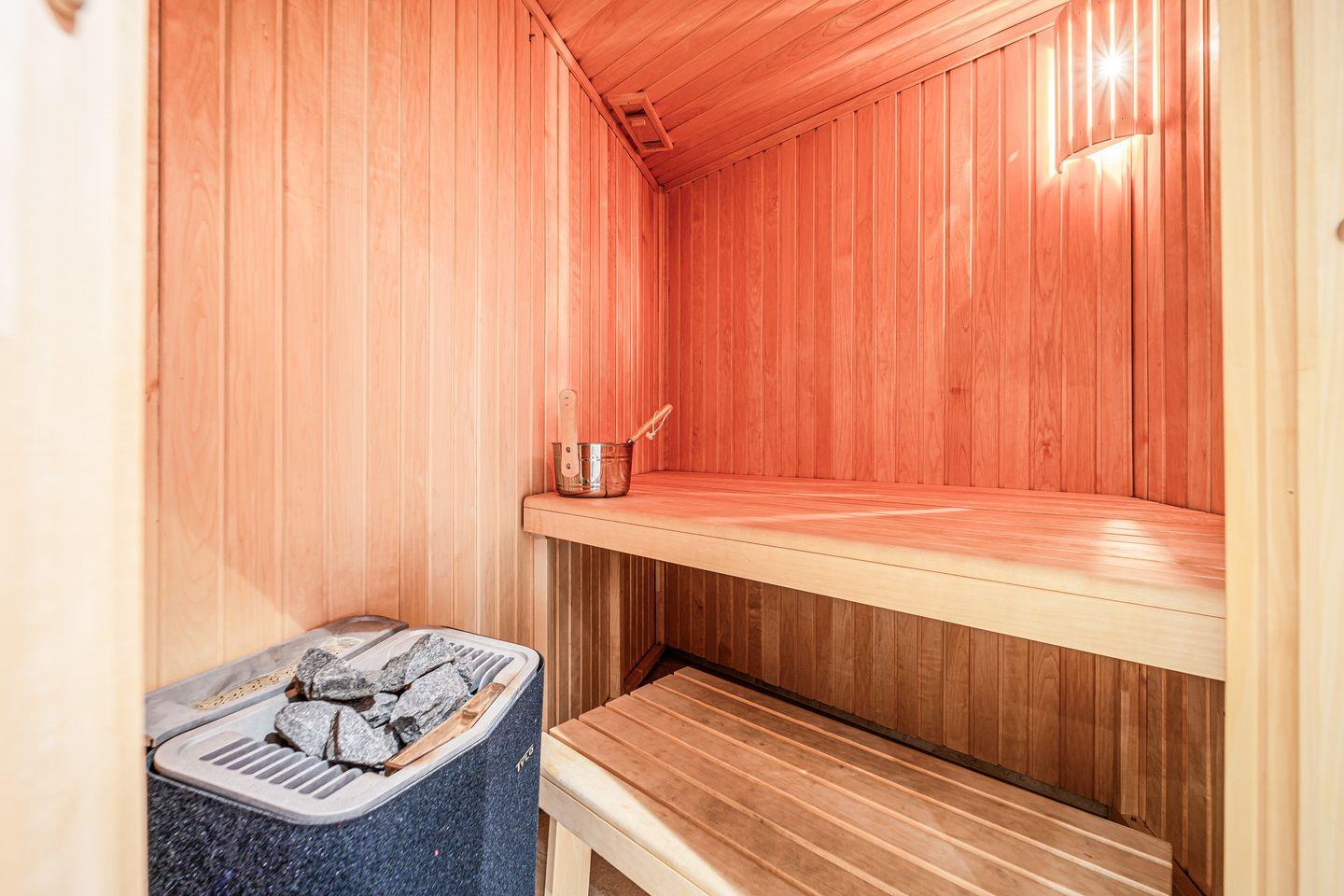 Ein Highlight ist Dein ganz persönlicher Wellnessbereich im Badezimmer: eine Sauna, eine Badewanne mit Whirlpool Funktion und ein Dampfbad mit integrierter Regendusche sorgen für pure Entspannung.