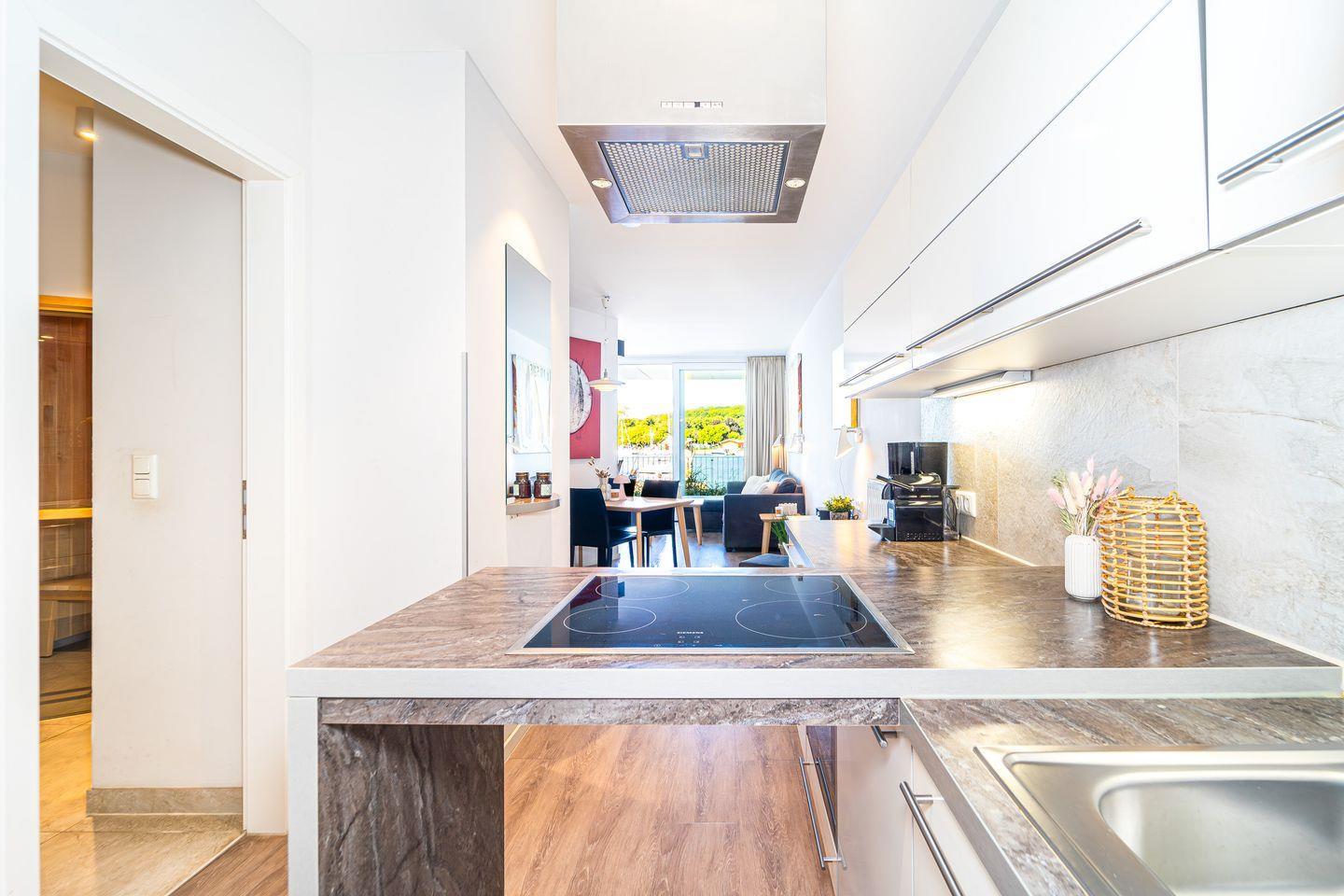 Die offene Küche ist bestens ausgestattet mit 4-Platten-Herd, zusätzlichem Wok-Kochfeld, Backofen, Kühlschrank mit Gefrierfach, Geschirrspüler, Mikrowelle, Toaster, Wasserkocher, Kaffeemaschine und Nespresso-Maschine. Natürlich stehen Dir ausreichend Geschirr, Besteck und Kochutensilien zur Verfügung, sodass Du Dich ganz nach Deinen Wünschen selbst versorgen kannst.