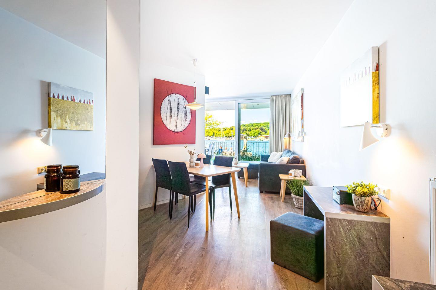 Der Wohnbereich ist hochwertig eingerichtet mit einem Sofa, HiFi-Anlage, Blu-ray-Player und zwei Flachbild-TVs. Ein besonderes Highlight ist der Bioethanolkamin, der abends für eine warme und behagliche Atmosphäre sorgt. Das Sofa lässt sich bei Bedarf in zwei bequeme Schlafplätze verwandeln. Durch die großen Fenster kannst Du jederzeit den traumhaften Panoramablick über den Segelhafen, die Travemündung, das Museumsschiff „Passat“ und die vorbeiziehenden Skandinavienfähren genießen.