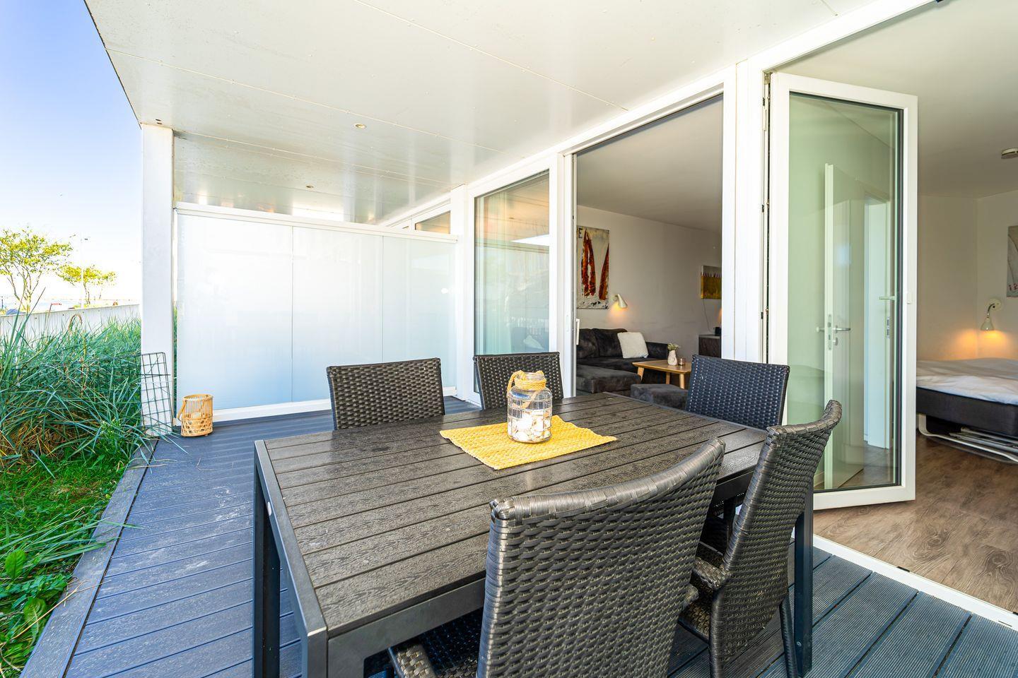 Die überdachte Terrasse mit Gartenmöbeln ist der perfekte Ort, um die frische Seeluft zu genießen und den beeindruckenden Meer- und Strandblick auf Dich wirken zu lassen.