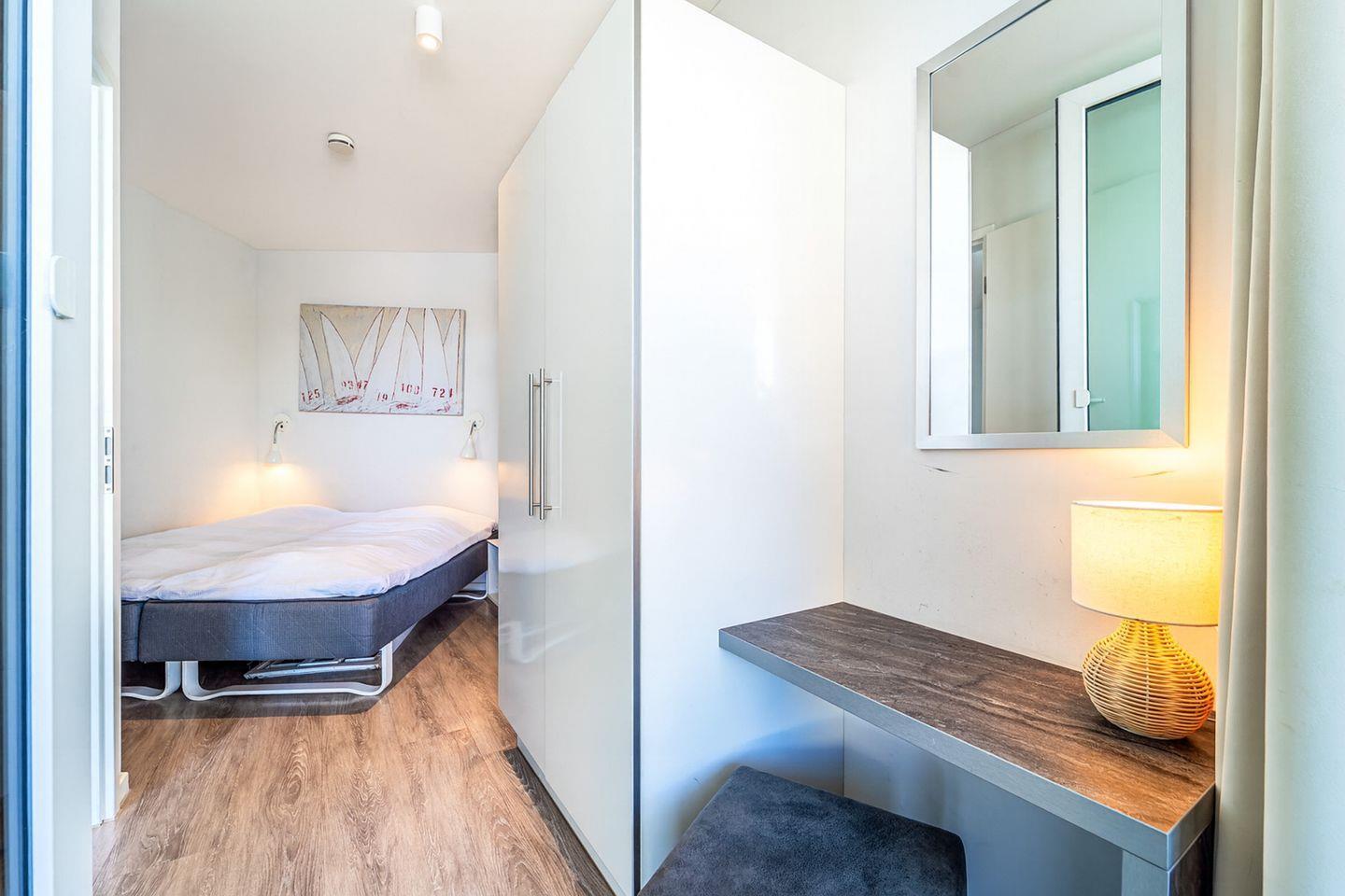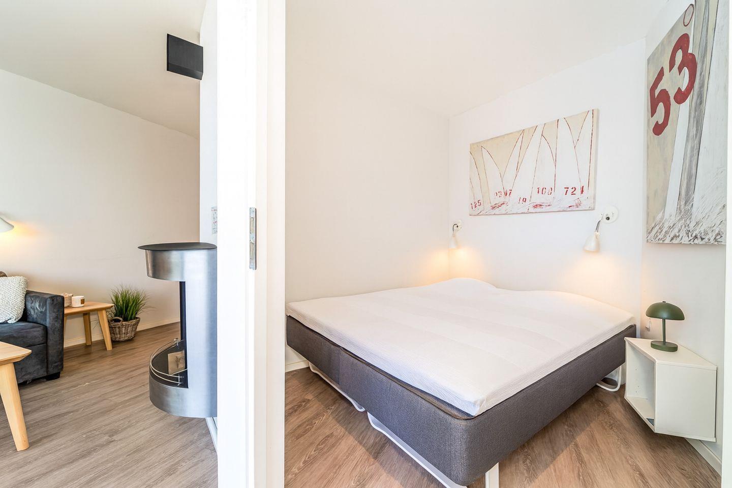 Das Schlafzimmer bietet ein komfortables Doppelbett sowie ausreichend Stauraum. Von hier aus hast Du ebenfalls einen wunderbaren Blick aufs Wasser – und dank einer eigenen Terrassentür gelangst Du direkt ins Freie. So kannst Du morgens die frische Meeresluft genießen oder den Abend entspannt mit Aussicht ausklingen lassen.
