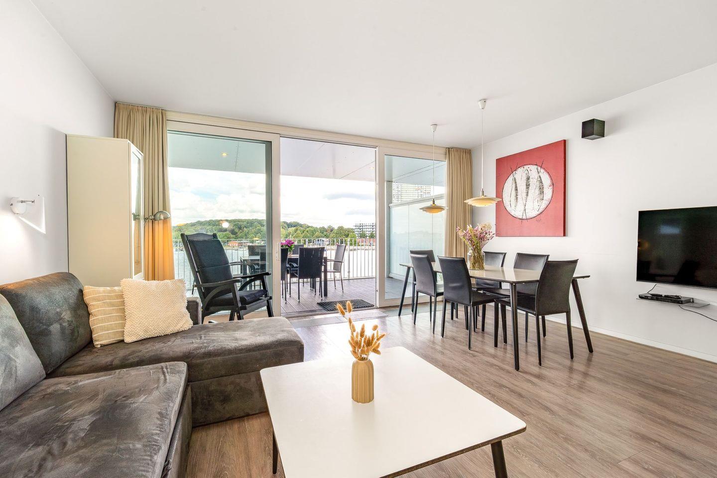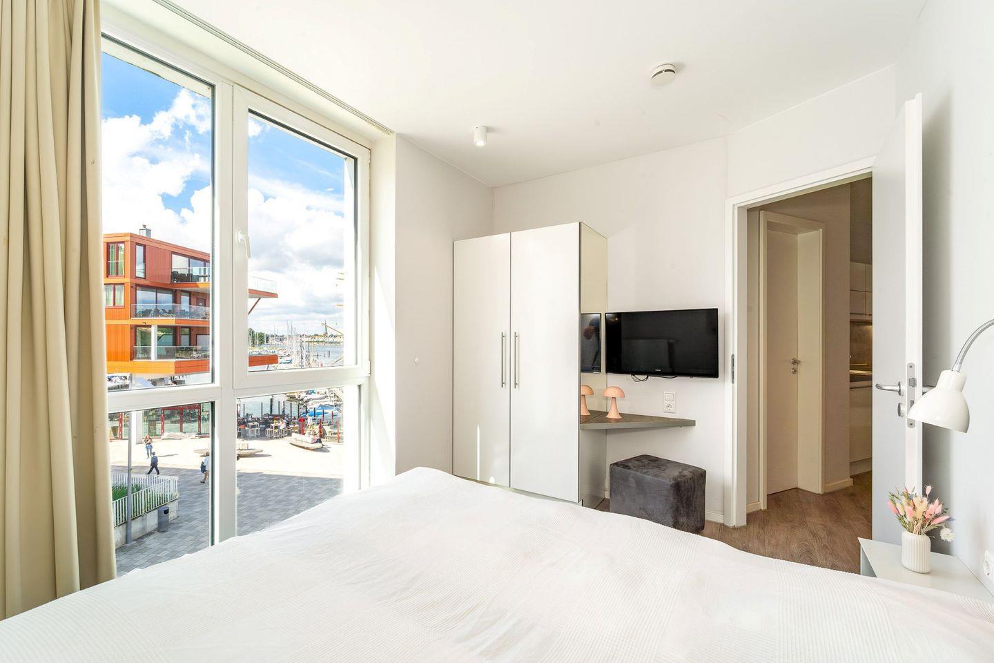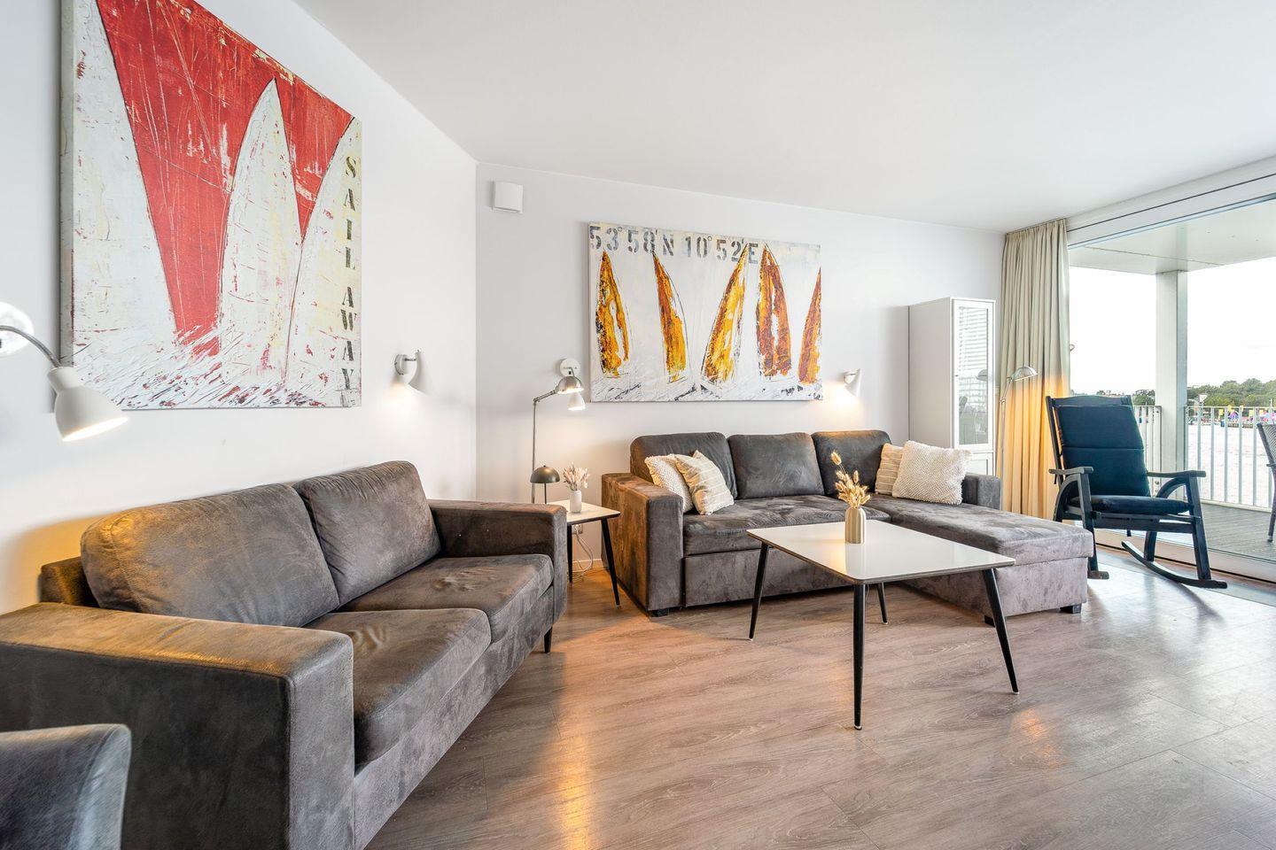 Der stilvolle Wohnbereich ist mit Sofa, Sesseln, HiFi-Anlage, Blu-ray-Player, Radio und zwei Flachbild-TVs ausgestattet. Für besondere Gemütlichkeit sorgt der Bioethanolkamin, der den Raum in stimmungsvolles Licht taucht. Durch die Panoramafenster und vom Sofa aus genießt Du einen einzigartigen Blick auf den Segelhafen, die Travemündung, das Museumsschiff „Passat“ und die vorbeiziehenden Skandinavienfähren.