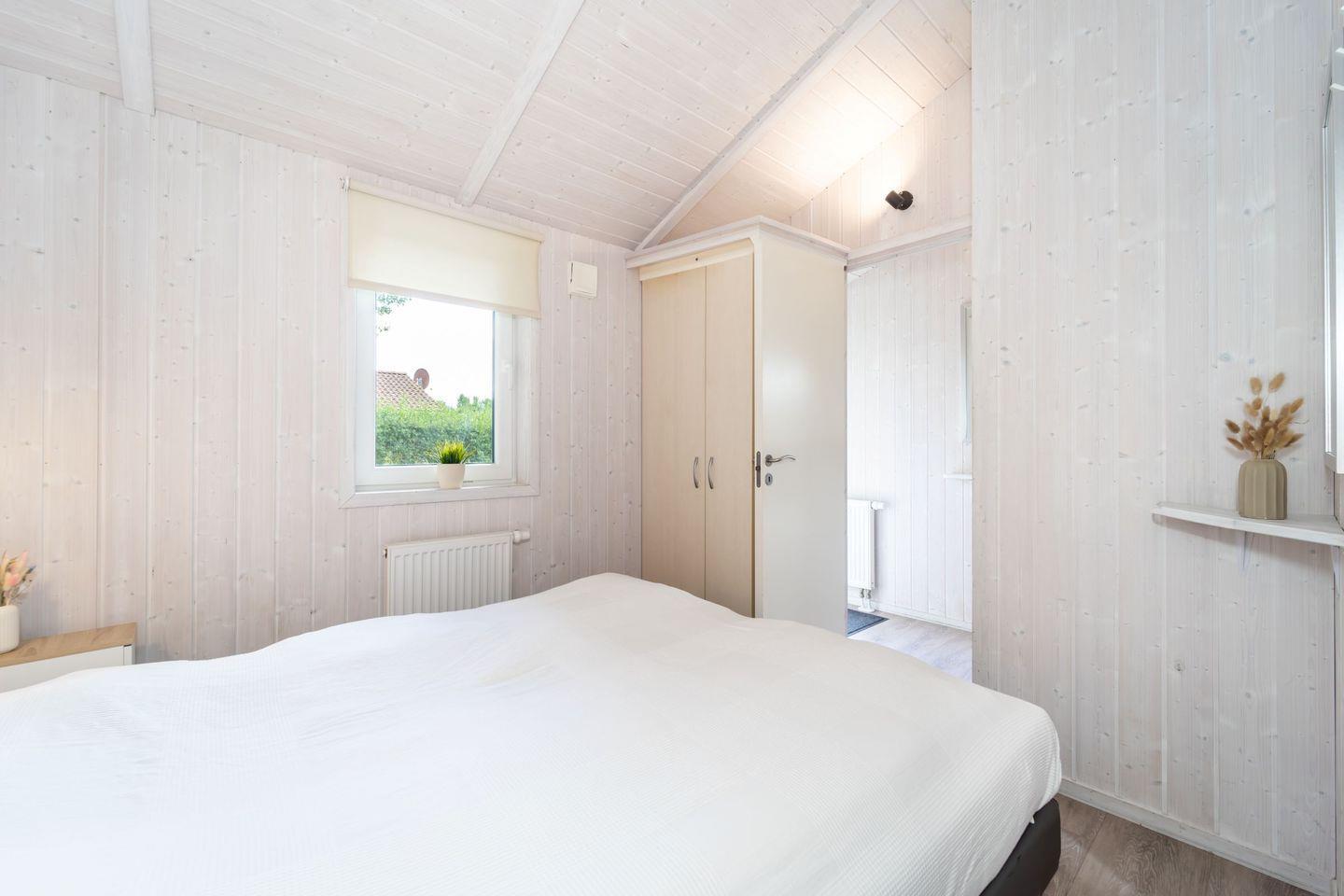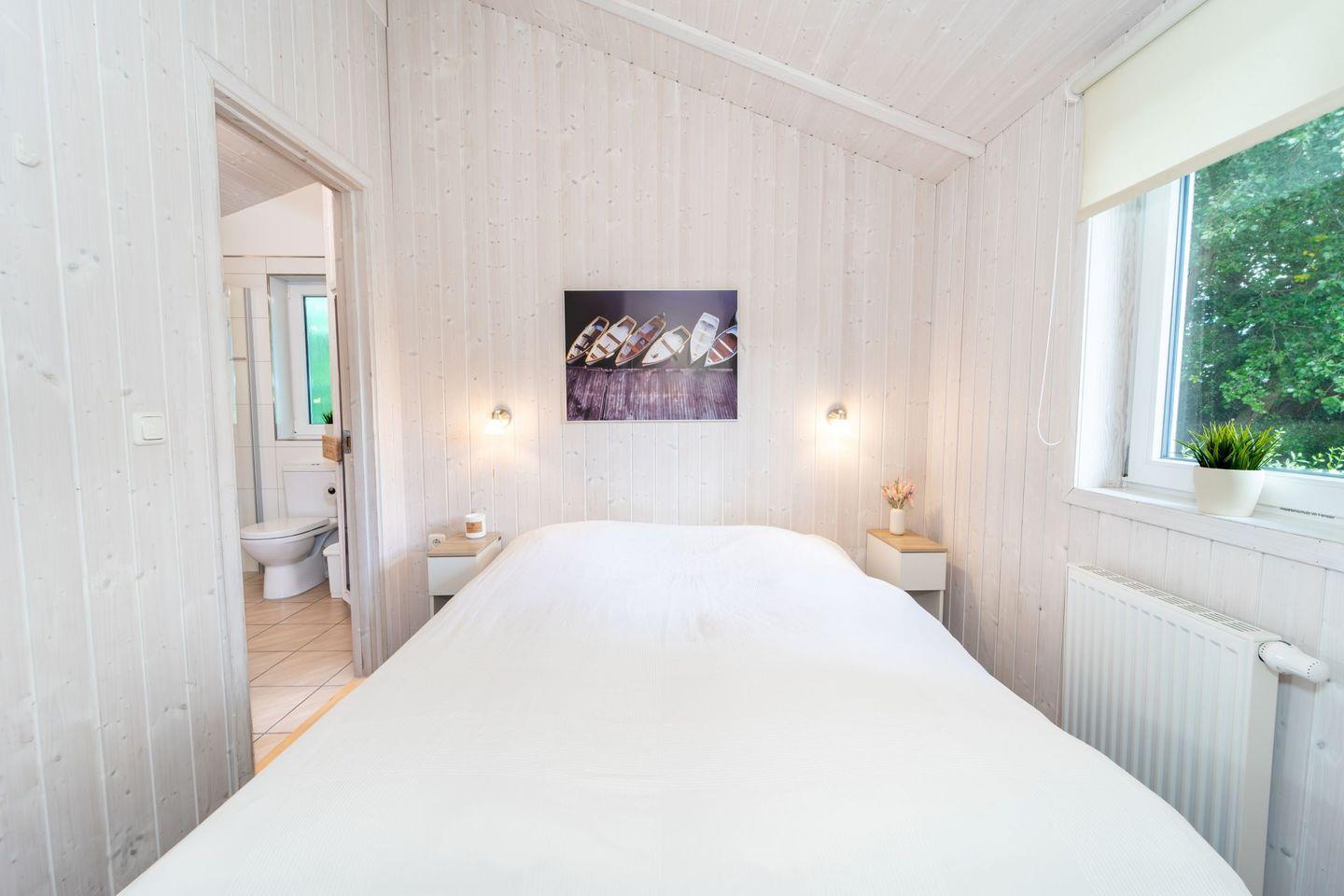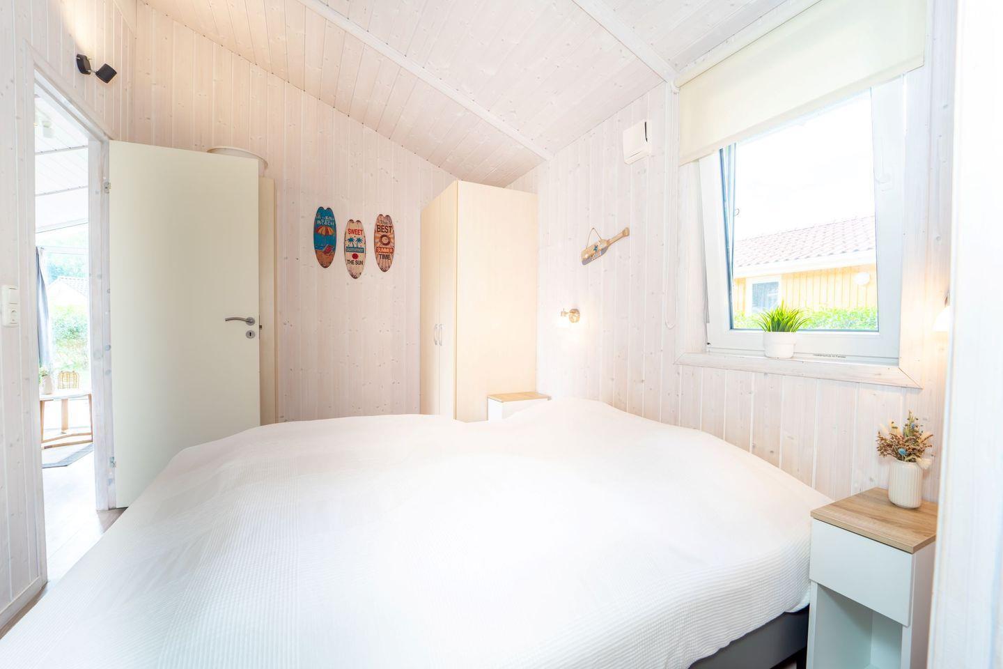 Es gibt zwei Schlafzimmer jeweils mit einem Doppelbett. Pflegeleichte Vinylböden schaffen eine freundliche Atmosphäre.