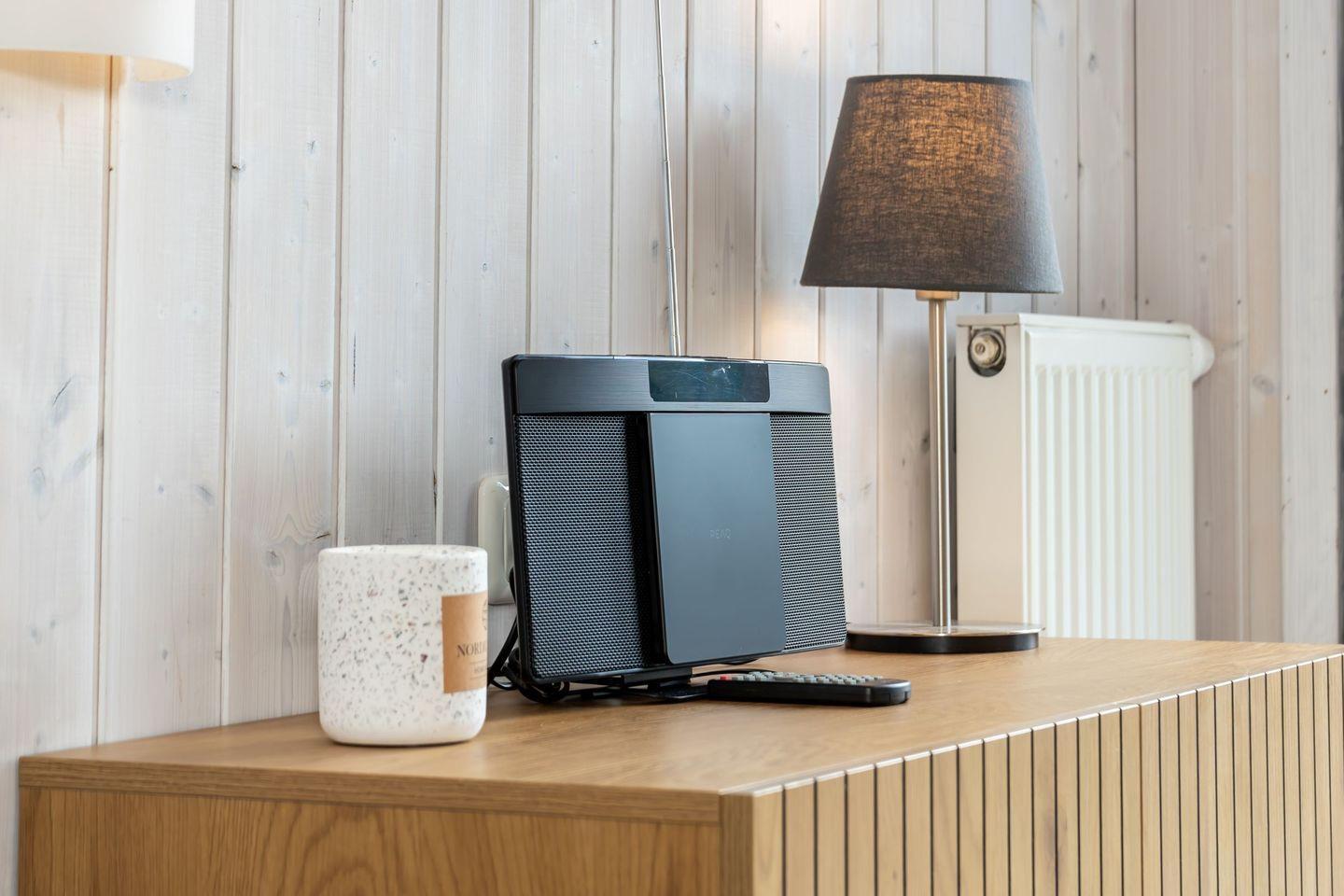 Der offene Wohn- und Essbereich ist ausgestattet mit Sofa, Sessel und Esstisch. Für Unterhaltung sorgen ein TV mit Satellitenanschluss, Radio und HiFi-Anlage. Besonders heimelig wird es durch den Bioethanolofen, der für eine warme Atmosphäre sorgt.